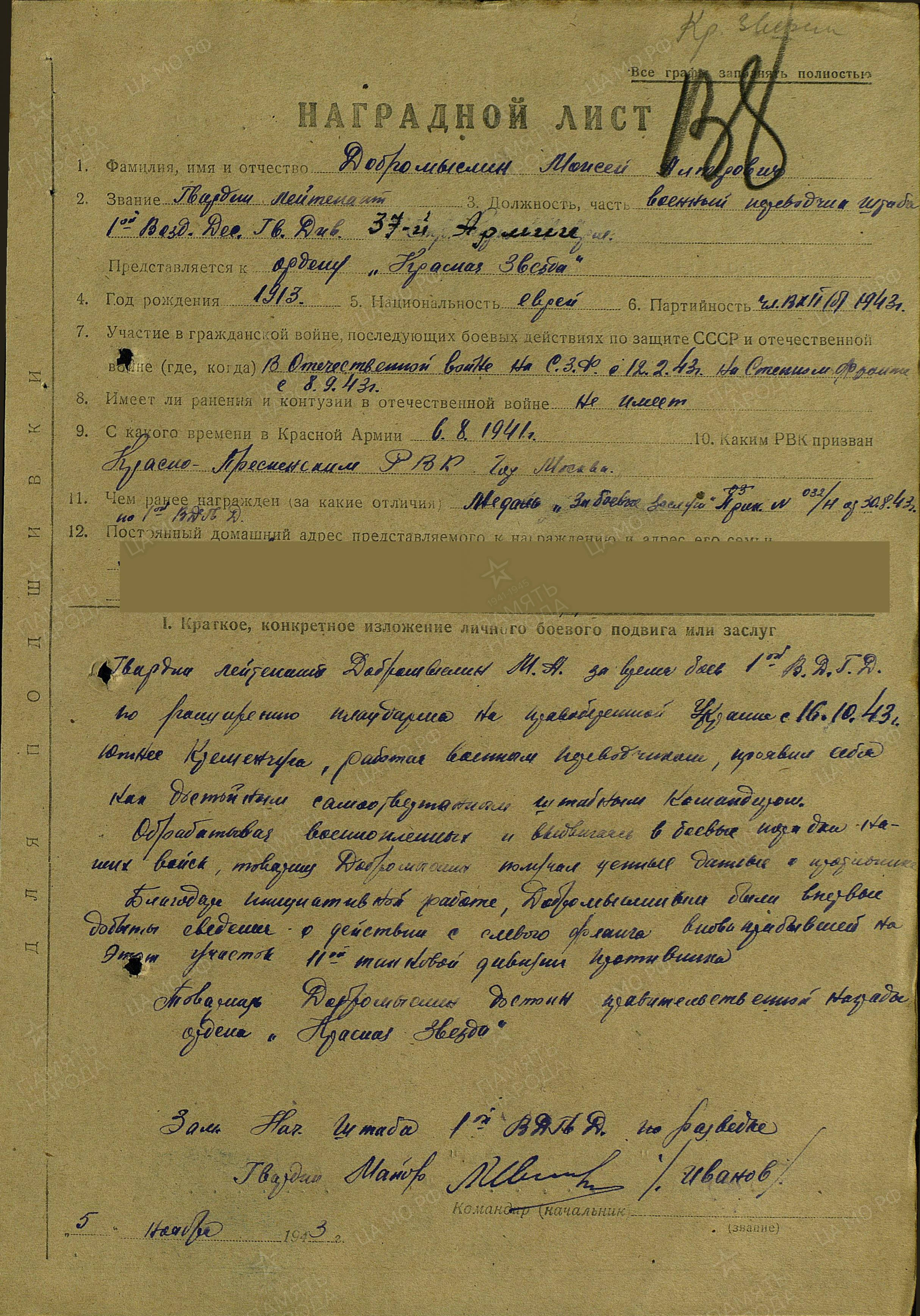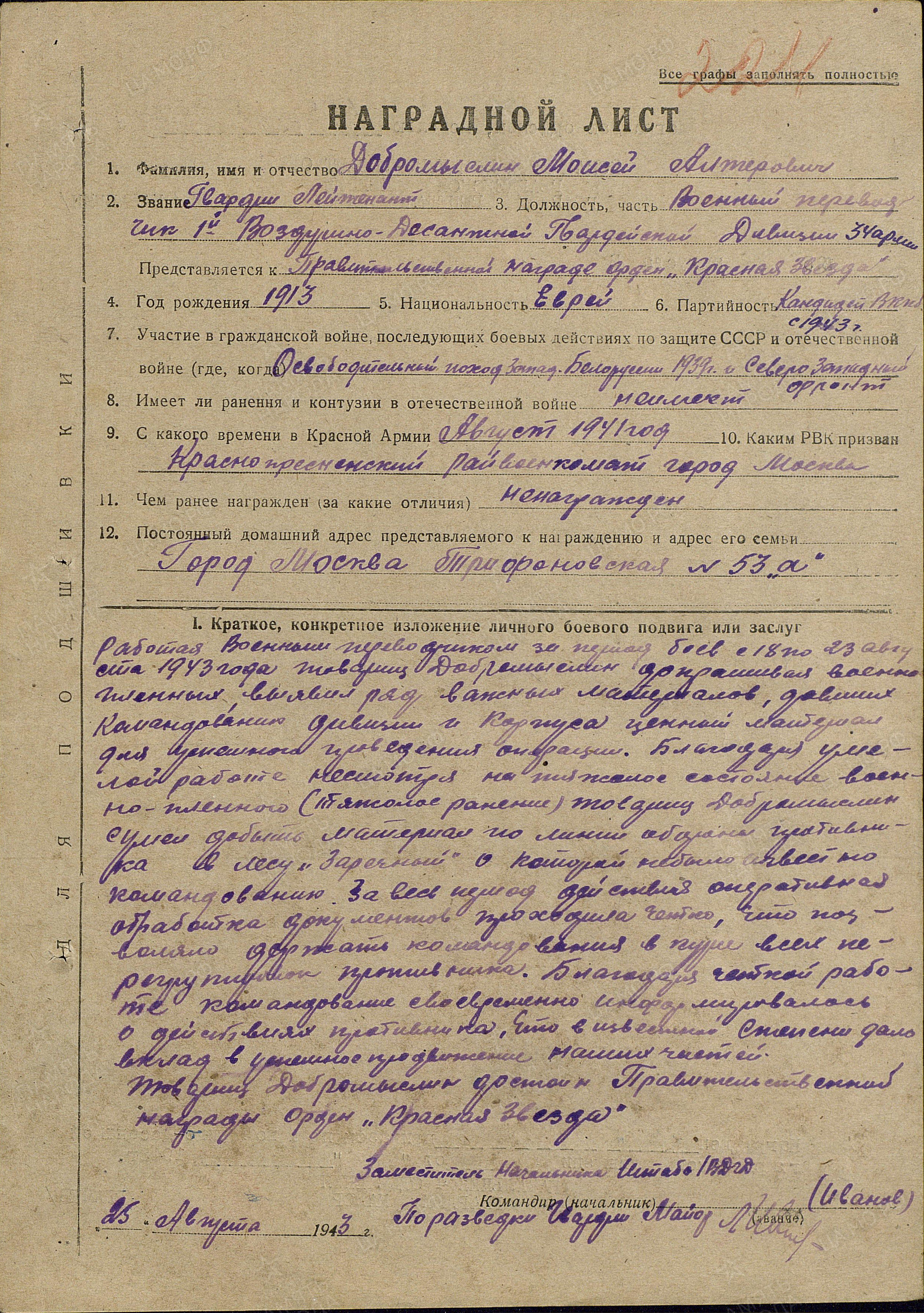 В Красную армию призван 06.08.1941 г. Красно-Пресненским РВК г. Москва.