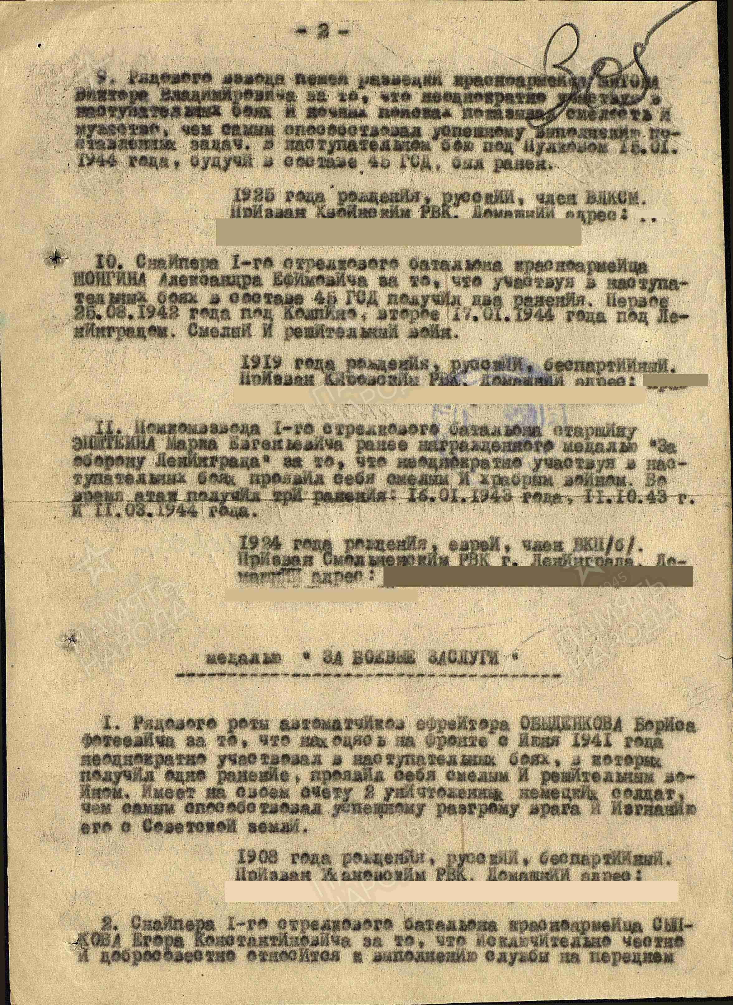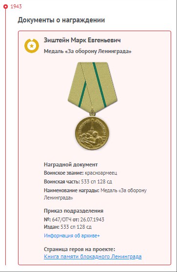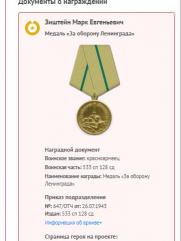 награжденного медалью «За оборону Ленинграда» за то, что неоднократно участвуя в