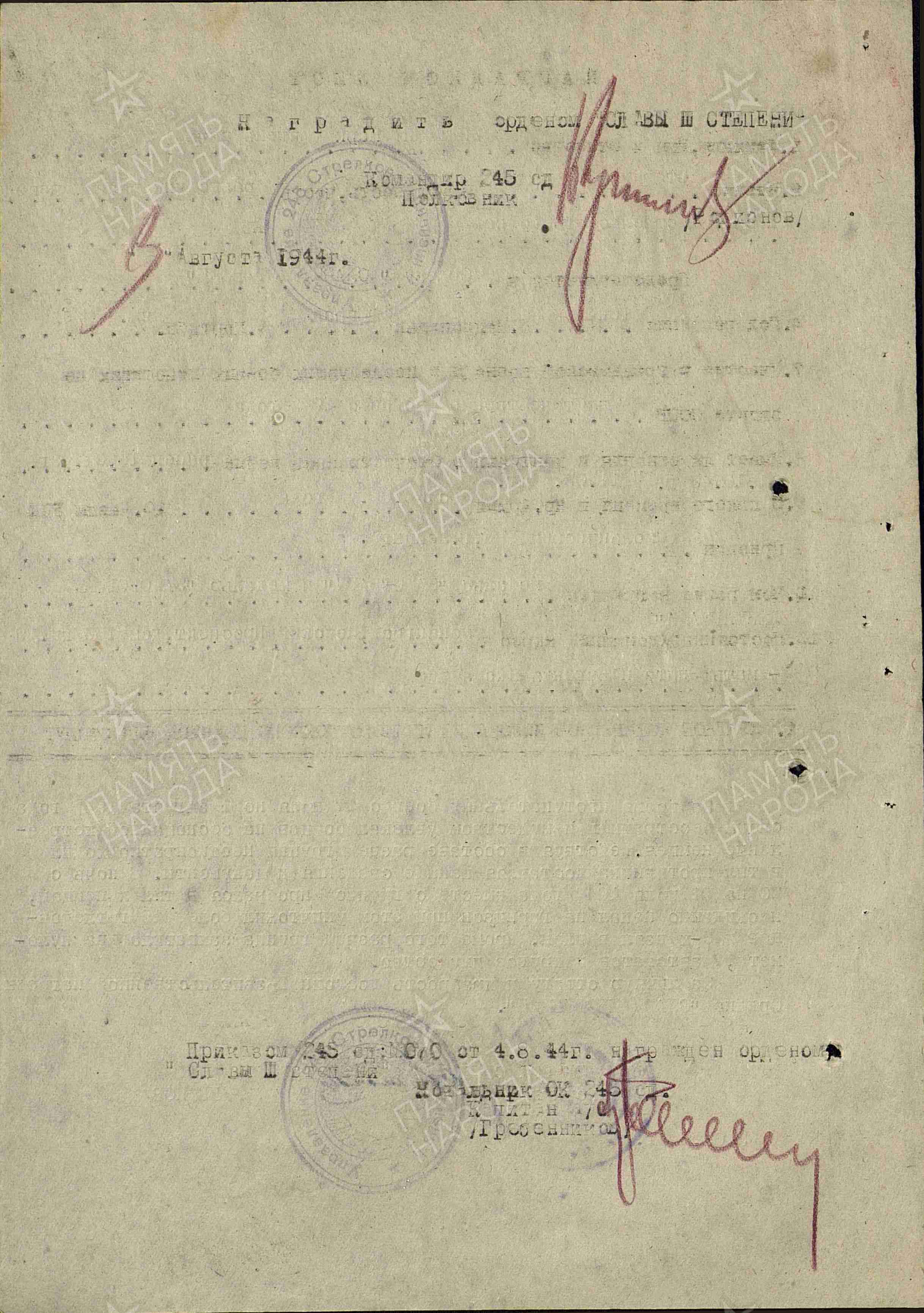 наступающих боях, проявил себя смелым и храбрым воином. Во время атак получил три ранения: