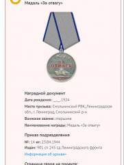 Медали: "ЗА ОТВАГУ", "ЗА ОБОРОНУ ЛЕНИНГРАДА", "ЗА ПОБЕДУ НАД ГЕРМАНИЕЙ В ВЕЛИКОЙ ОТЕЧЕСТВЕННОЙ ВОЙНЕ 1941 - 1945 ГГ." и другие.