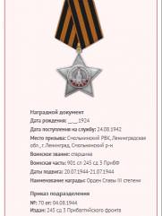 Ордена: "ОТЕЧЕСТВЕННОЙ ВОЙНЫ" 1 СТЕПЕНИ, "СЛАВЫ" 3 СТЕПЕНИ.