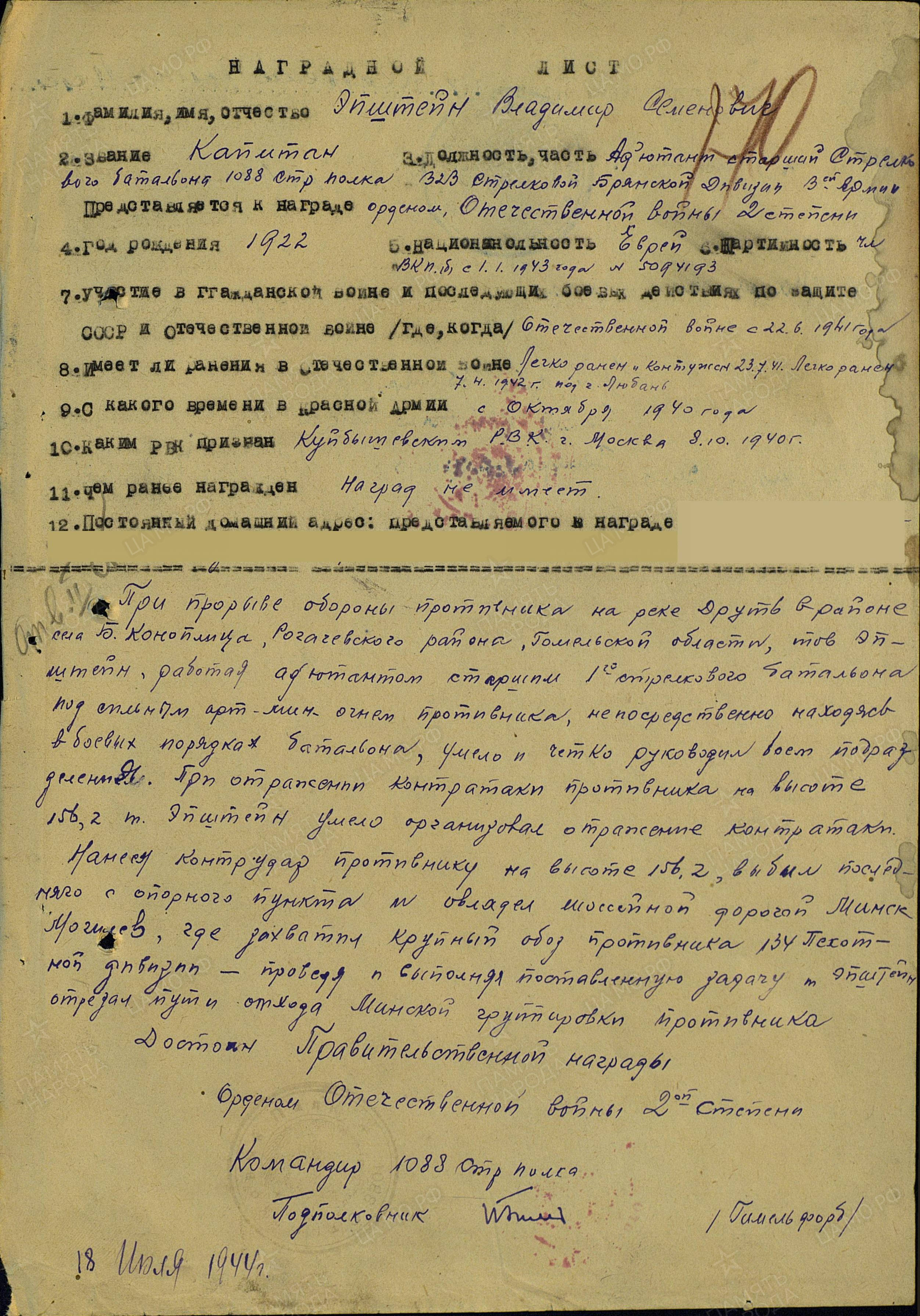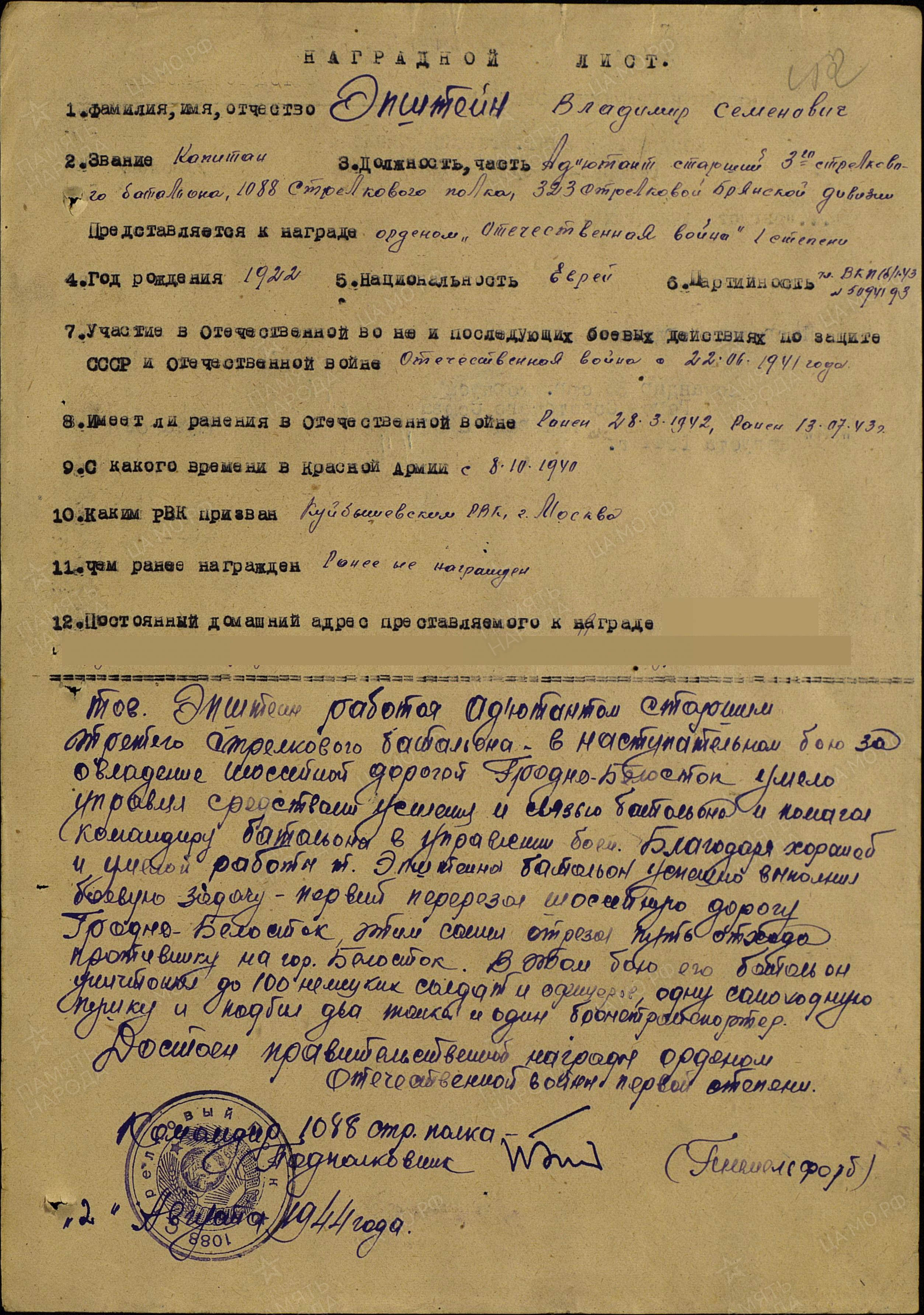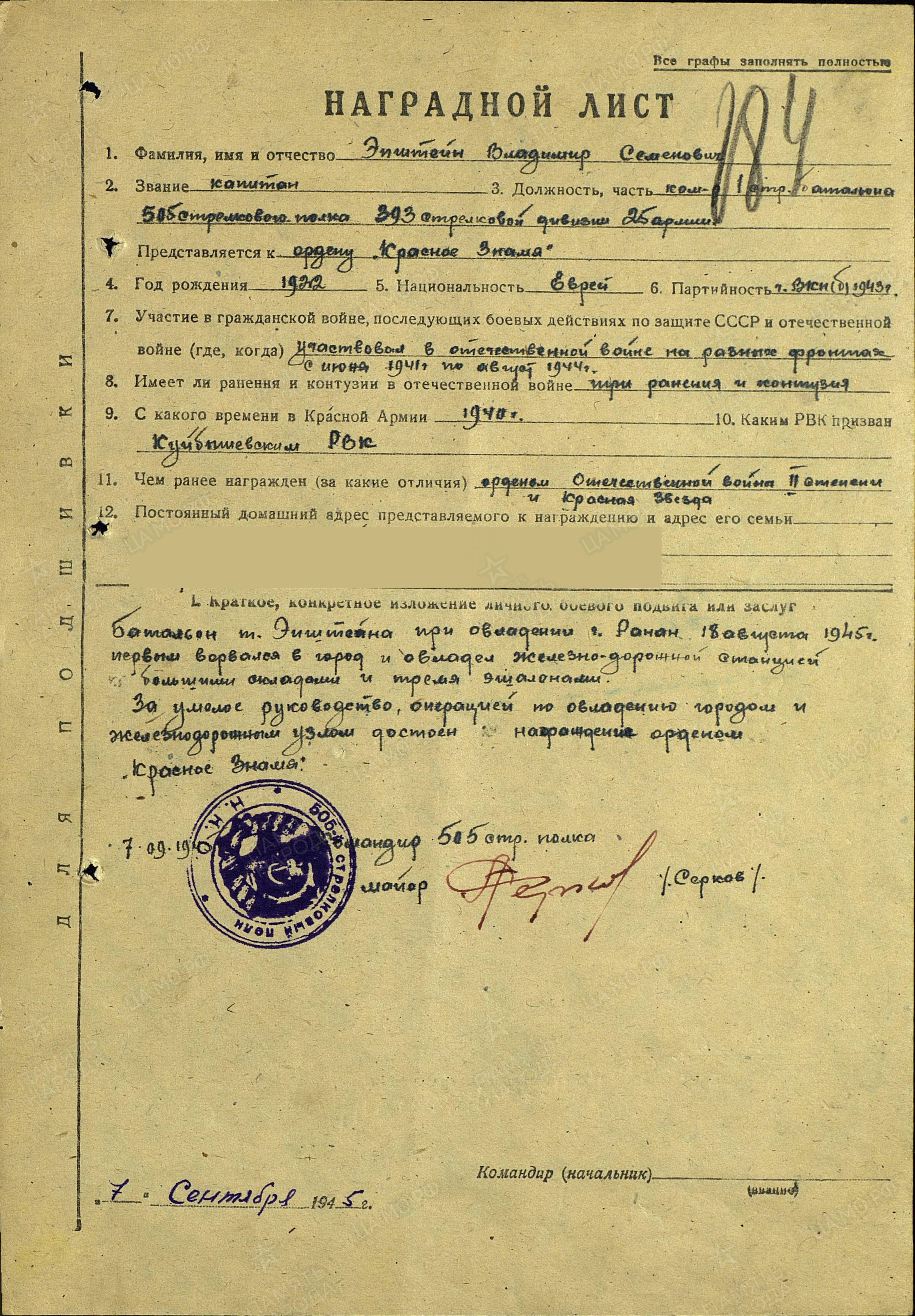 Из наградного листа на капитана Эпштейна Владимира Семеновича: