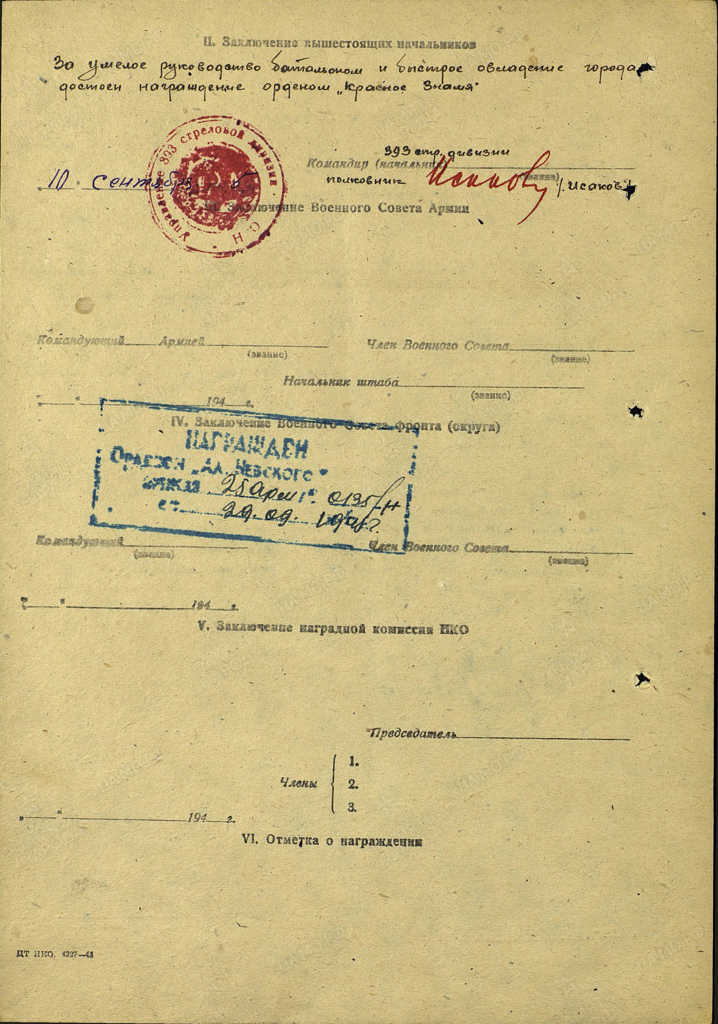 За умелое руководство батальоном и быстрое овладение городом достоин награждения