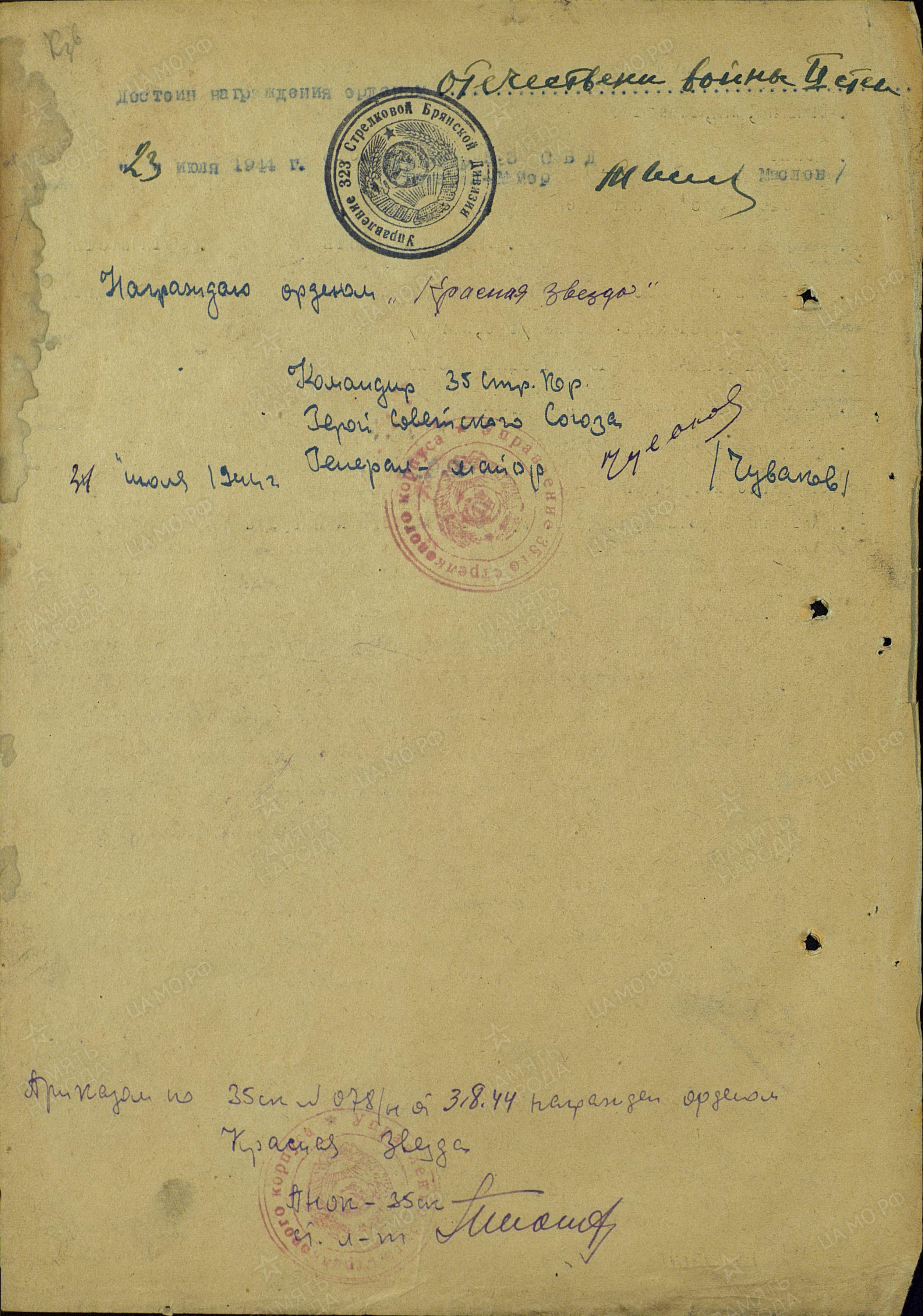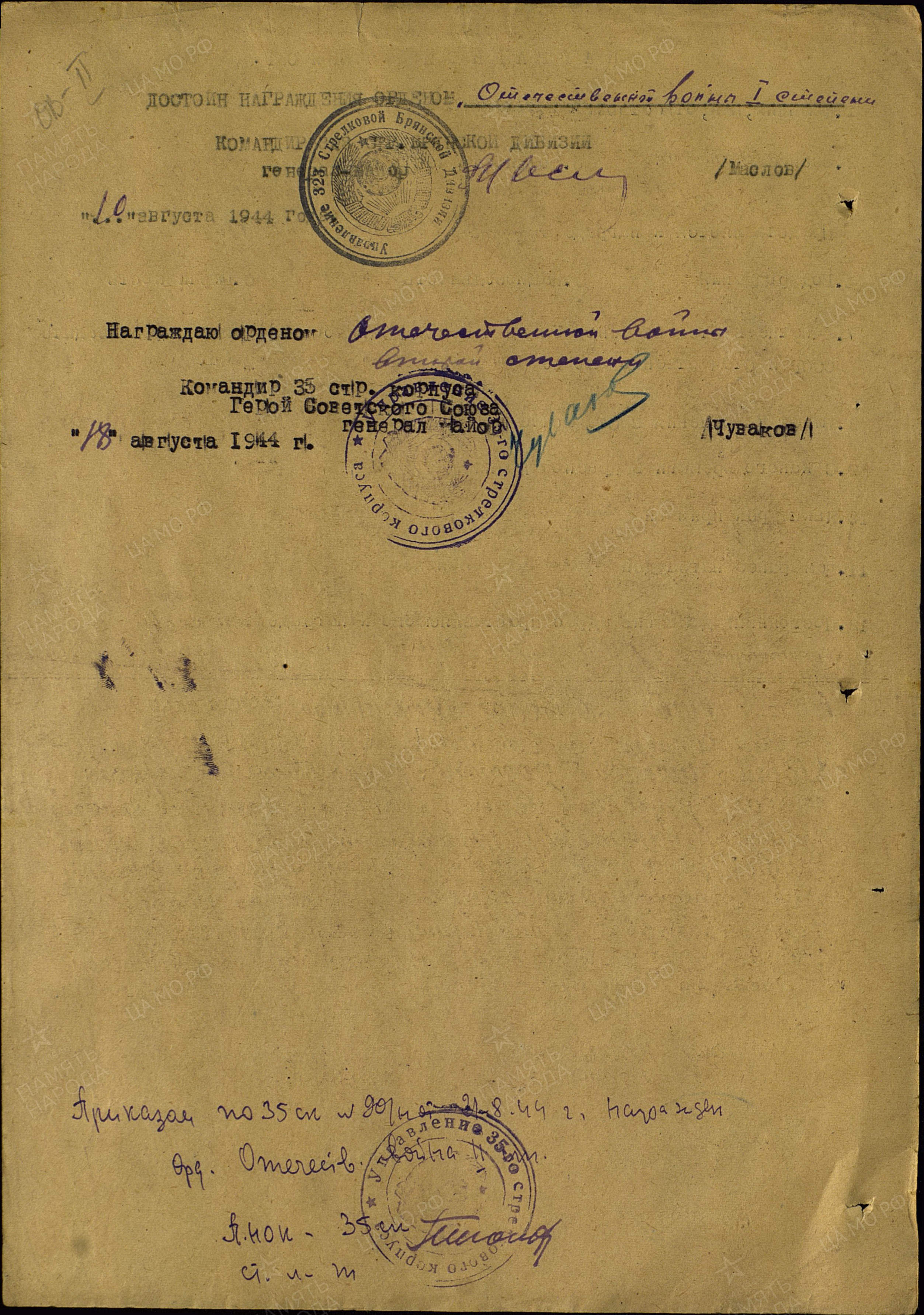 Достоин правительственной награды орденом Отечественной войны 1 степени.