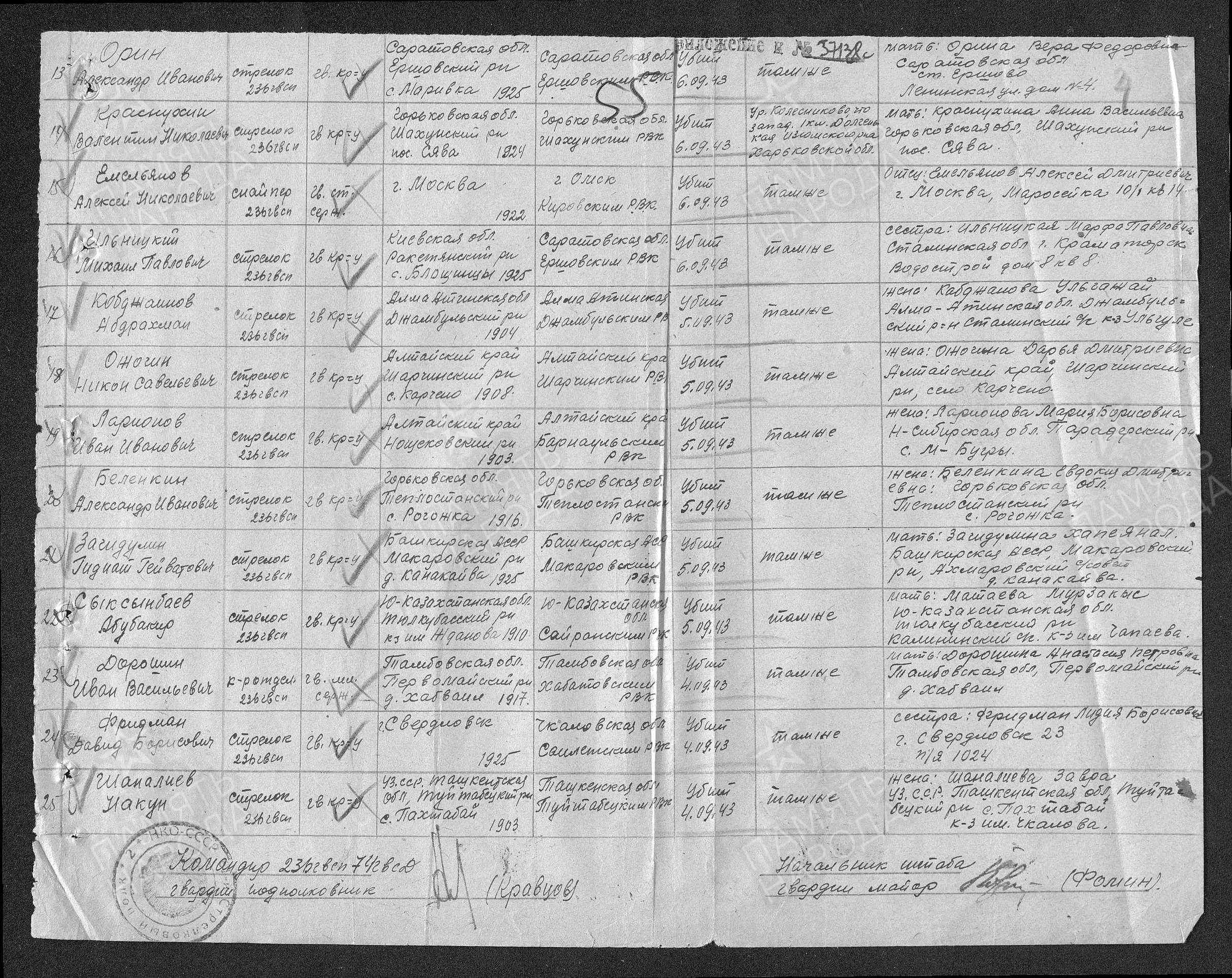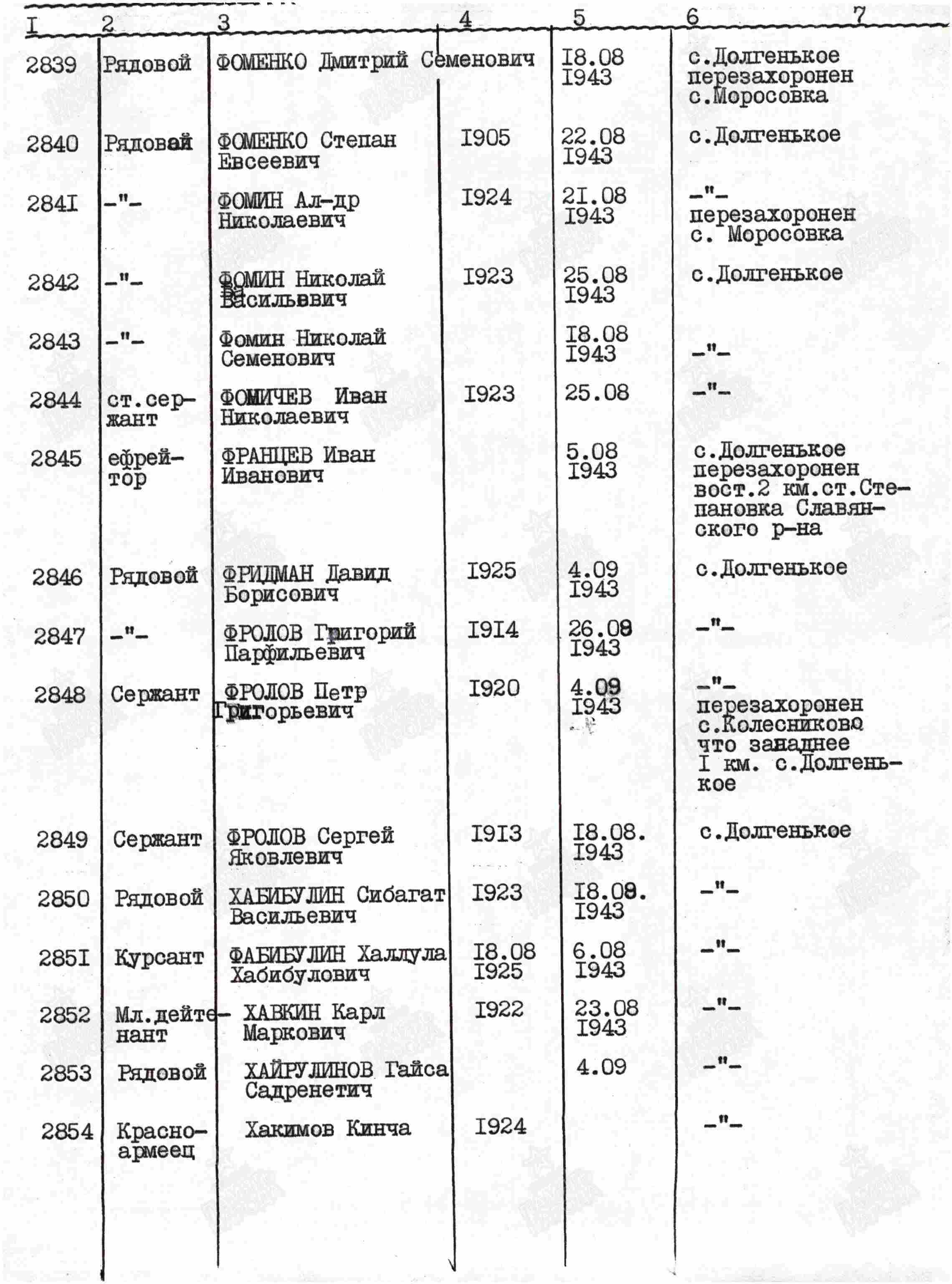Приложение: Рядовой ФРИДМАН ДАВИД БОРИСОВИЧ, 4.09.1943 года, убит, в бою. Захоронен (в настоящее время): Украина, Харьковская область, Изюмский район, Долгеньковский сельский совет, село Долгенькое (центр), братское воинское захоронение.