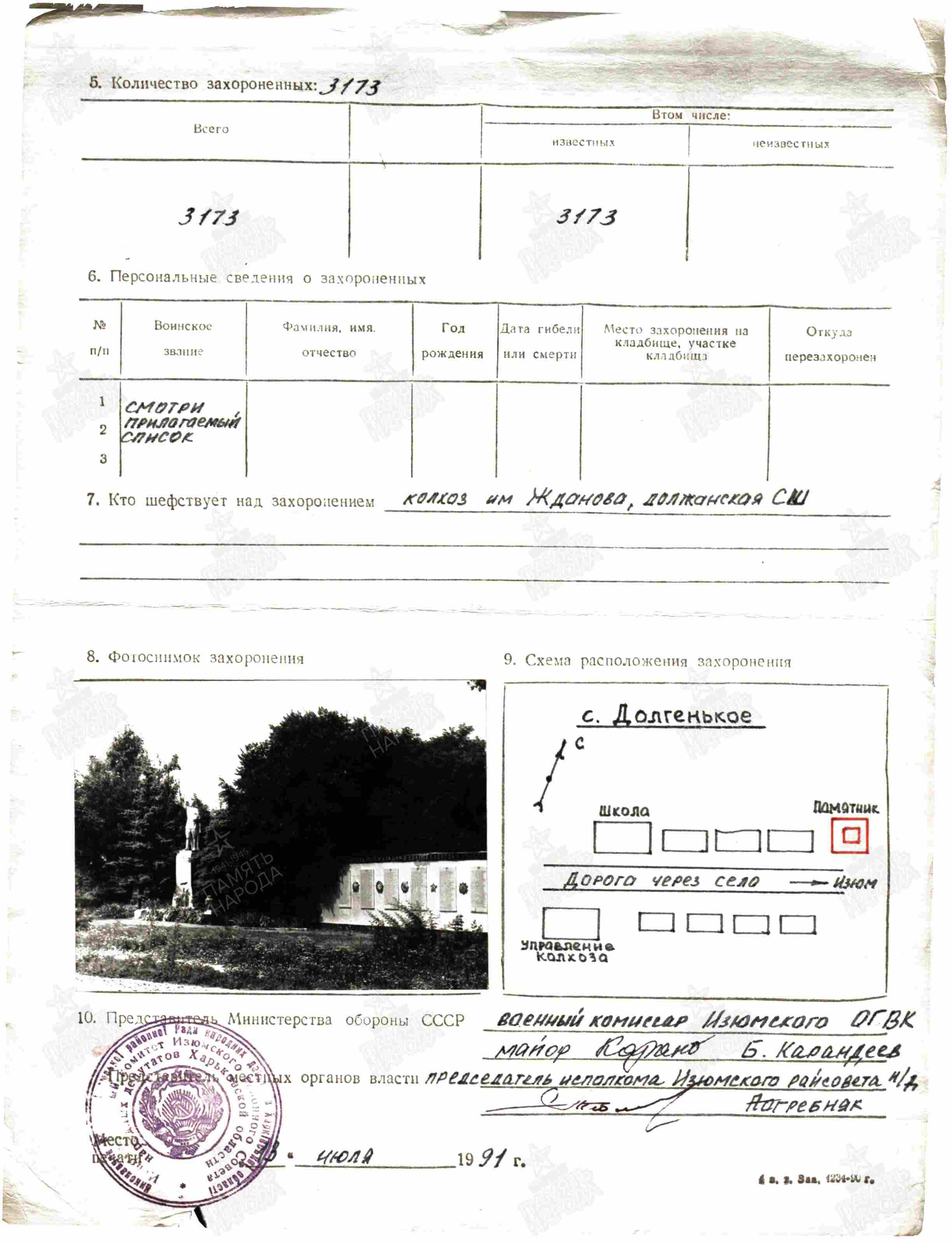2. Захоронение: Украина, Харьковская область, Изюмский район, Долгеньковский сельский совет, село Долгенькое (центр), братское воинское захоронение ("Книга Памяти Украины": https://memory-book.ua/gallery/albums/23060?image=1 ).