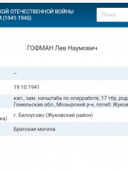 Капитан ГОФМАН ЛЕВ НАУМОВИЧ, 1911 года рождения, место рождения - Российская Империя, Минская губерния, Мозырьский уезд, деревня Редки ( в административному делению СССР: Белорусская ССР, Полесская область, Мозырский район, дереня Редки), еврей. Кадровый офицер - танкист. В Великой Отечественной войне с1941 года (на Западном фронте), в должности (последняя): Заместителя начальника штаба по оперативной работе 17 танковой бригады, 16 армии. Ранения: нет. Боевые награды: нет. С Великой Отечественной войны не вернулся: 18.10.1941 года, убит в бою, в районе г. Медынь, г. Юхнов (Калужской области). Извещение: жена - Гофман И.П. Захоронен: РОССИЯ, Калужская область, Жуковский район, г. Белоусово, братская могила. Вечная Слава и Память!