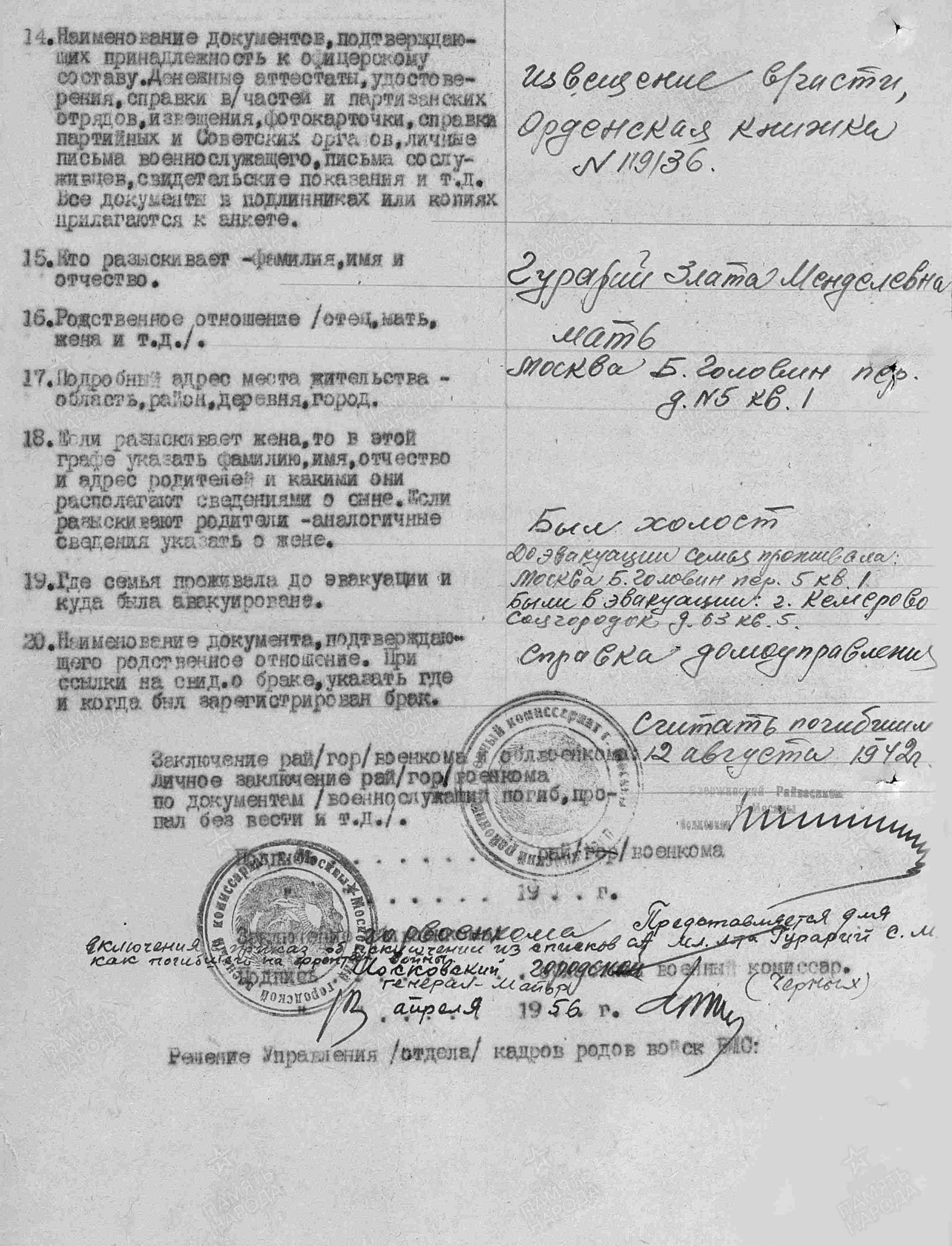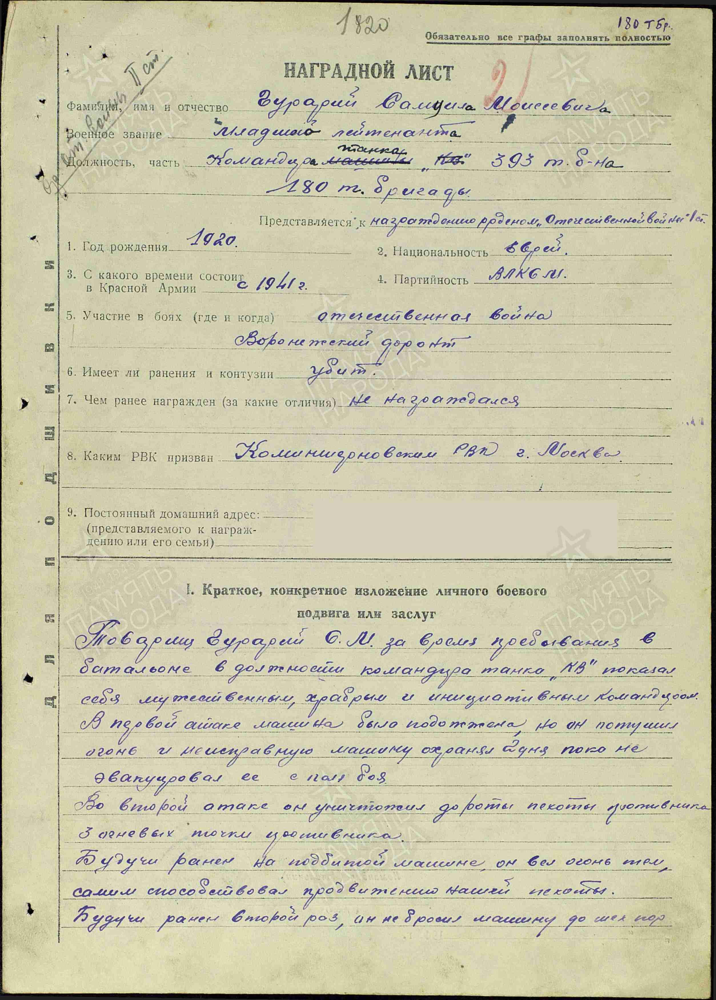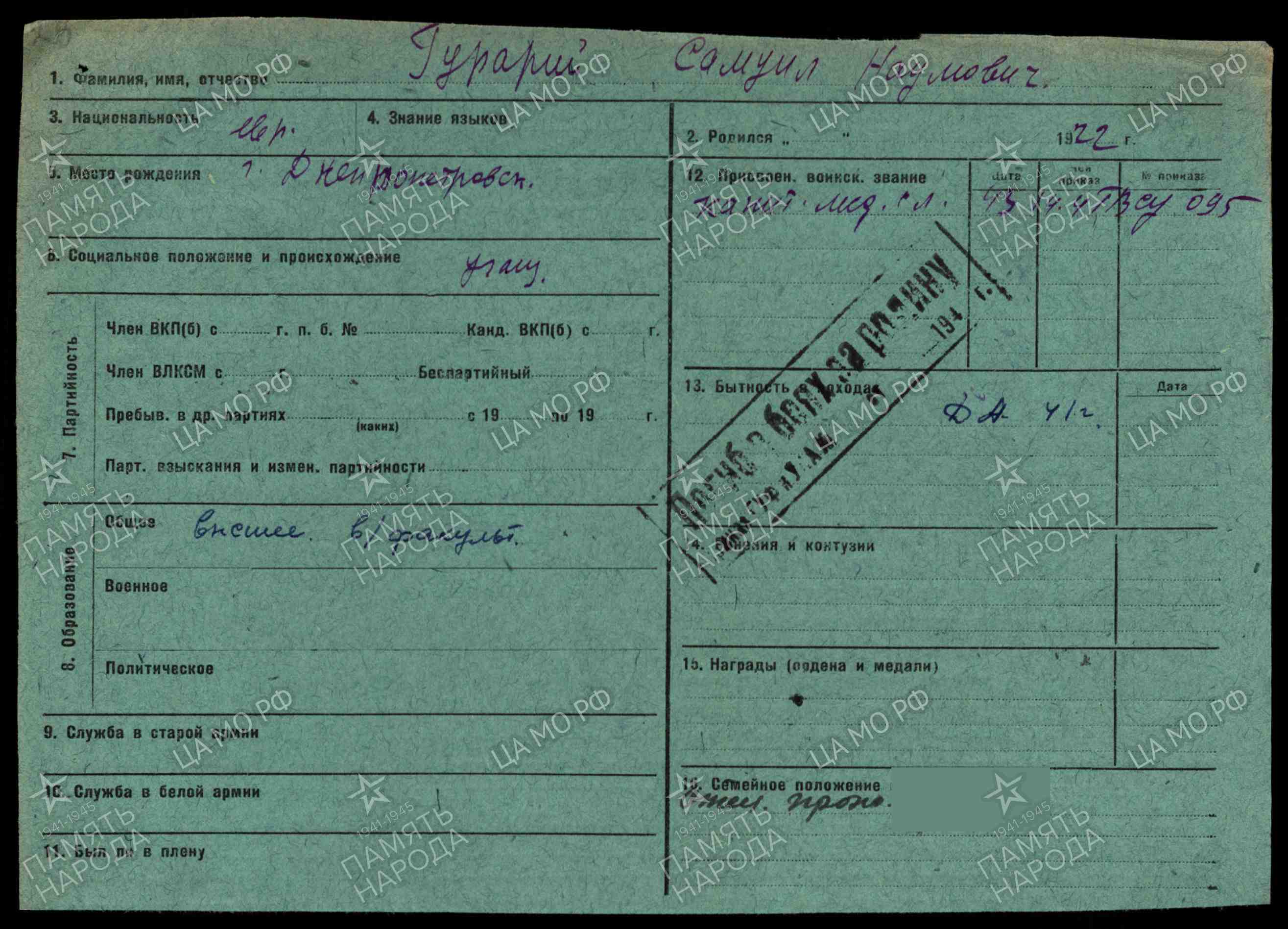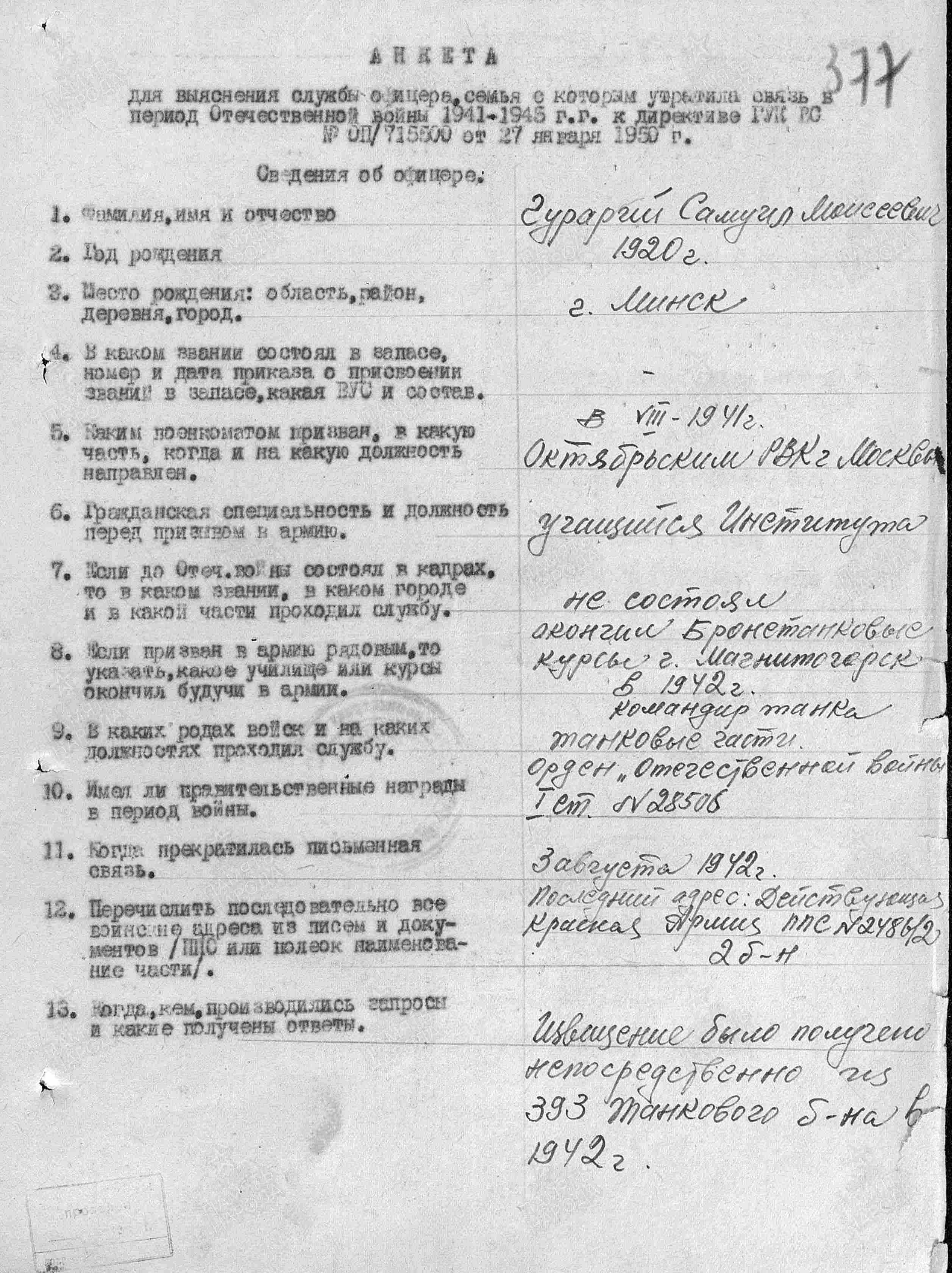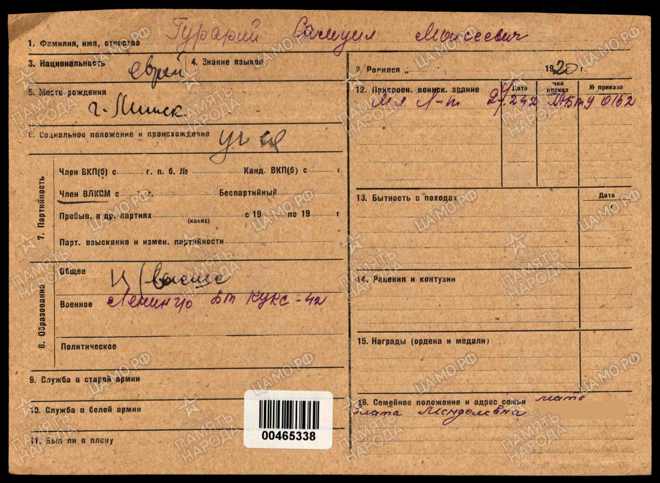 Гурарий Самуил Моисеевич родился в Минске в 1920 году. Еврей. До войны студент ВУЗа в Москве.