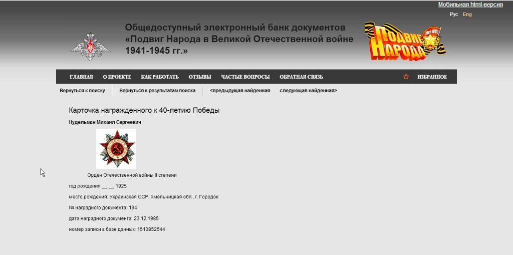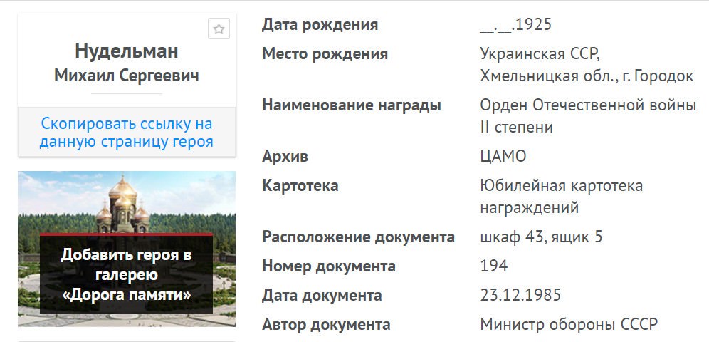 Нудельман Мойше Саневич (после войны Михаил Сергеевич), родился 28 февраля 1920 года в местечке Городок Каменец-Подольской(Хмельницкой) области. Его мать – Бунця,отец Саня Нудельман. После окончании школы был призван в армию. Война застала его на службе.Воевал в различных в частях,в том числе в отдельном батальоне морской пехоты Черноморского флота.Принимал участие в боевых действиях Красной армии на Северо-Кавказском фронте. В 1943 году получил тяжелое ранение в бедро и ногу. Продолжительное время находился на лечении в госпитале. В 1944 году комиссован и демобилизован из армии как инвалид войны. В конце 1944 года вернулся в родной Городок. В 1947 году женился на Рахель Маламуд,отец двоих детей. В сентябре 1966 года семья переехала на постоянное место жительство в город Запорожье. Работал на предприятиях потребительской кооперации. В 1994 году репатриировался в Израиль в город Ришон-Лецион. В Израиле признан инвалидом Второй Мировой войны. Умер 5 августа 2012года.