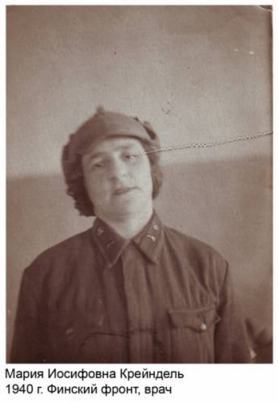 Крейндель Мария Иосифовна родилася в 1909 году в Белорусская ССР, Могилевская обл., Дрибинский р-н, с. Рясна. Еврейка.