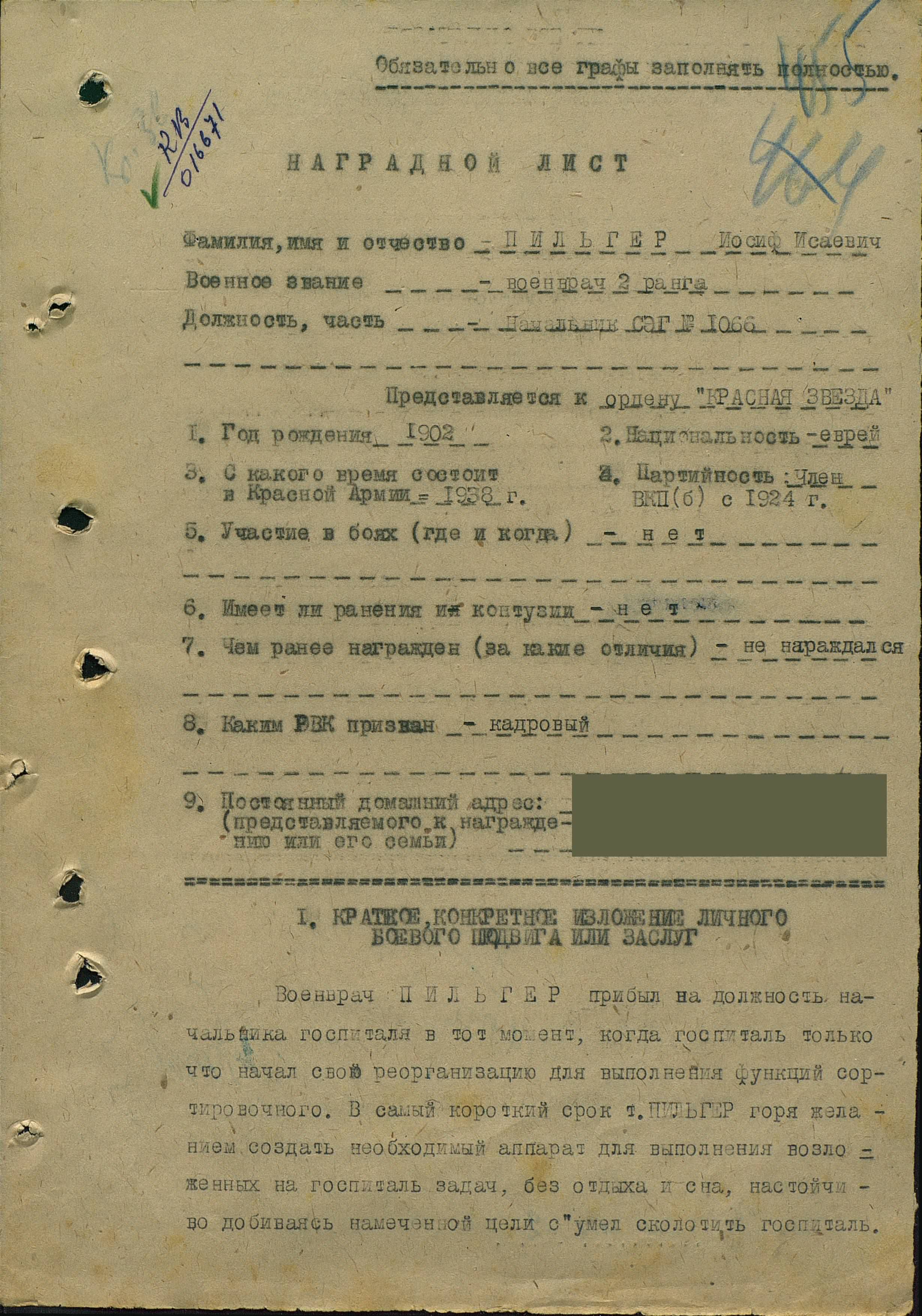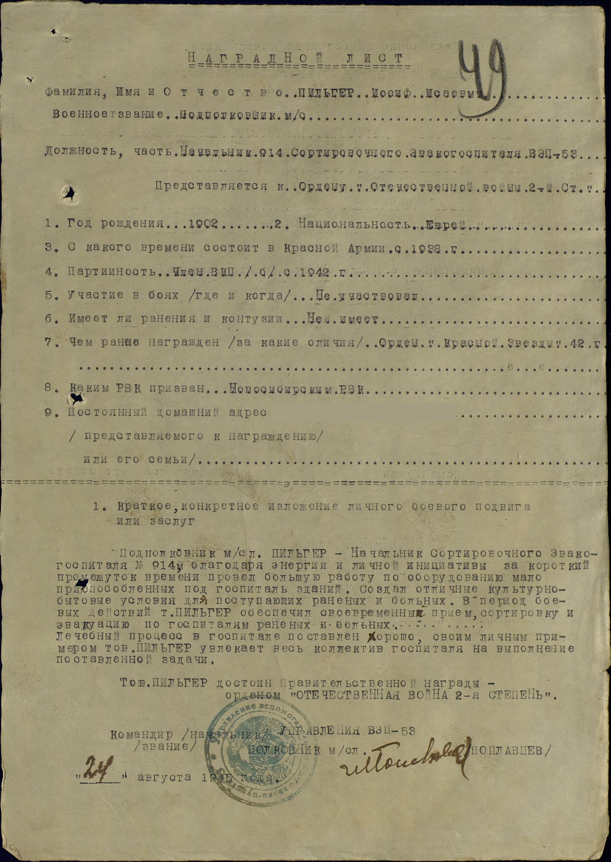 3. Служба подполковника медицинской службы ПИЛЬГЕРА ИОСИФА ИСАЕВИЧА, на Дальневосточном фронте,подтверждается не написанным "на сайтах", а подтверждена докуметом — НАГРАДНЫМ ЛИСТОМ на орден «ОТЕЧЕСТВЕННАЯ ВОЙНА» 2 СТЕПЕНИ.