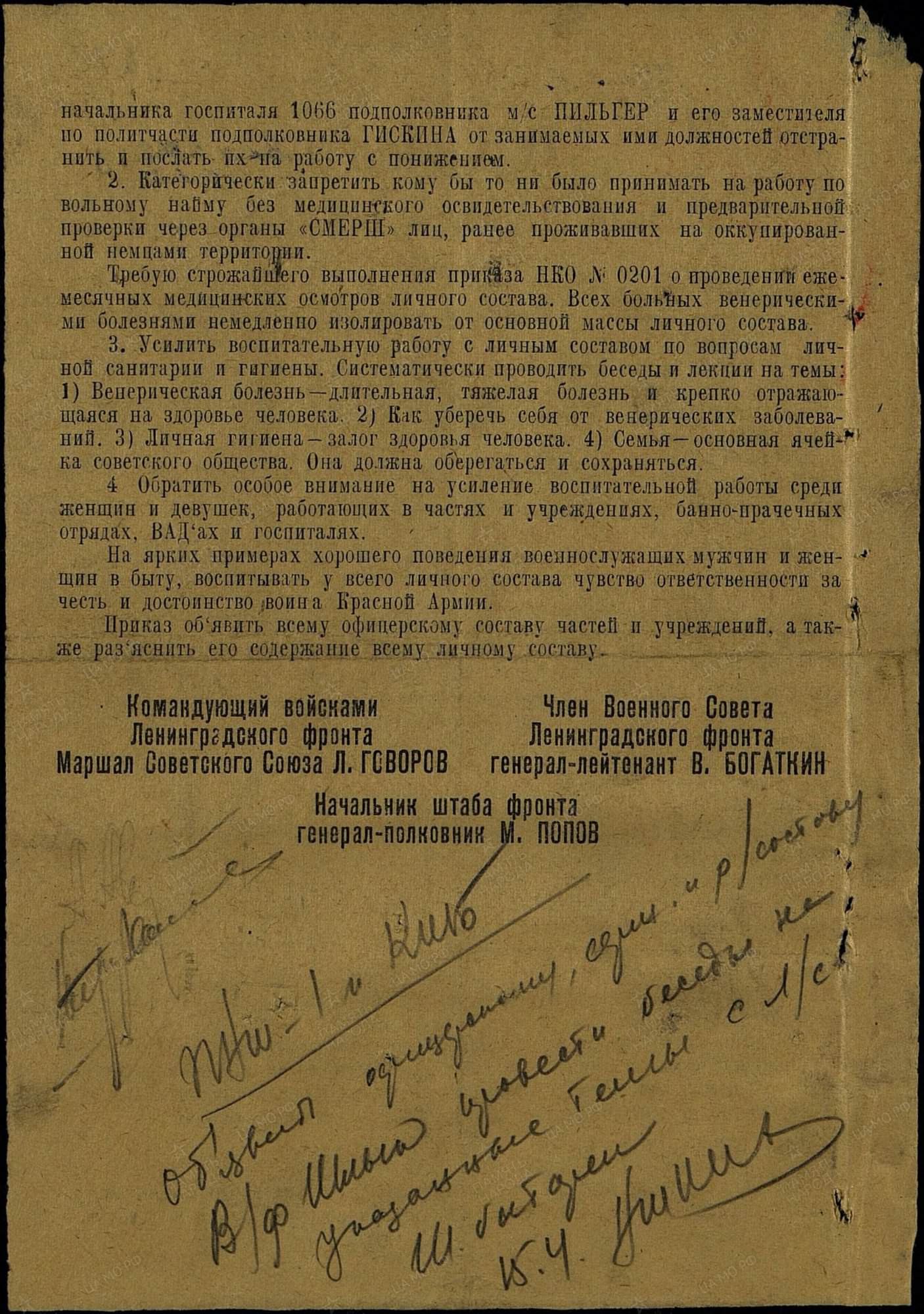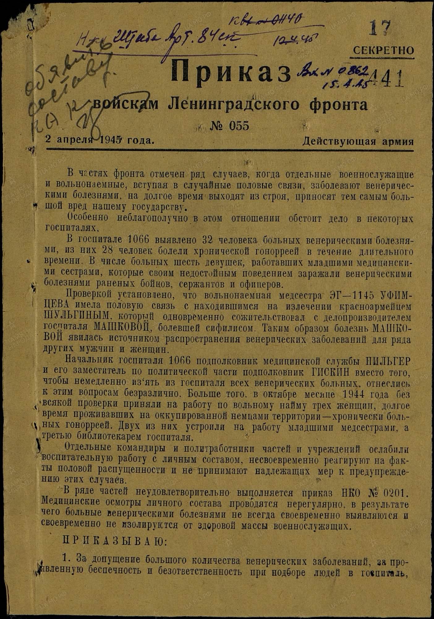В приказе упомянуто, чтобы Пильгера и его зама понизили в должности. Дело было в апреле 1945-го.