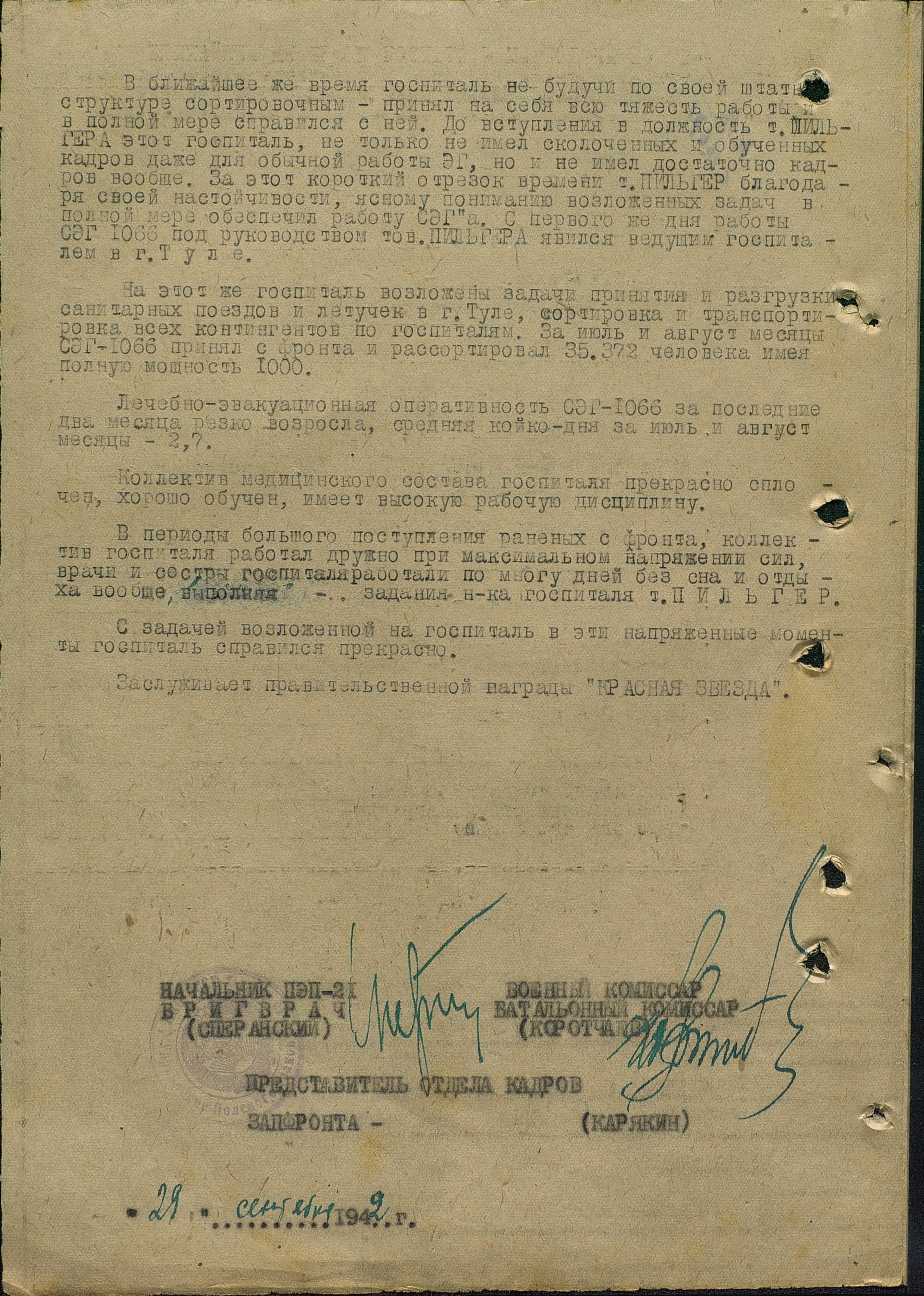 Подполковник медицинской службы ПИЛЬГЕР ИОСИФ ИСАЕВИЧ, не смог выполнил всем реакцию Вассермана, на сифилис, и принял несколько человек, на работу, которые находились, ранее, на оккупированной территории, а кто их там оставил?! Вся европейская часть страны была оккупирована! И он, за спасение, тысяч раненных, в тяжелейших условиях полевого госпиталя, в полуразрушенных зданиях, палатках, выполнил до конца свой долг ВОЕННОГО ВРАЧА и получил, за это, Правительственную награду орден «ОТЕЧЕСТВЕННОЙ ВОЙНЫ» 2 СТЕПЕНИ!