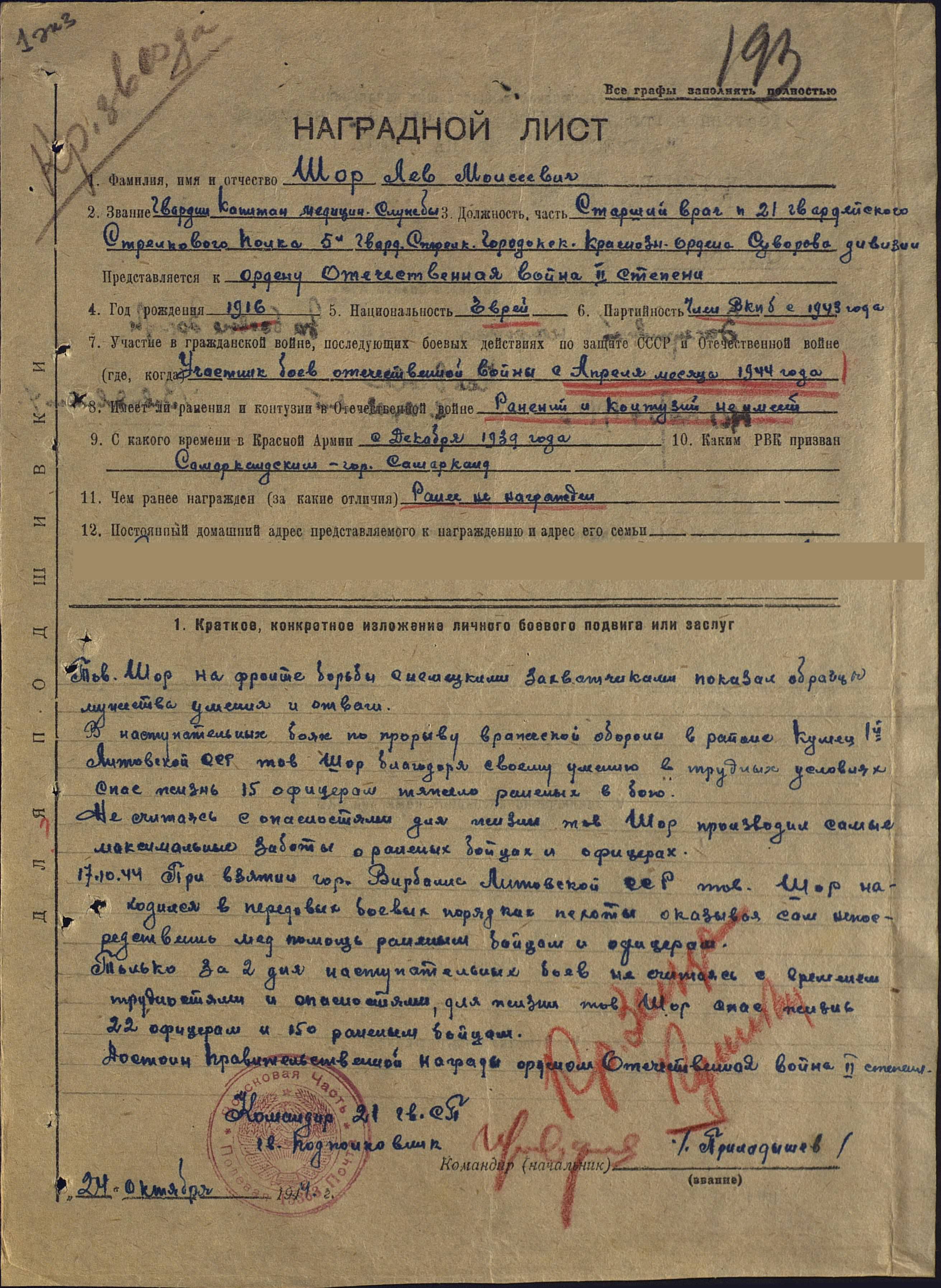 старший врач 21-го гвардейского стрелкового полка 5-й гвардейской стрелковой Городокской ордена Ленина Краснознамённой ордена Суворова дивизии