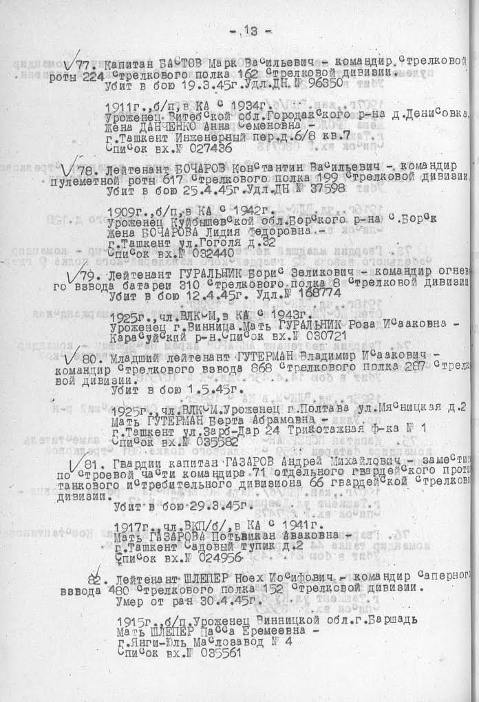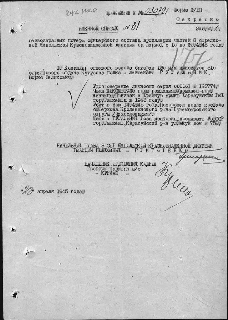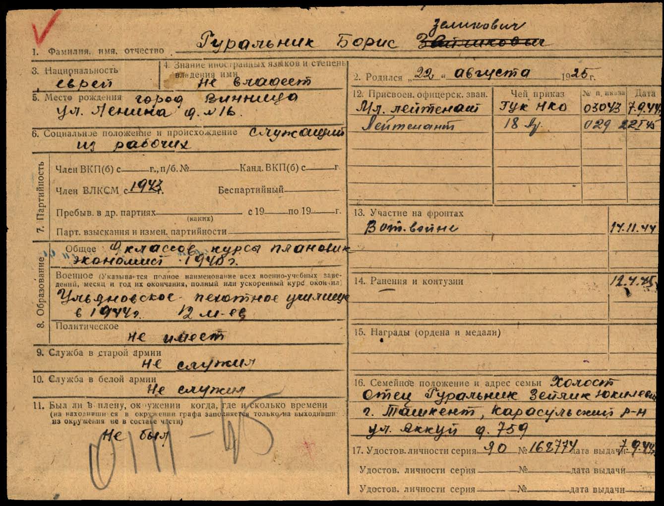 Лейтенант ГУРАЛЬНИК БОРИС ЗЕЛИКОВИЧ, 22.08.1925 года рождения, родился - Украинская ССР, Винницкая область, г. Винница, ул. Ленина, дом 16, еврей. После окончания 9 классов, средней школы, закончил курсы плановиков - экономистов, в 1940 году. В РККА призван Карасульским РВК, г. Ташкента, Узбекской ССР, 02.01.1943 года. Направлен на учёбу, в Ульяновское пехотное училище, ускоренный курс которого, закончил, через 12 месяцев, 7.09. 1944 года. На фронте Великой Отечественной войны с 14.11.1944 года - Командир огневого взвода батареи 120 мм. миномётов 310 стрелкового ордена Кутузова полка, 8 стрелковой Ямпольской Краснознамённой ордена Суворова дивизии, 17 гвардейского стрелкового корпуса, 18 Армии, 4 Украинского фронта. Боевые награды : нет. С Великой Отечественной войны не вернулся - убит, в бою, 12.04.1945 года. Захоронен: Чехословакия, Ружемберокский округ, Кролеванский район, село "Терхова", возле костела. Извещение о гибели: Ташкентский ГВК, Узбекская ССР, г. Ташкент, Карасульский район, ул. Аккуй, дом 759, мать - Гуральник Роза Исааковна, отец - Гуральник Зейлик Юхелевич. Вечная Слава и Память лейтенанту ГУРАЛЬНИКУ БОРИСУ ЗЕЛИКОВИЧУ, отдавшему свою, 20 - летнюю, жизнь за ВЕЛИКУЮ ПОБЕДУ и оставшемуся, на чужбине, "у костёла", в забытом селе!
