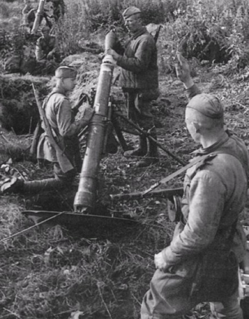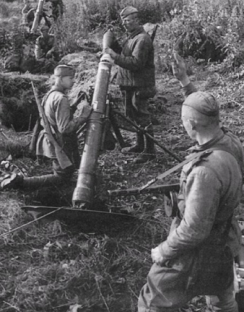 2. 120 мм. полковой миномёт, образца 1938 года, материальная часть 310 стрелкового ордена Кутузова полка, 8 стрелковой Ямпольской Краснознамённой ордена Суворова дивизии ("Миномёты и безоткатные орудия СССР": https://clck.ru/ToTAB ).
