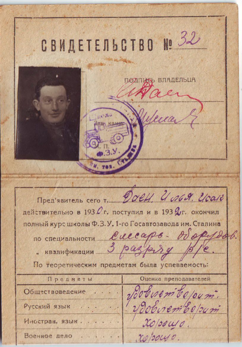 В 1930 году поступил и в 1932 году окончил полный курс школы Ф.З.У. 1-го автозавода им. Сталина. Так Илья получил первую специальность – слесарь оборудования III разряда.