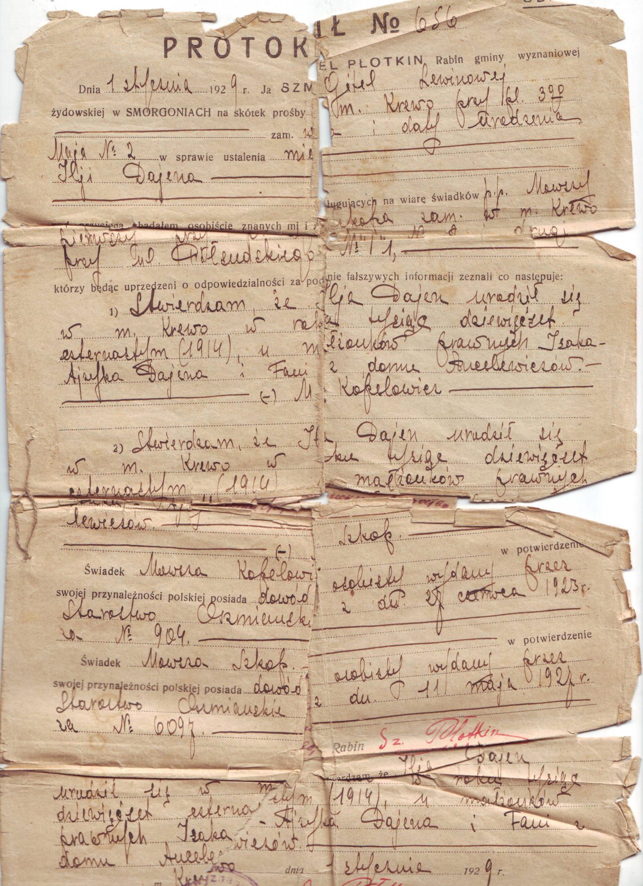 «Я, Шмуль Плоткин, раввин общины еврейской в Сморгони, по просьбе Гител Левиной об установлении даты рождения Ильи Даена, ... под присягою ... известных Мовшу Ксиловичу и Мовша Сикапа, проживающего в м. Крево, на площади 3 мая, д.18, по улице Пелсудского дом № 1. , даем показания, что Илья Даен родился в 1914 году у супругов Исаака-Айзика Даен и Фани, уроженки Анцилевич, / М. Ксилович/