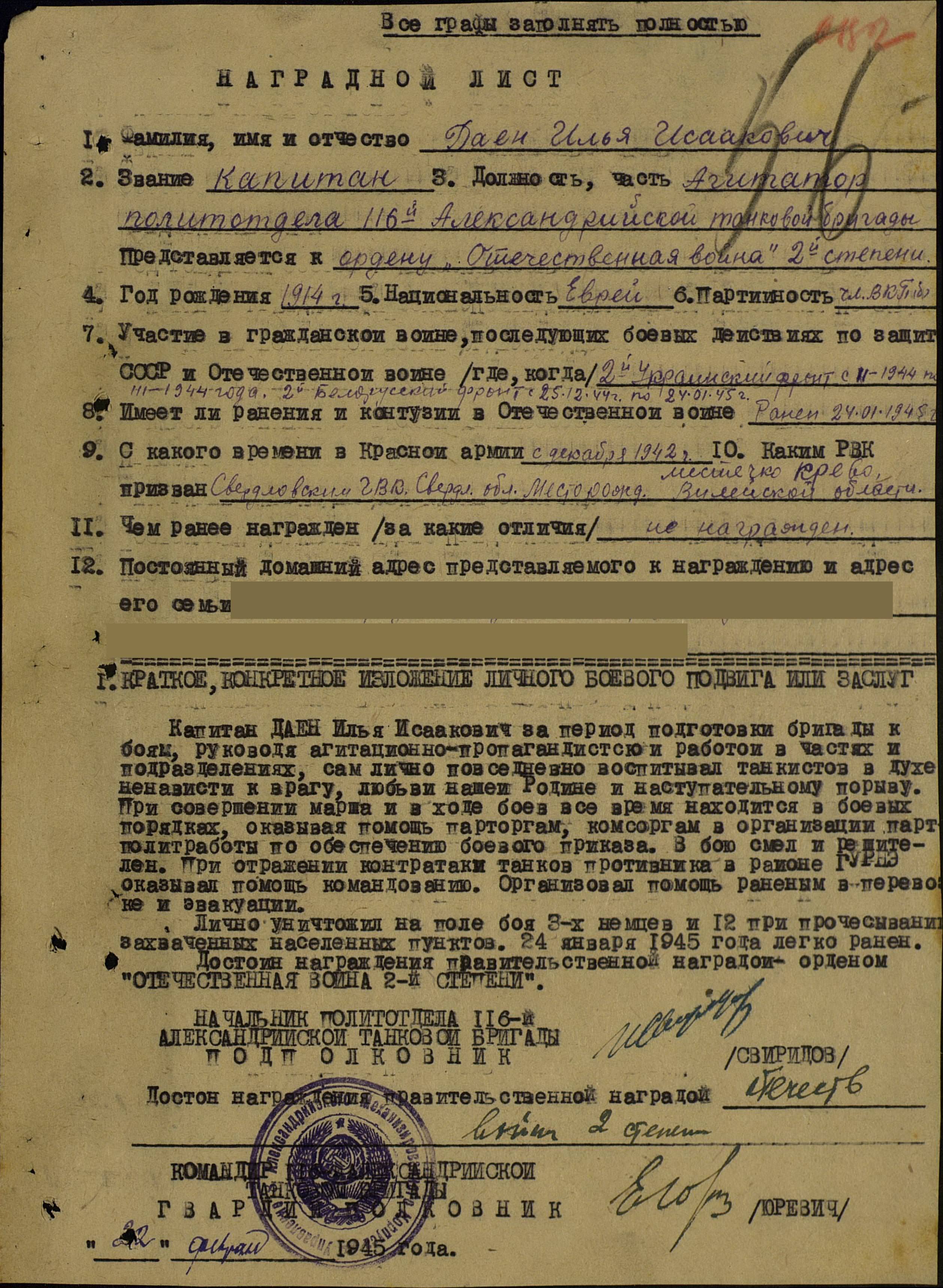 агитатор политотдела 116-й Александровской танковой бригады, 8-го механизированного корпуса.