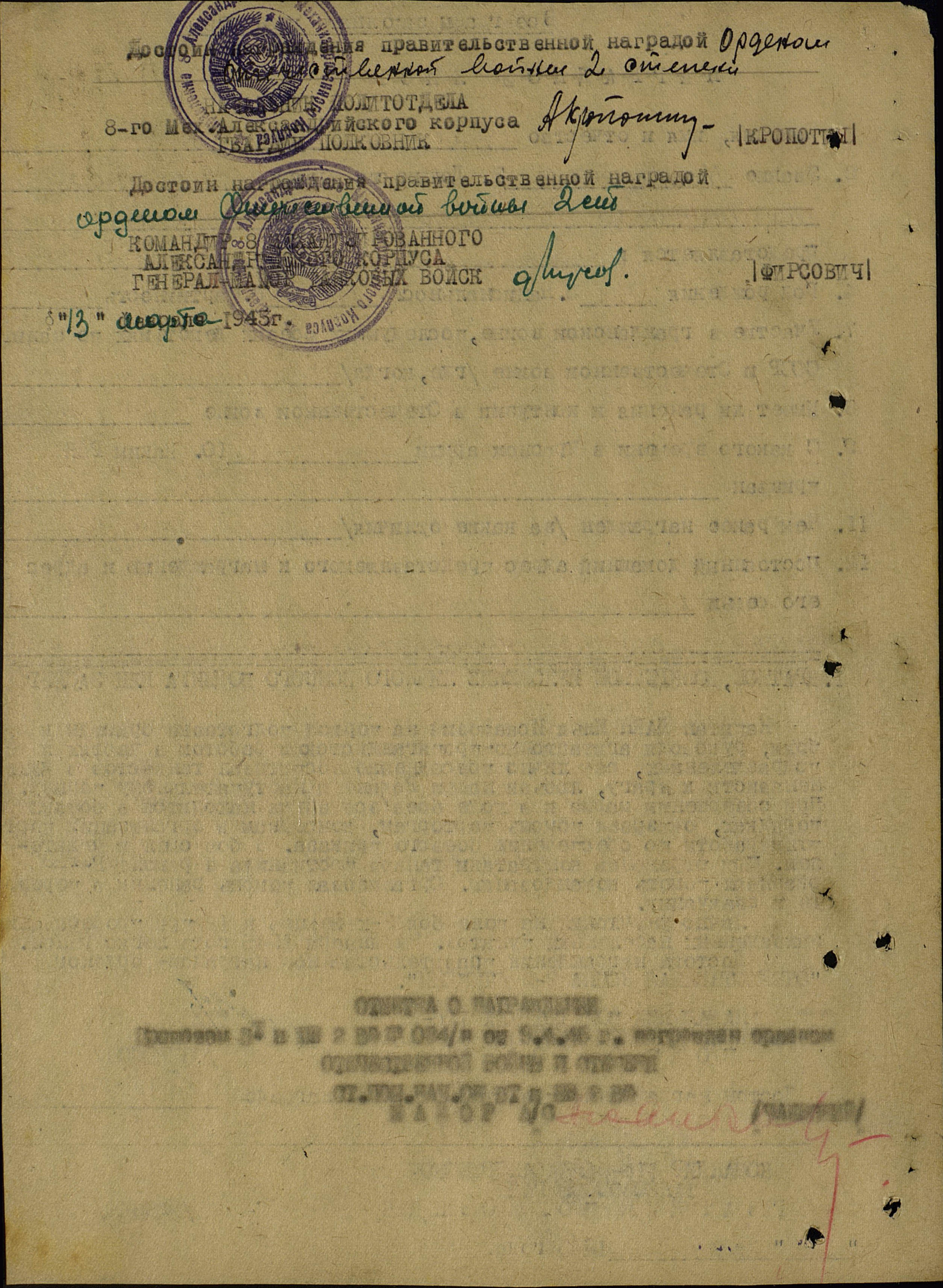 Фронтовые дороги прошли через европейскую часть нашей страны и завершились участием штурма Кенигсберга. В феврале 1945 года его награждают орденом « Великой Отечественной войны II степени».