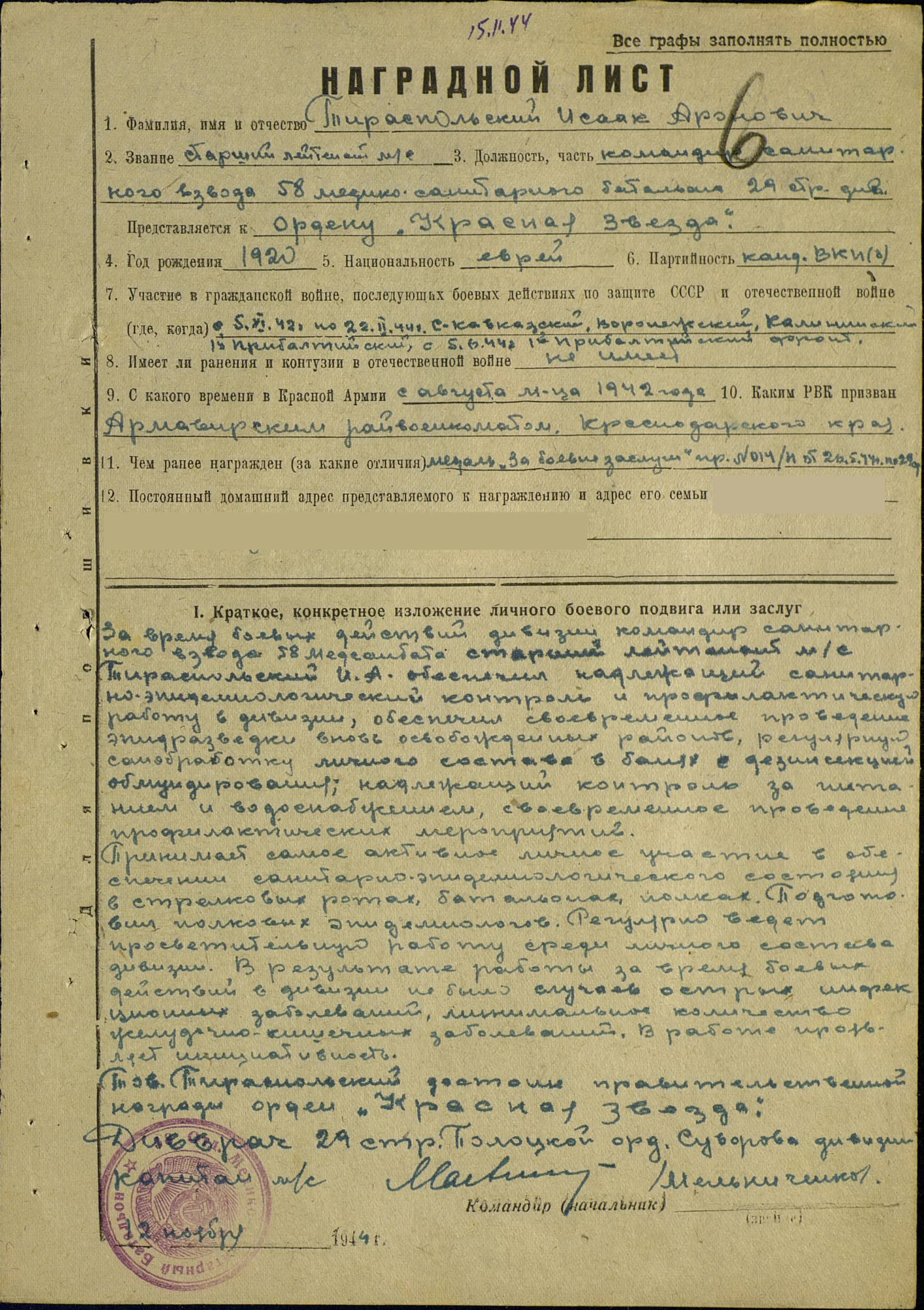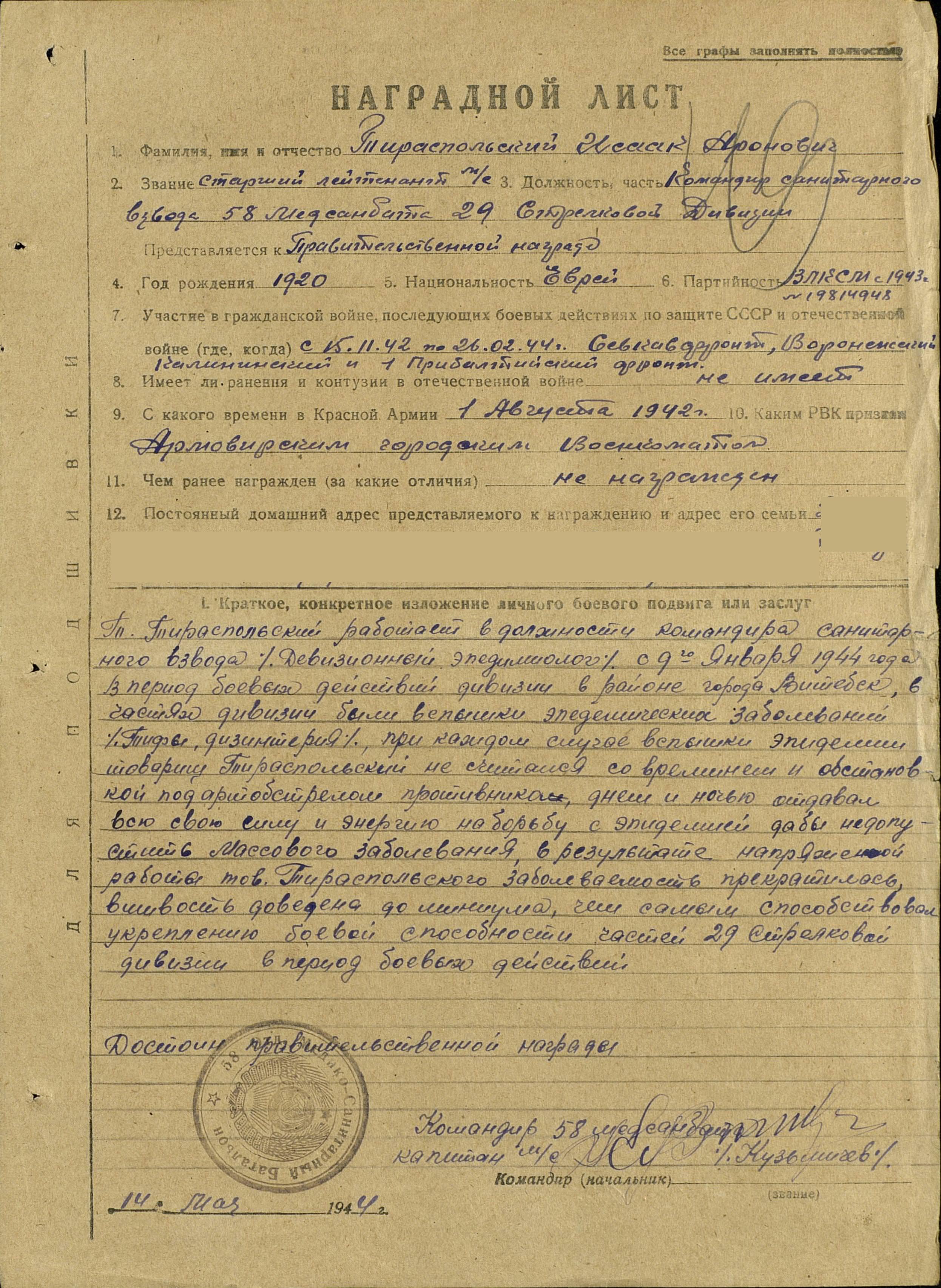 Тираспольский Исаак Аронович родился в 1920 году в Украинская ССР, Запорожская обл., г. Мелитополь. Еврей.