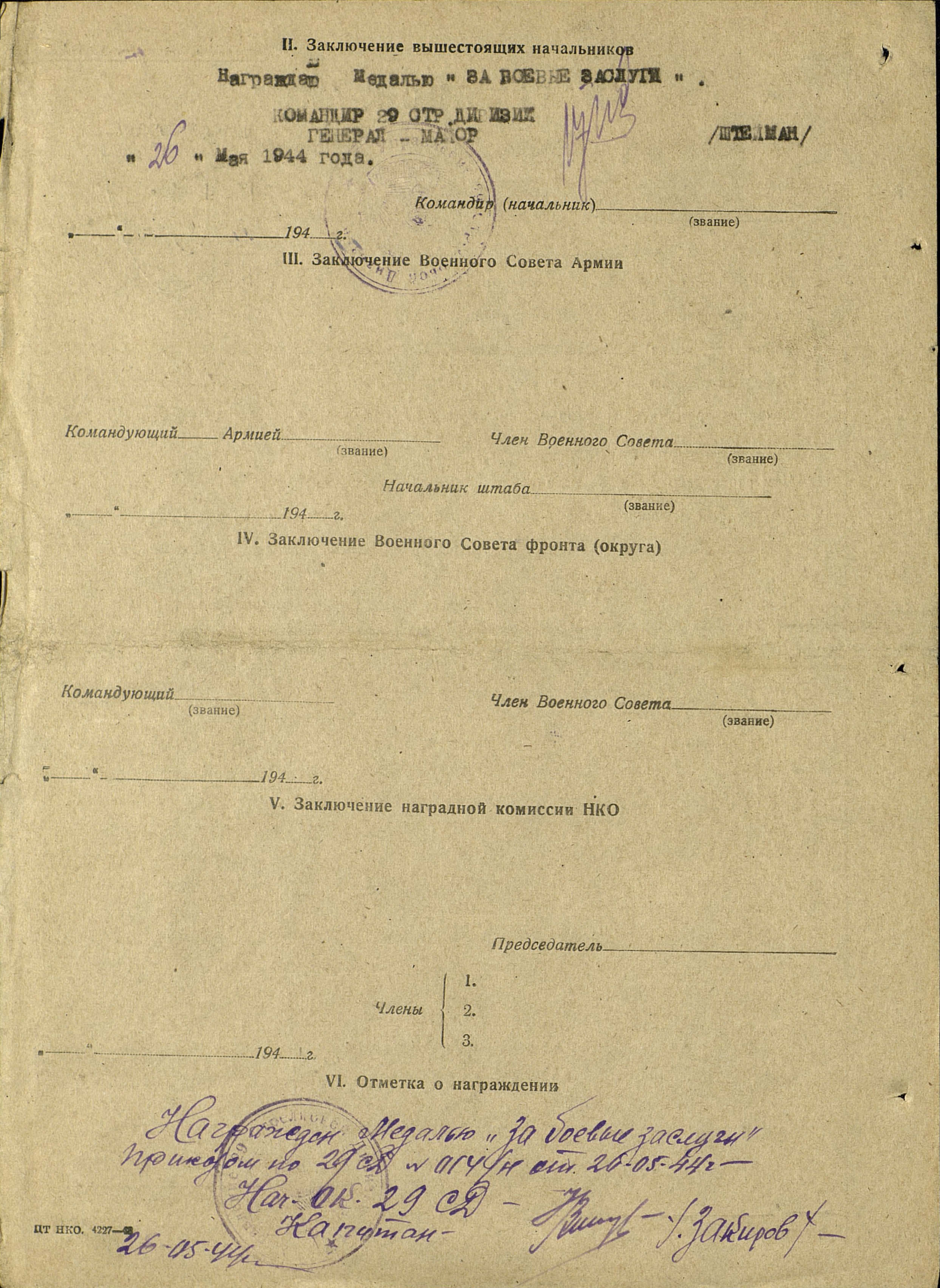 орден Отечественной войны 2-й степени, орден Красной Звезды, медаль "За Боевые Заслуги", медаль "За оборону Кавказа" и др. медали.