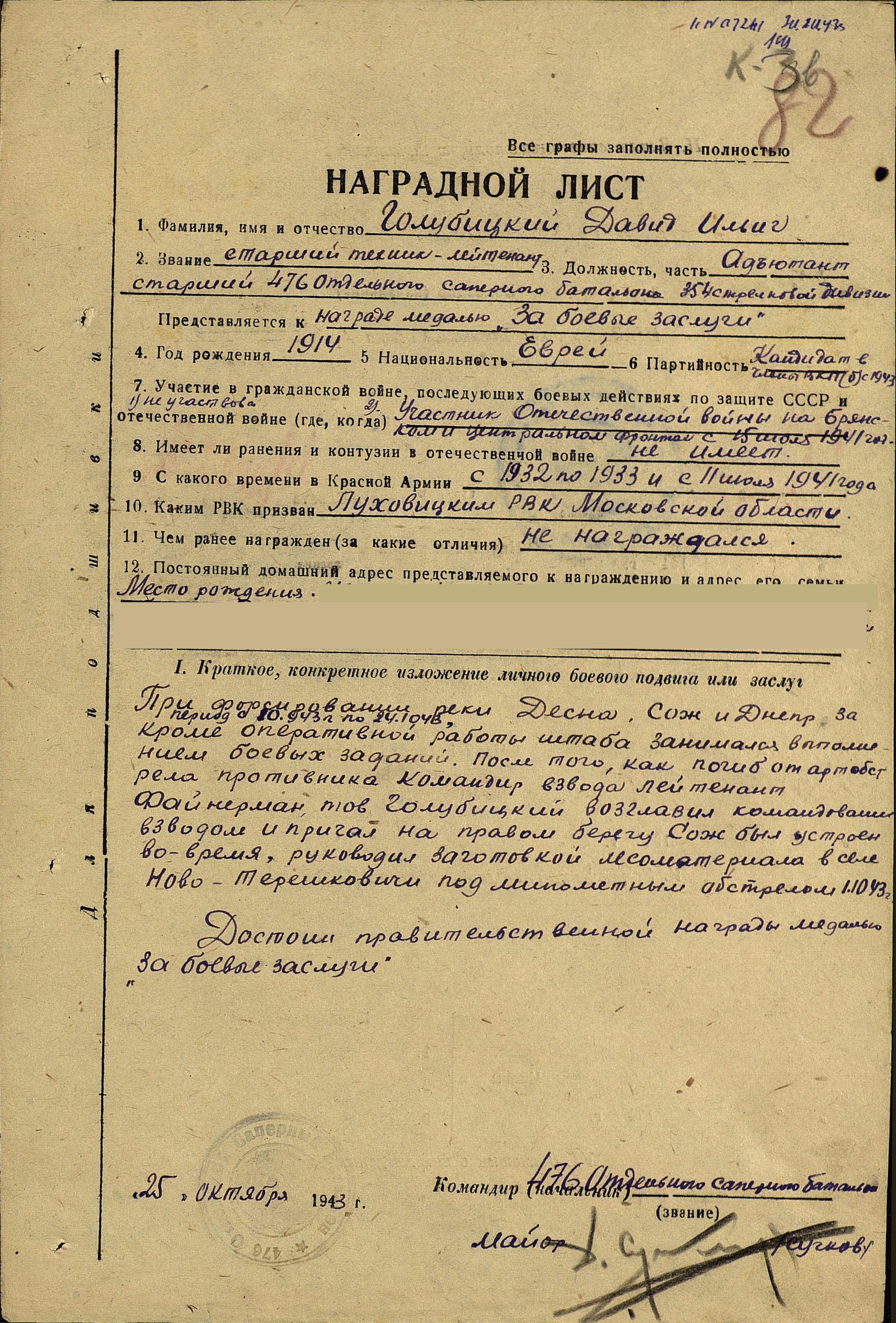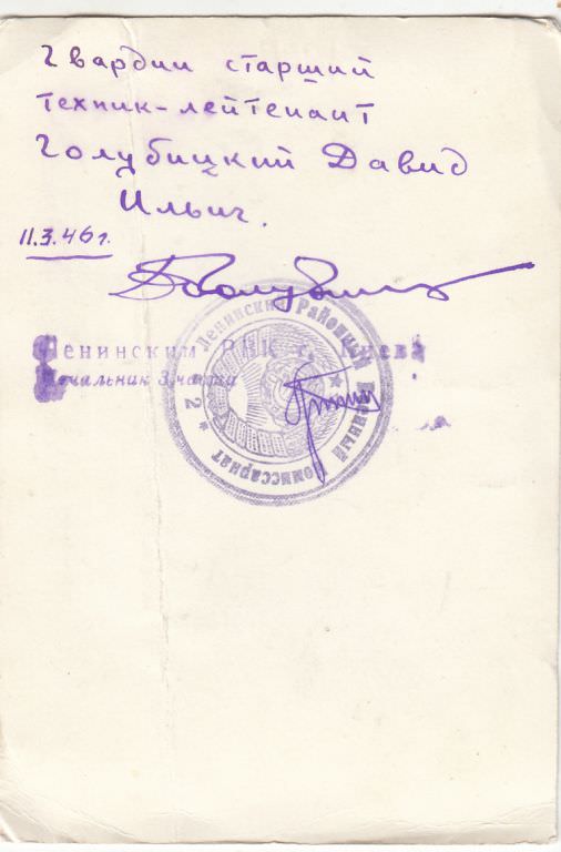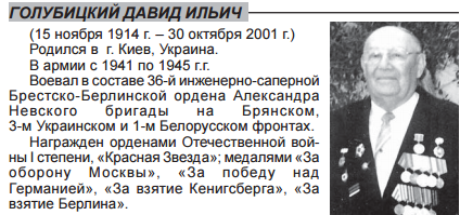 Голубицкий Давид Ильич родился в 1914 году в Украинская ССР, Киевская обл., г. Киев. Еврей.