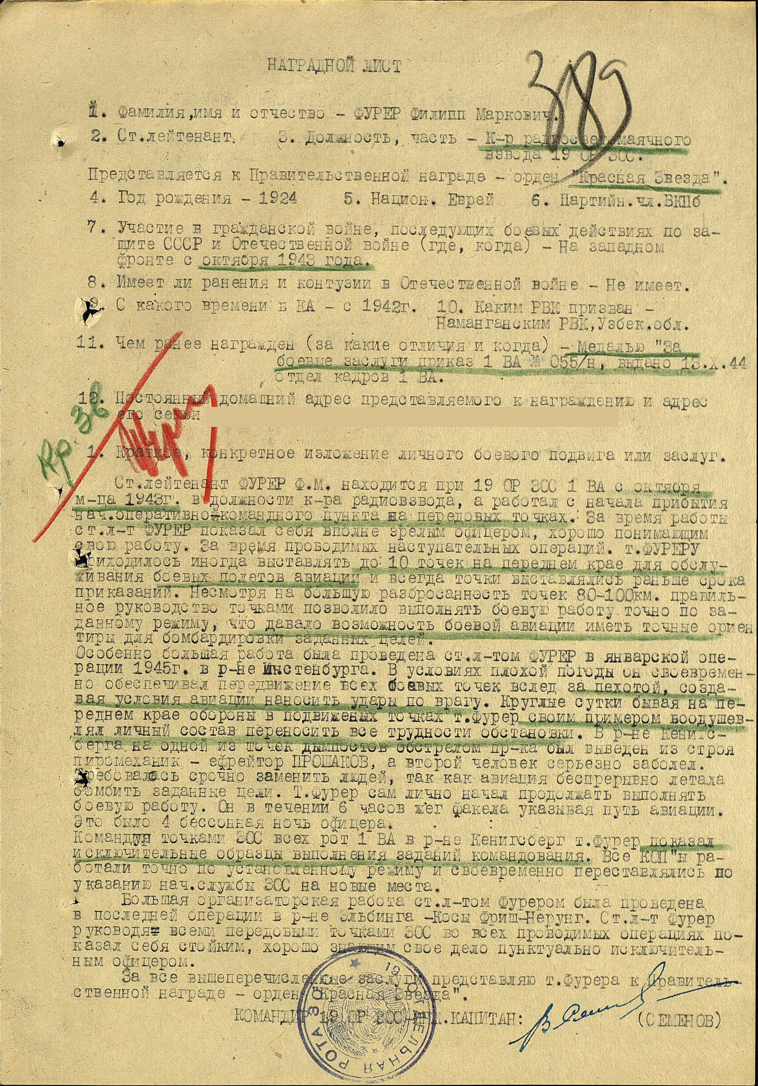 Еврей. Член ВКПб. В РККА с 1942 года. На фронте с октября 1943 года.