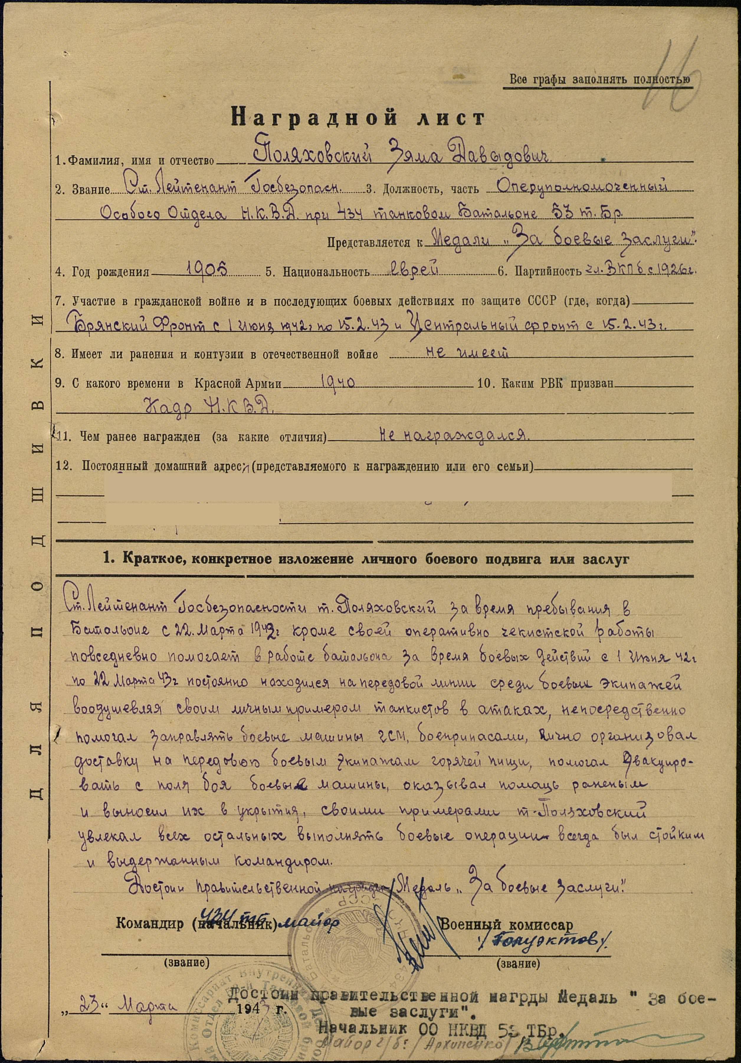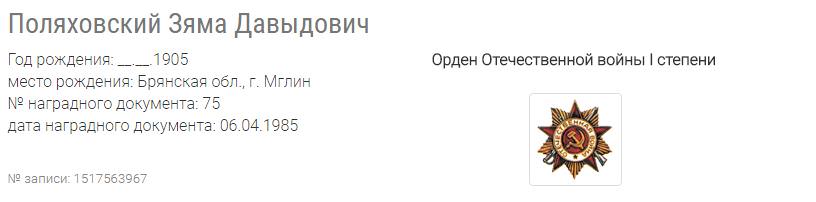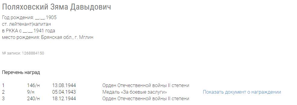 На фото - мой дедушка Поляховский Зяма Давидович 1905 года рождения. Родился в еврейском местечке Мглин Брянской области. Всю войну прошел в звании капитана бронетанковых войск, которыми командовал прославленный генерал, дважды Герой Советского Союза Павел Рыбалко. В его штабе у капитана Поляховского была должность замполита и должность зам. начальника в спецотделе «СМЕРШ». О войне дед не очень любил рассказывать, потому я не много слышал историй о боях, о разоблачениях изменников родины и предателей. Но они были. Иногда дедушка что-то скупо вспоминал. В Польше, в самый разгар ночного допроса какого-то труса и перебежчика, в кабинет капитана Поляховского с криком «немцы в селе!» влетел его адъютант Сашка.Всё, слава богу, закончилось благополучно.Только я запомнил на всю жизнь этот рассказанный дедом эпизод. Капитан готов был расстрелять на месте адъютанта за то, что тот уснув на посту, прозевал бесшумное приближение фашистов. Уже даже вытащил из кобуры пистолет, но в последний момент жалко стало офицеру молодого солдата–симпатичного армянина, красиво поющего армянские песни и он пощадил его. Сашка был арестован на какое-то время. Тем не менее, они вместе довоевали до дня Победы. Дедушка умер к тридцатисемилетию Победы. Ему было 82 года.Потом от бабушки и мамы я всегда слышал, что если бы не фронтовые многочисленные ранения он прожил бы больше. Прожил бы больше.