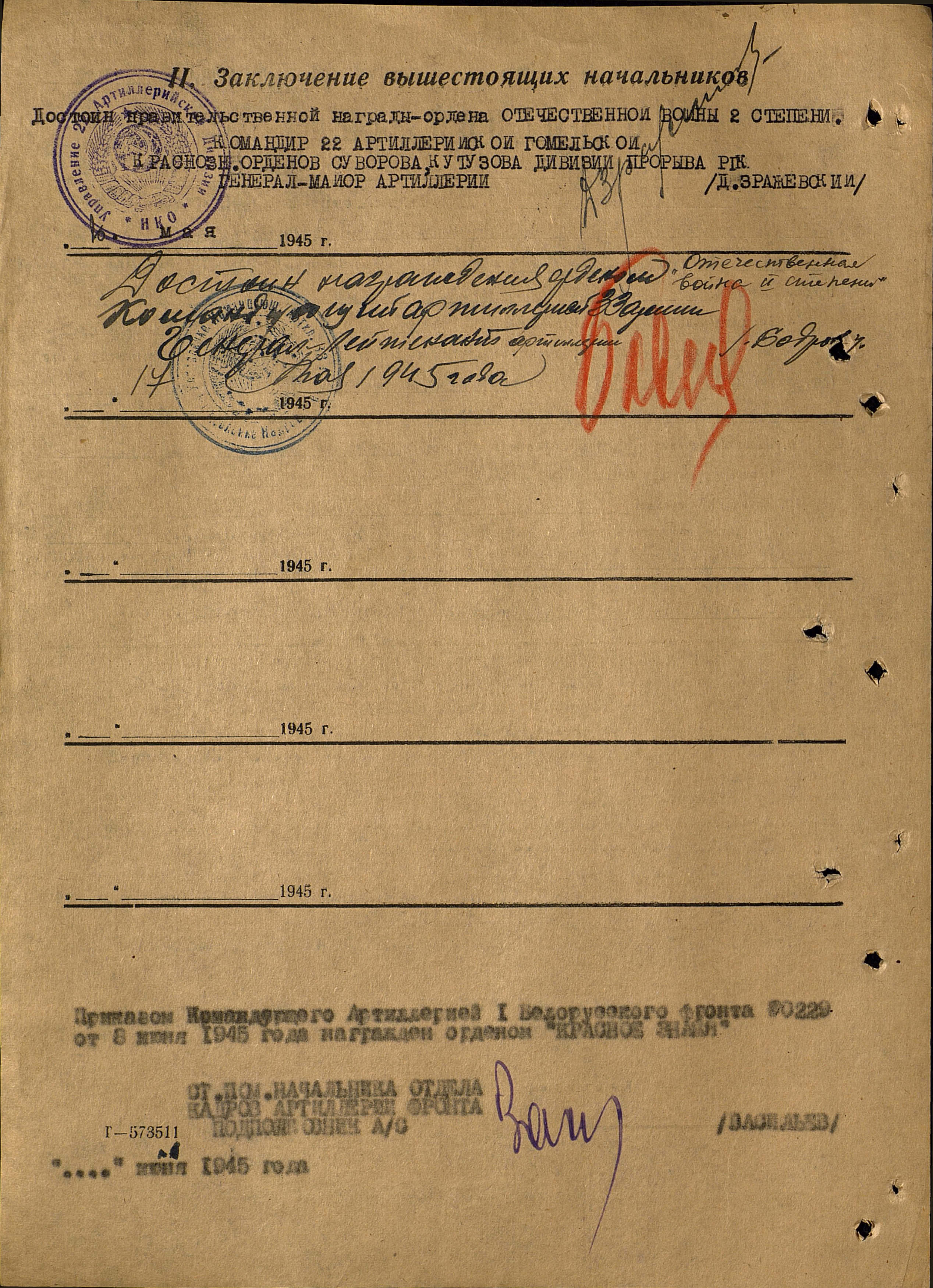 Победу встретил в Германии в должности командира 7-й батареи, 3-го дивизиона, 59-й пушечно-артиллерийской бригады, 22-й артиллерийской Гомельской Краснознаменной дивизии РГК.