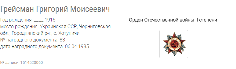 Грейсман Григорий Моисеевич родился в 1915 году в Украинская ССР, Черниговская обл., Городнянский р-н, с. Хатуничи. Еврей.