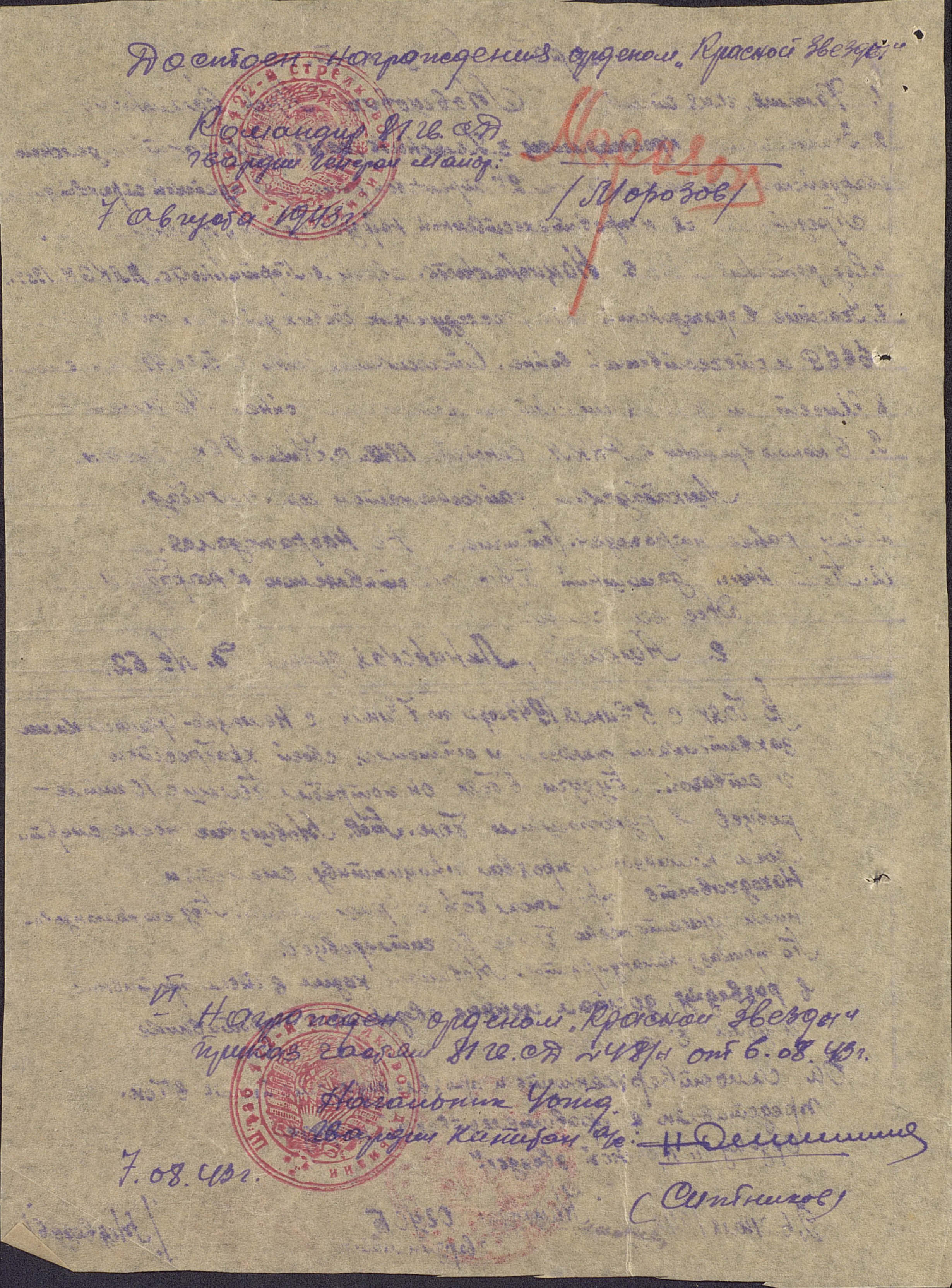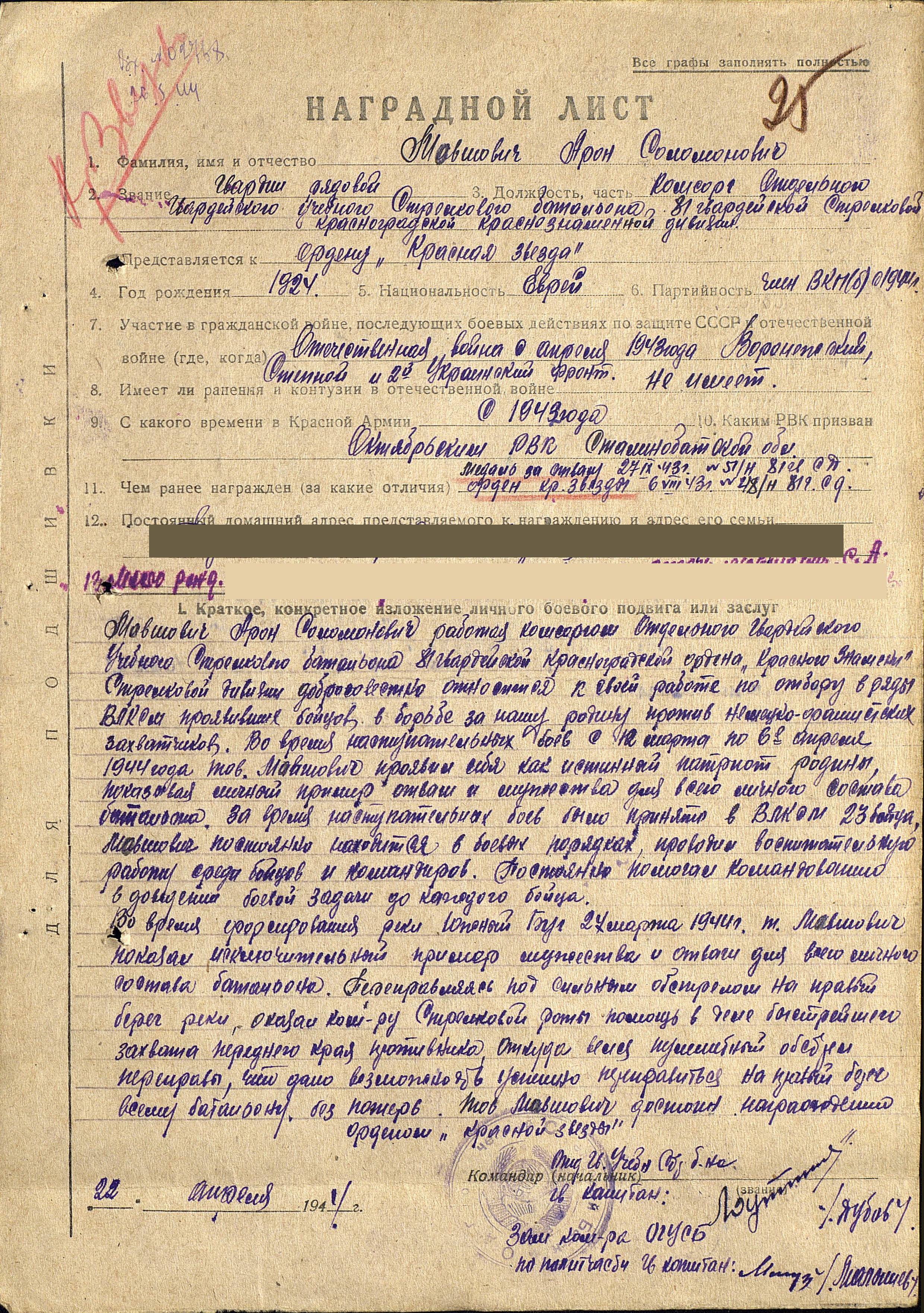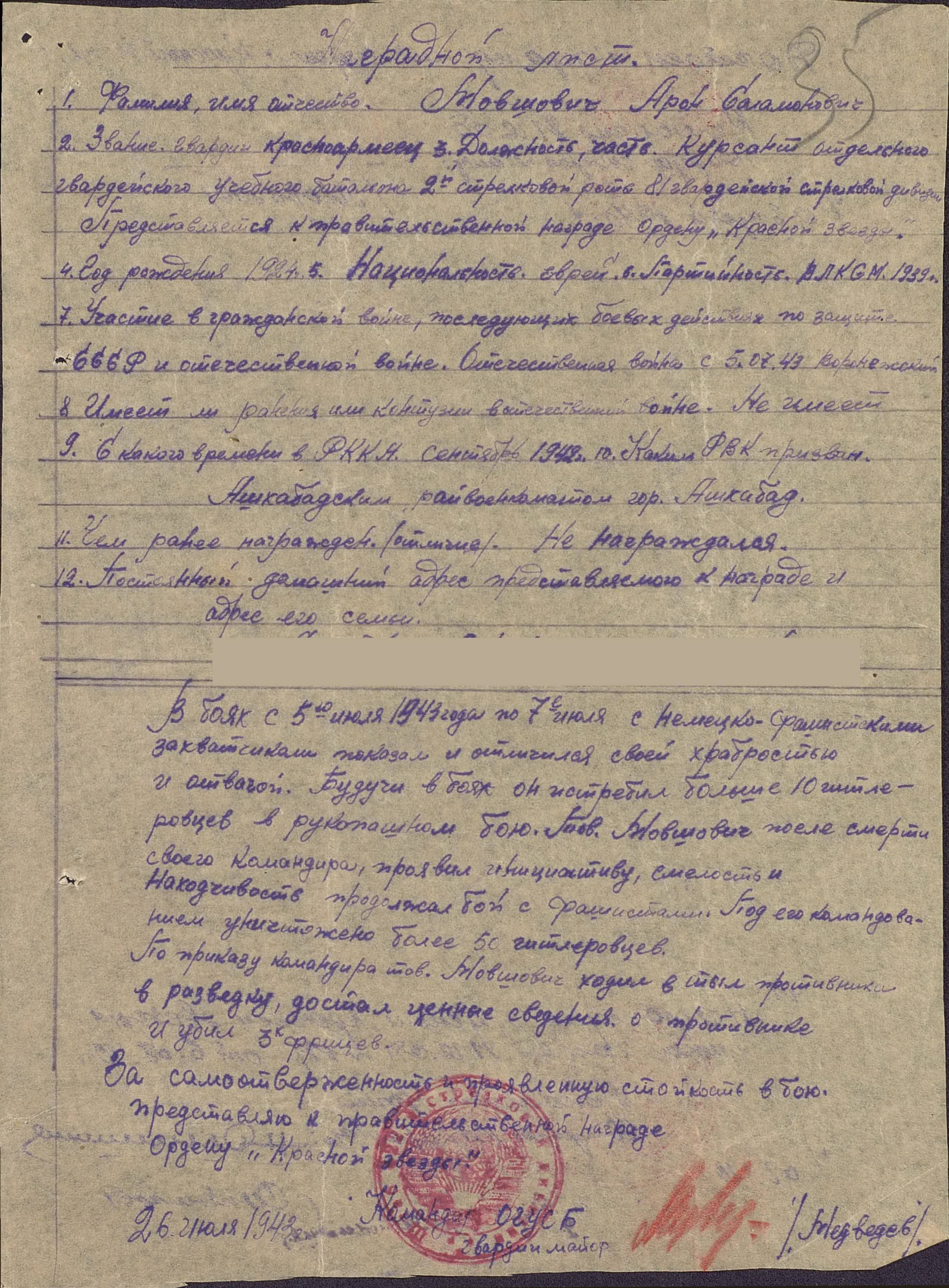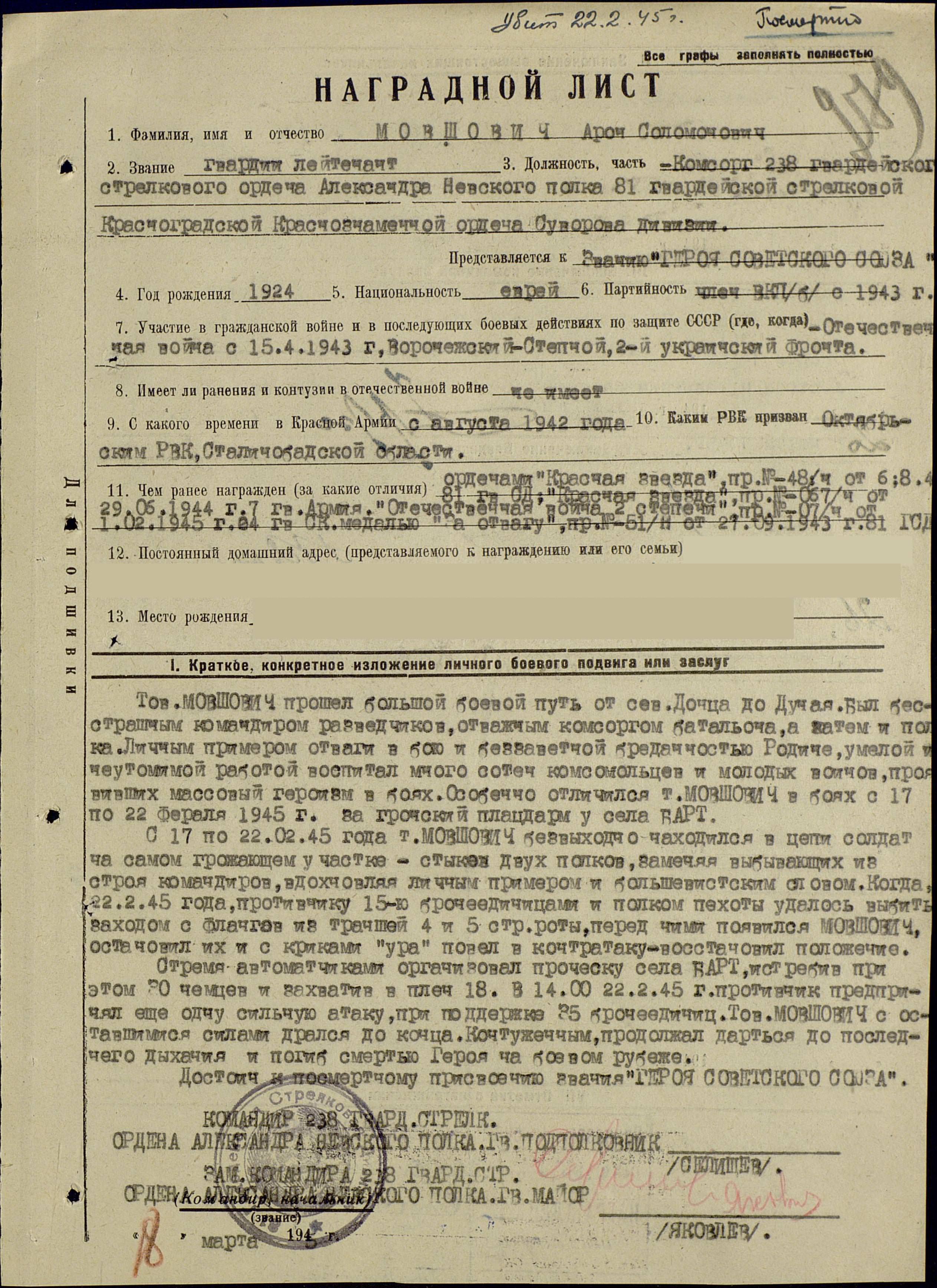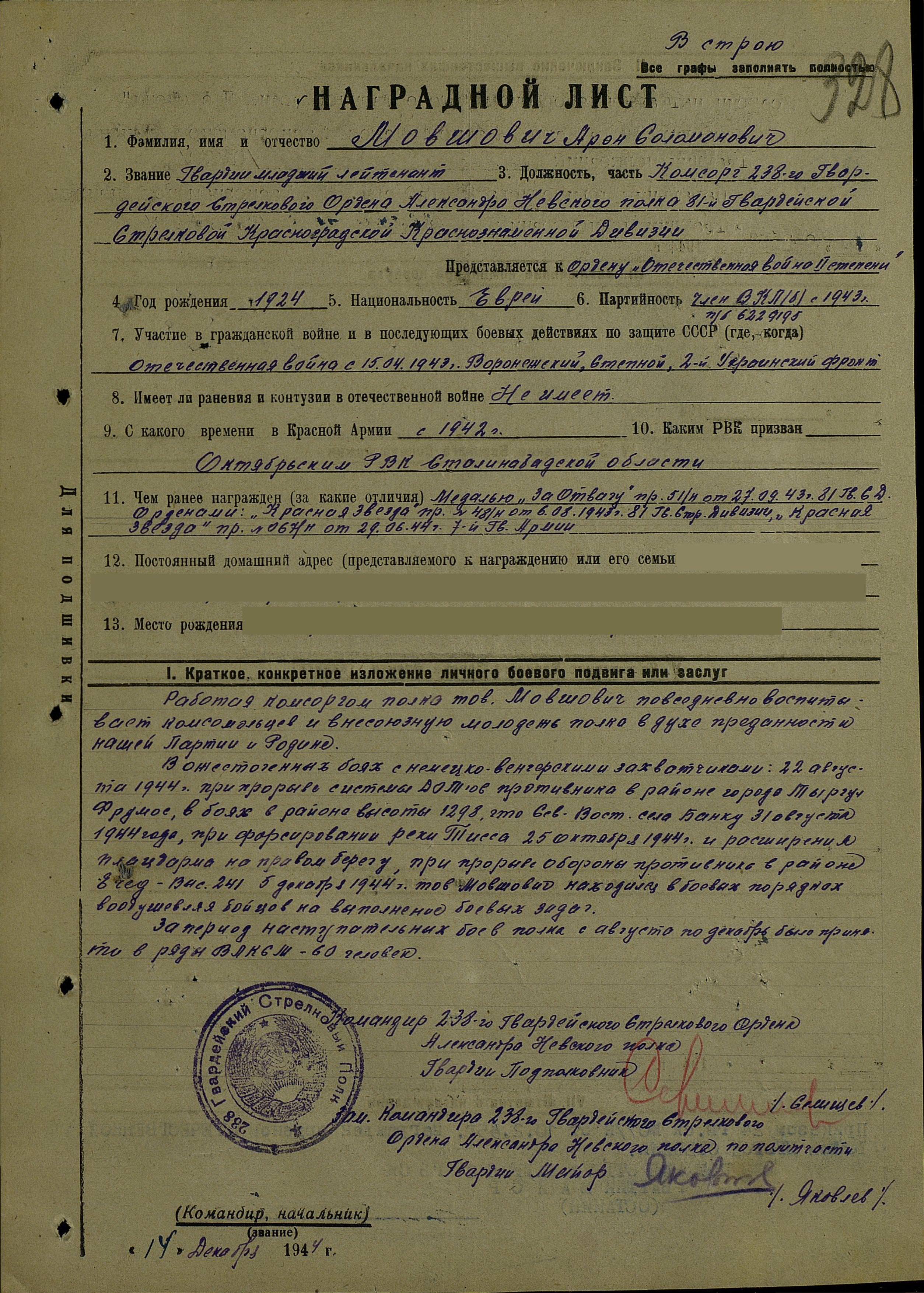 Из наградного листа на присвоение звания Героя Советского Союза комсоргу 238-го гвардейского стрелкового полка лейтенанту Мовшович А.С.