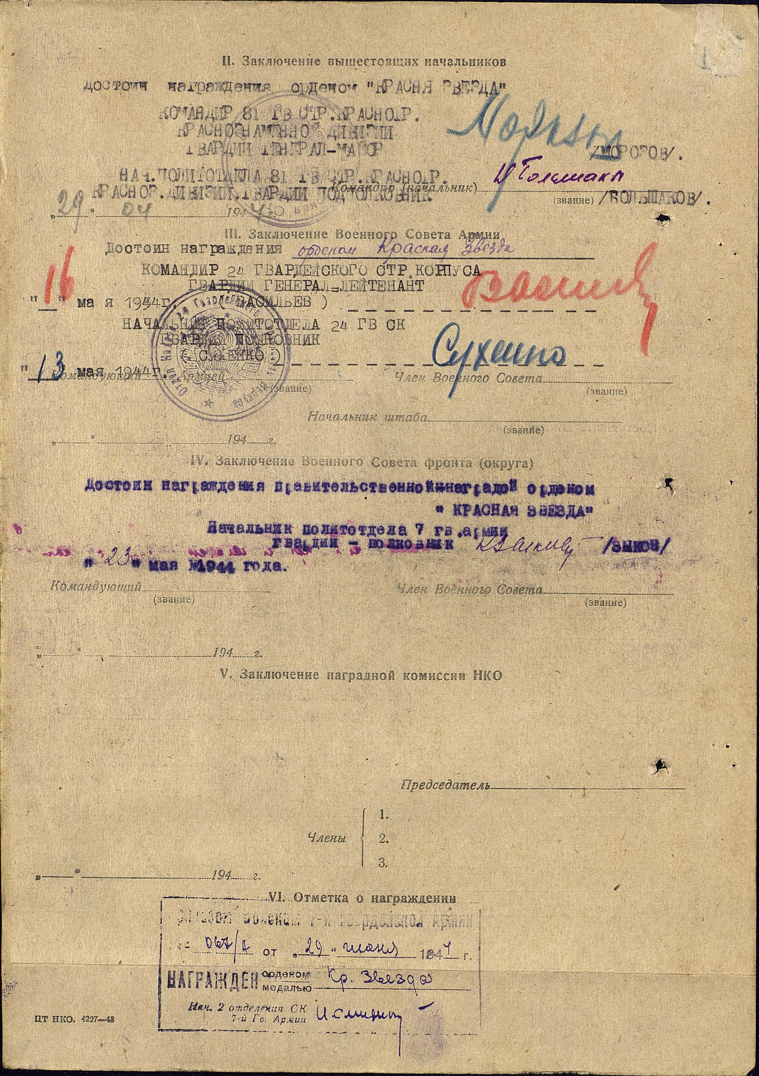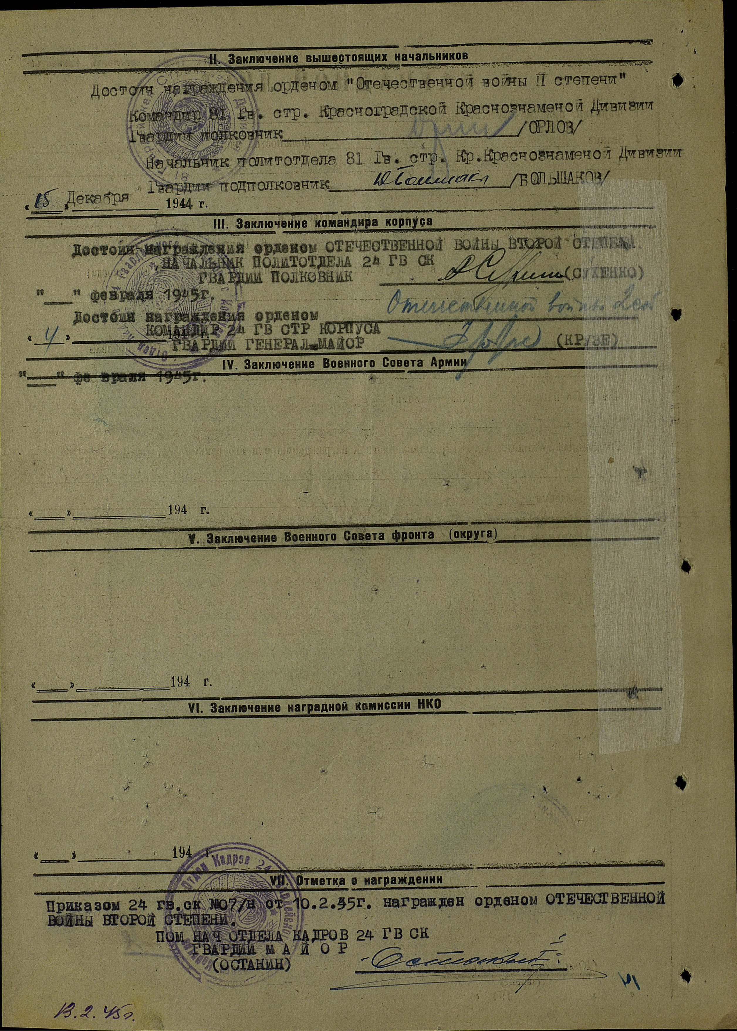 комсорг 238-го гвардейского стрелкового полка , 81-й гвардейской стрелковой дивизии, 24-го гвардейского стрелкового корпуса, 7-й гвардейской армии.