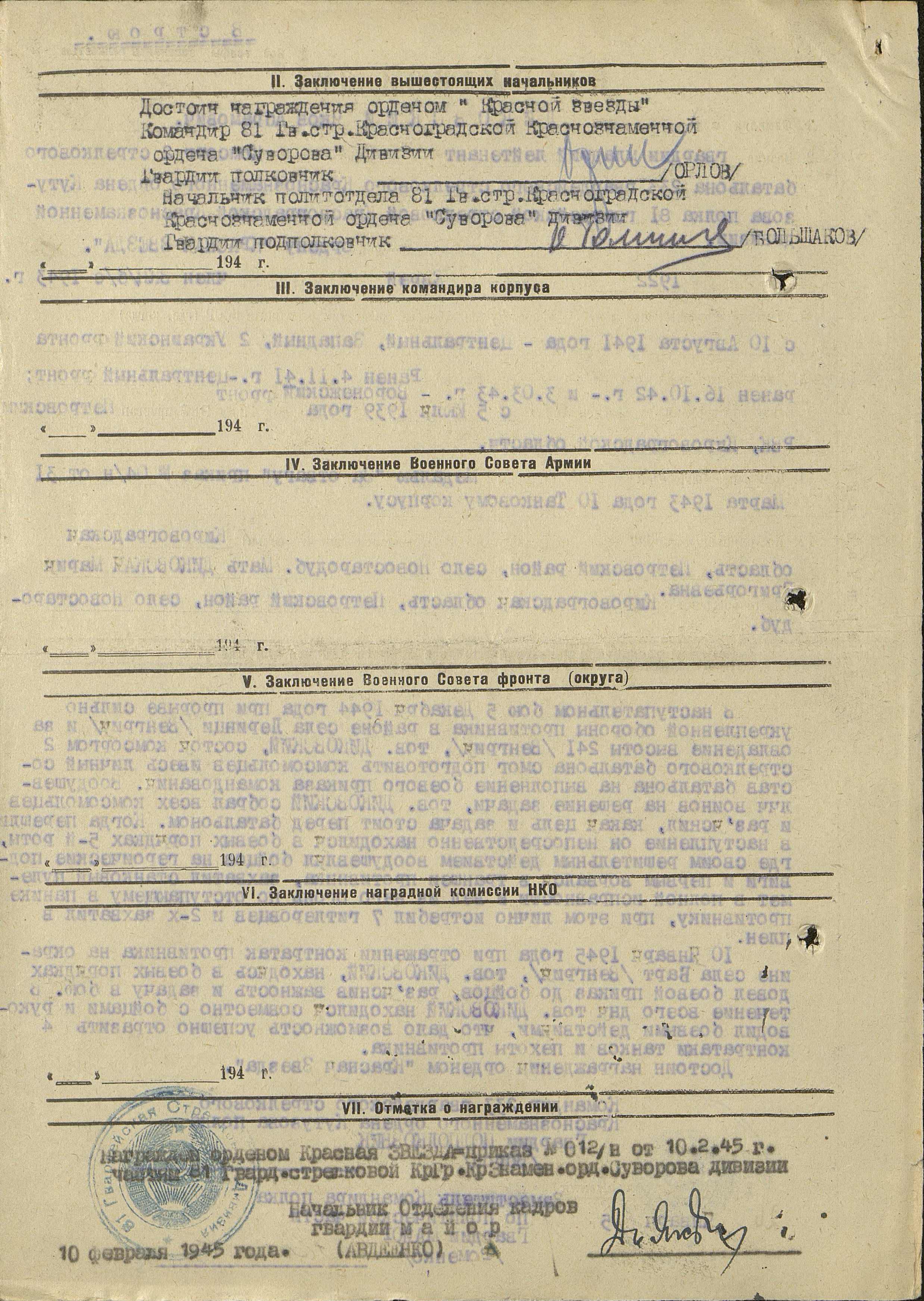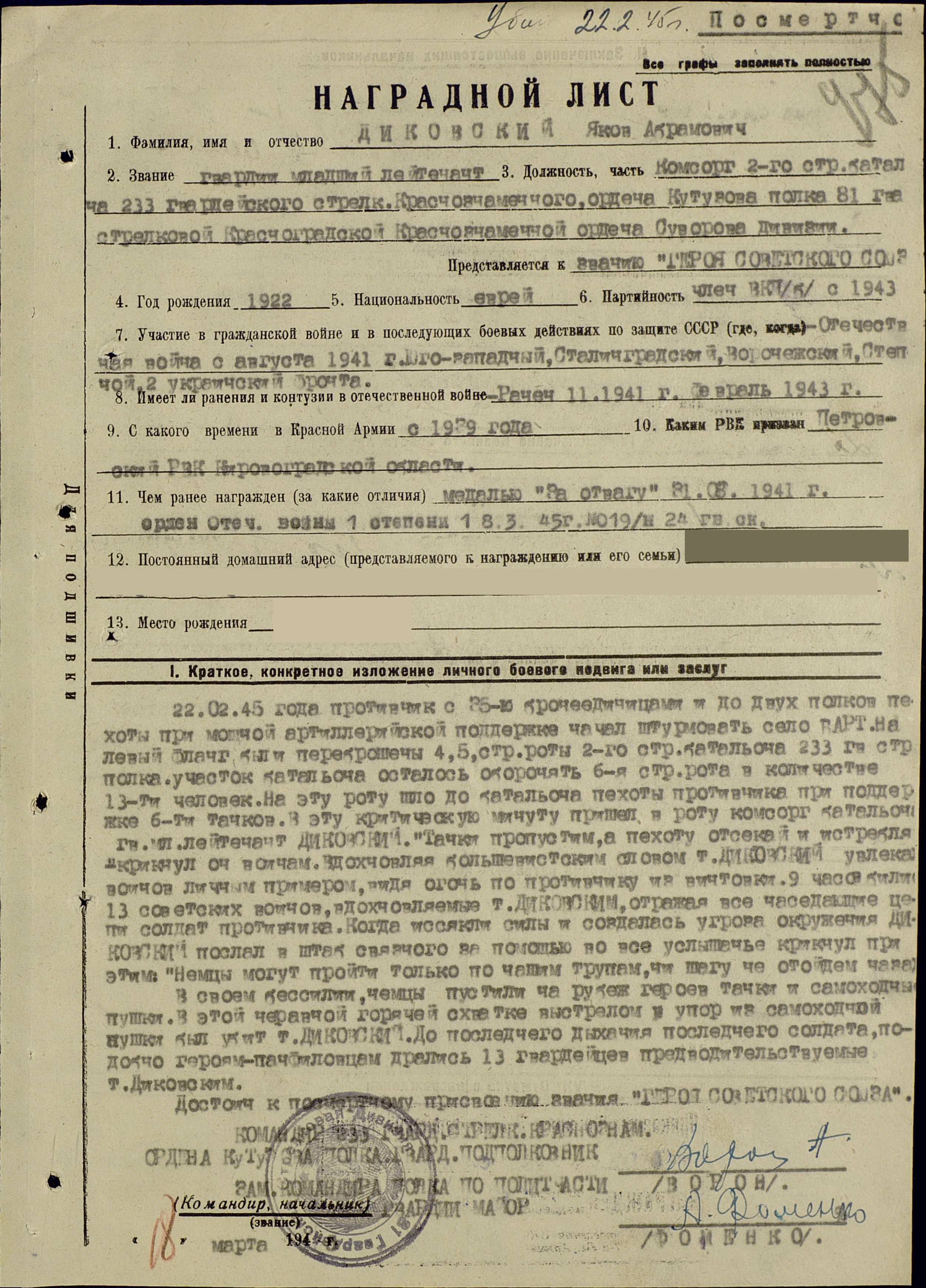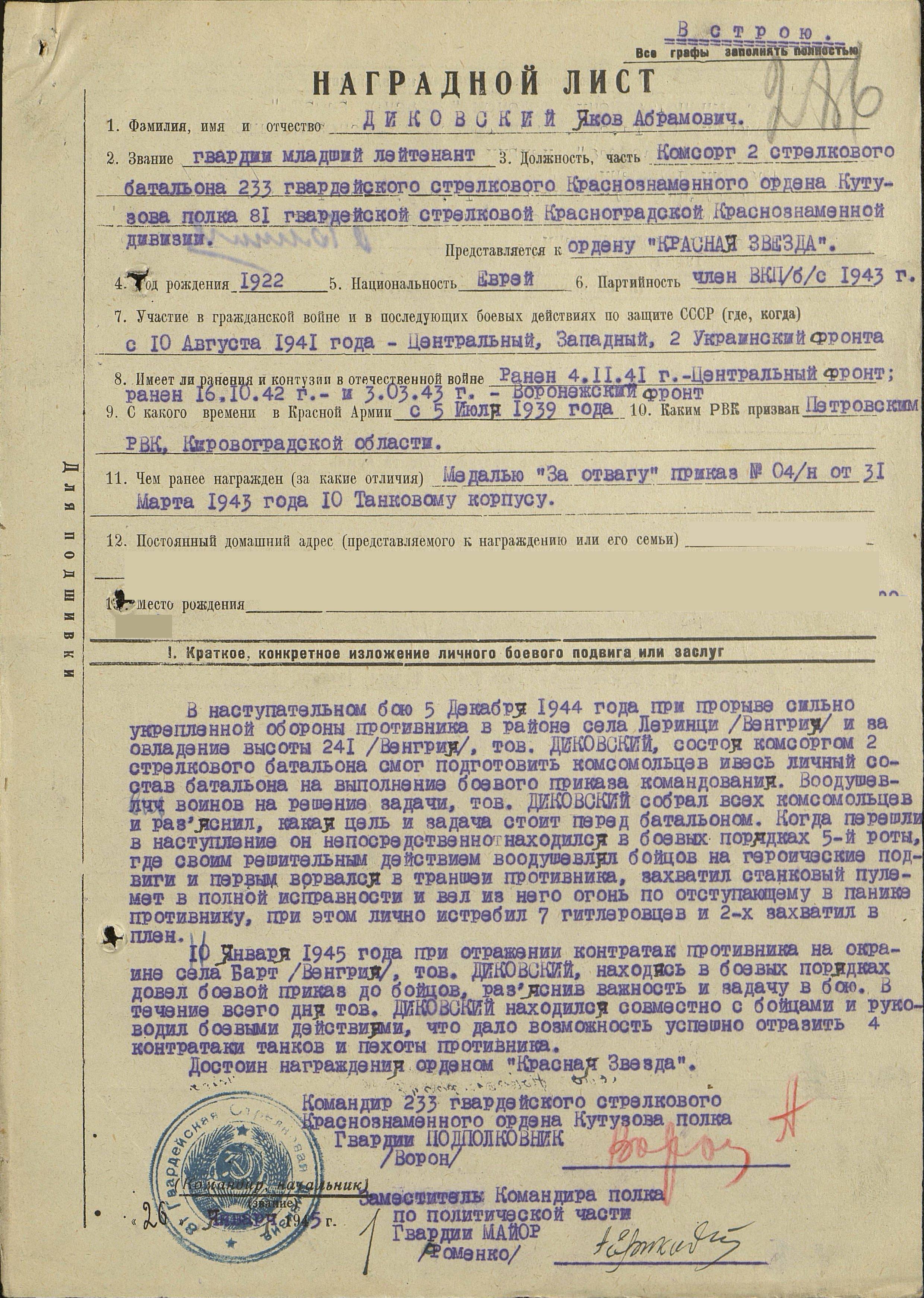 Из наградного листа на присвоение звания Героя Советского Союза на комсорга 2-го батальона 233-го гвардейского стрелкового полка: