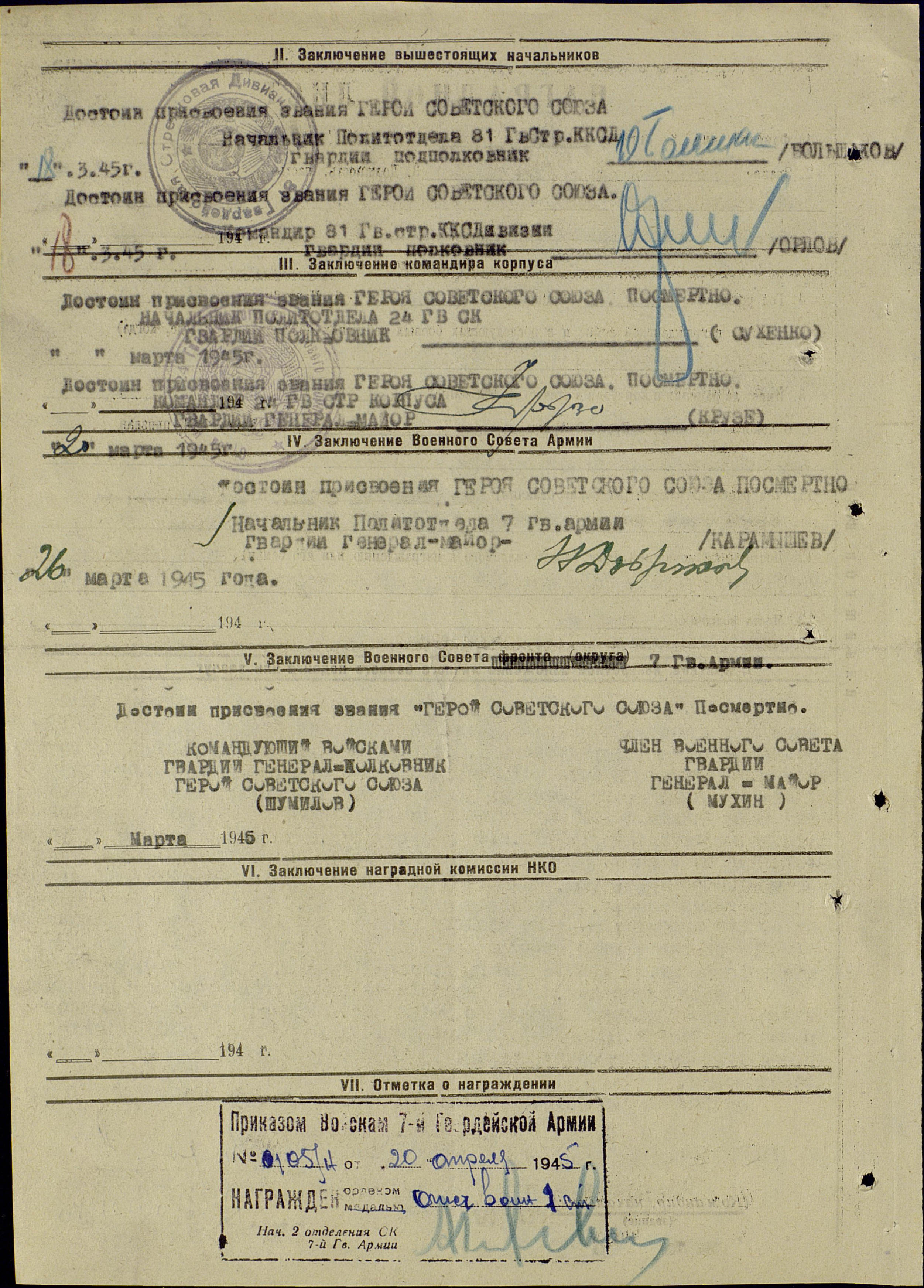 Достоин к посмертному присвоению звания "Герой Советского Союза".