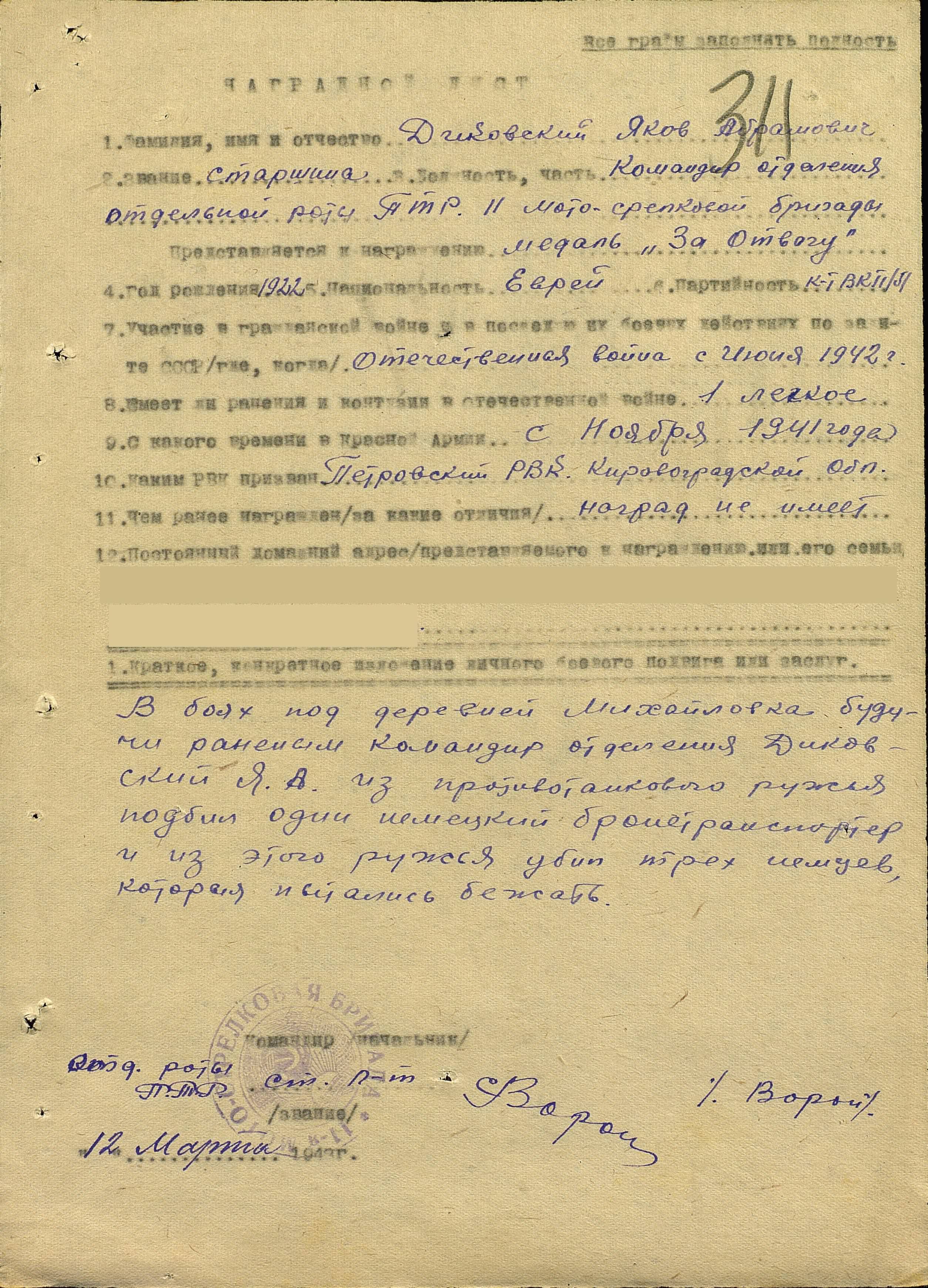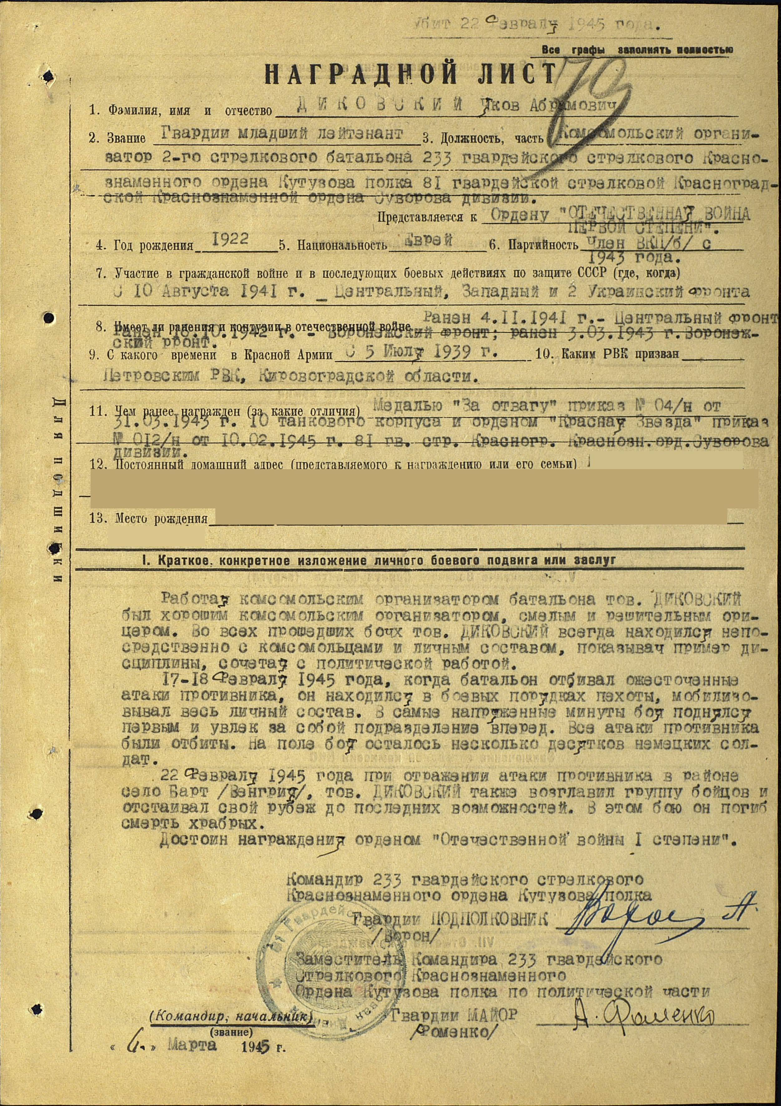 Диковский Яков Абрамович родился в 1922 году. Еврей.