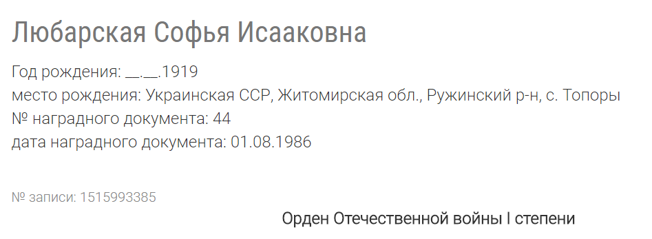 Любарская София Исааковна родилась в 1919 году в Украинской ССР, Киевской обл., Ружинский р-н, с. Топоры. Еврейка.