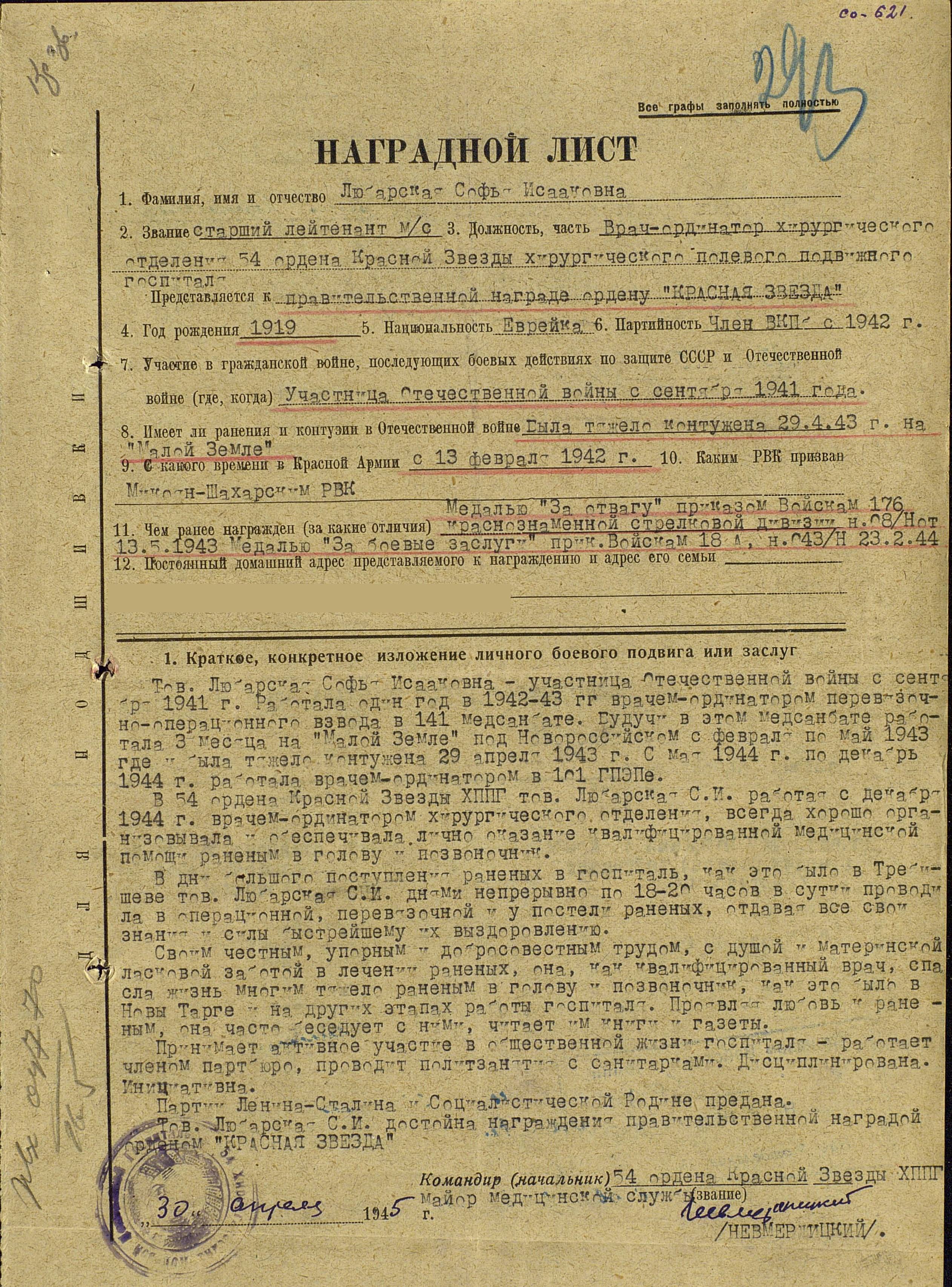 в 54 ордена Красной звезды тов. Любарская С.И работая с декабря 1944 года. врачем-ординатором хирургического отделения, всегда хорошо организовала и обеспечивала лично оказание квалифицированной медицинской помощи раненным в голову.