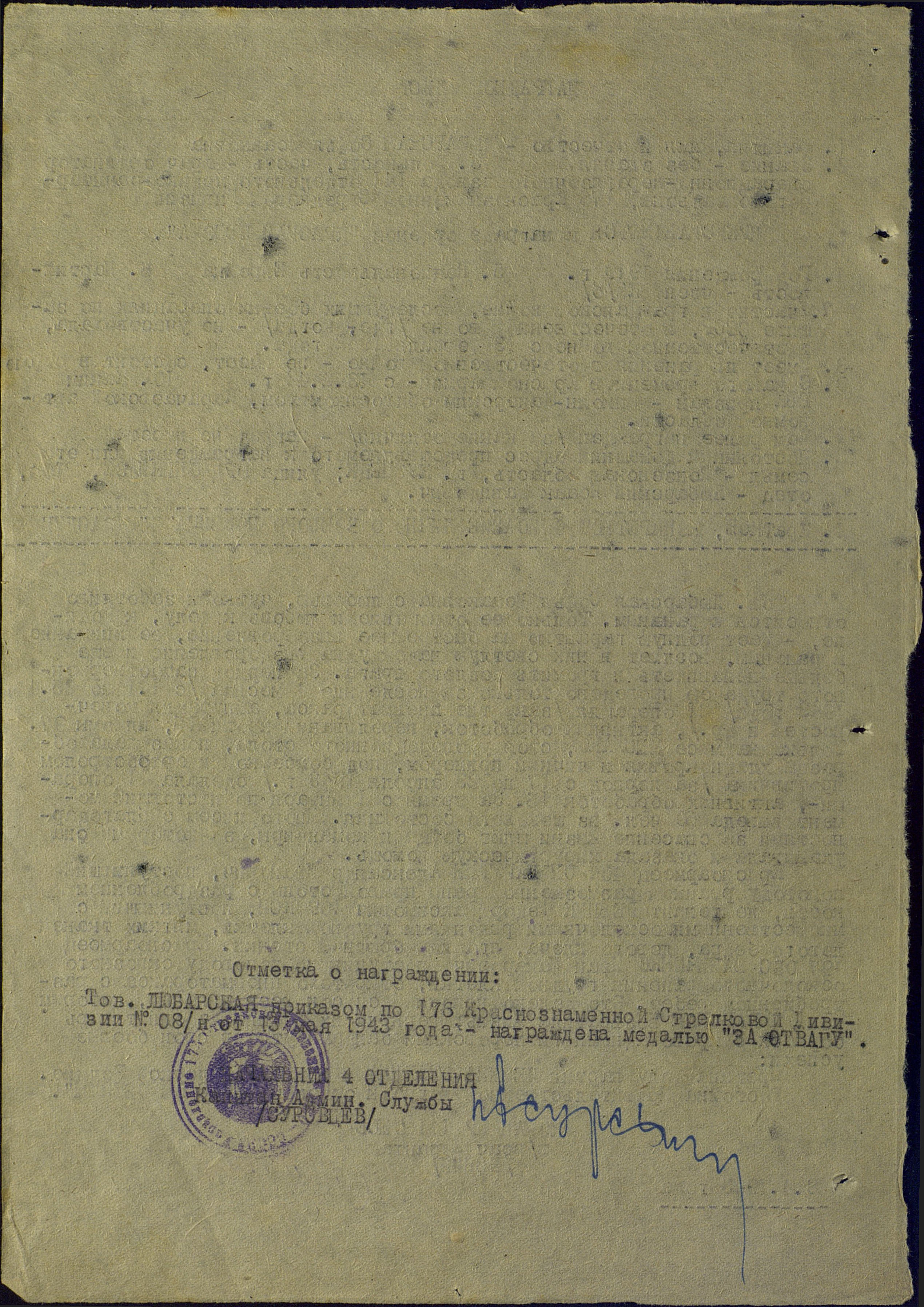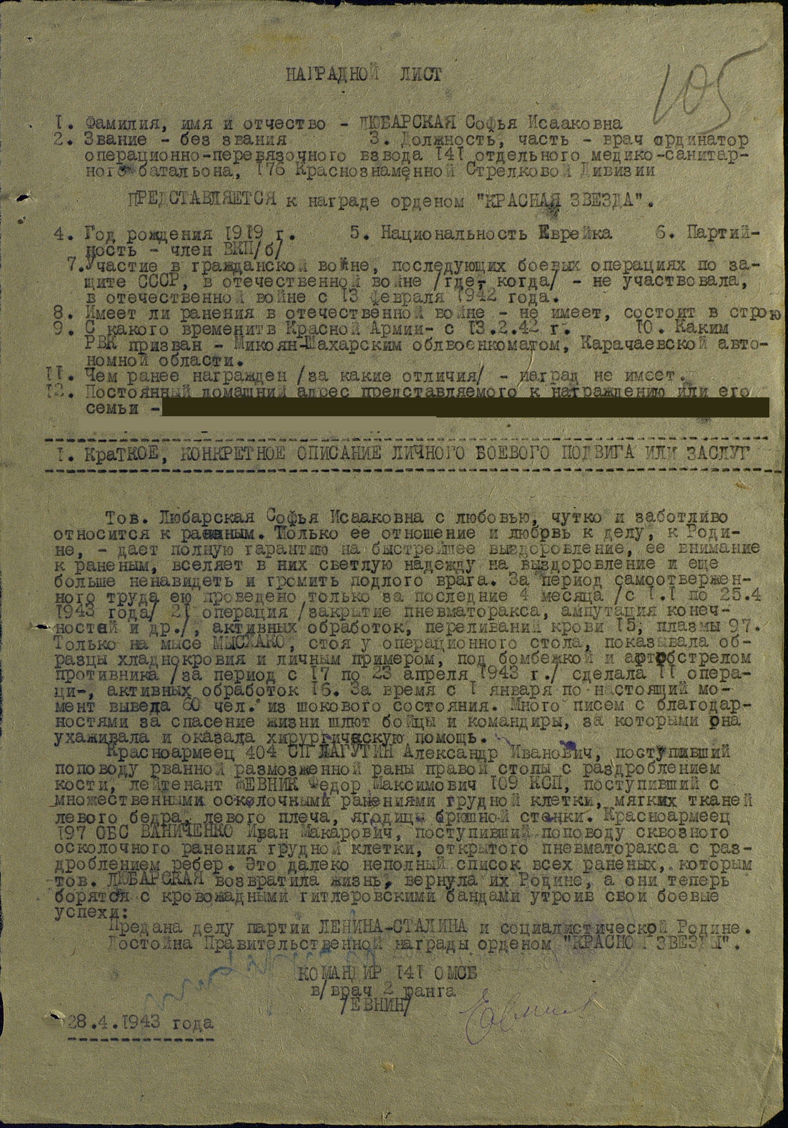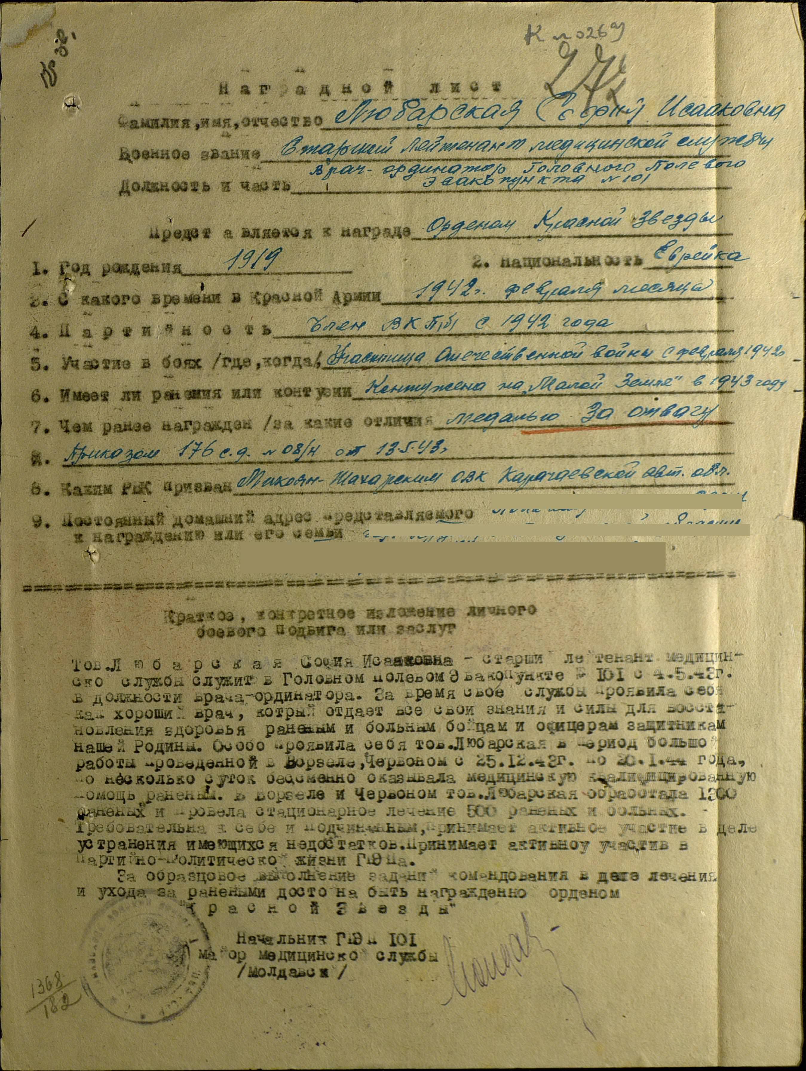 Тов. Любарская Софья Исааковна - участница Отечественной войны с сентября 1941 года. Работала один год в 1942-1943 годах врачем-ординатором перевозочно-операционного взвода в 141 медсанбате. Будучи в этом Медсанбате работала 3 месяца на Малой Земле под Новороссийском с февраля по май 1943 года где и была тяжело контужена 29 апреля 1943 года. С мая 1944 года по декабрь 1944 года работала врачем-ординатором в 101 ГПЭПе.