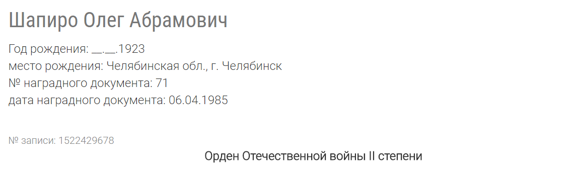 Шапиро Олег Абрамович родился в 1923 году в Челябинске. Еврей.