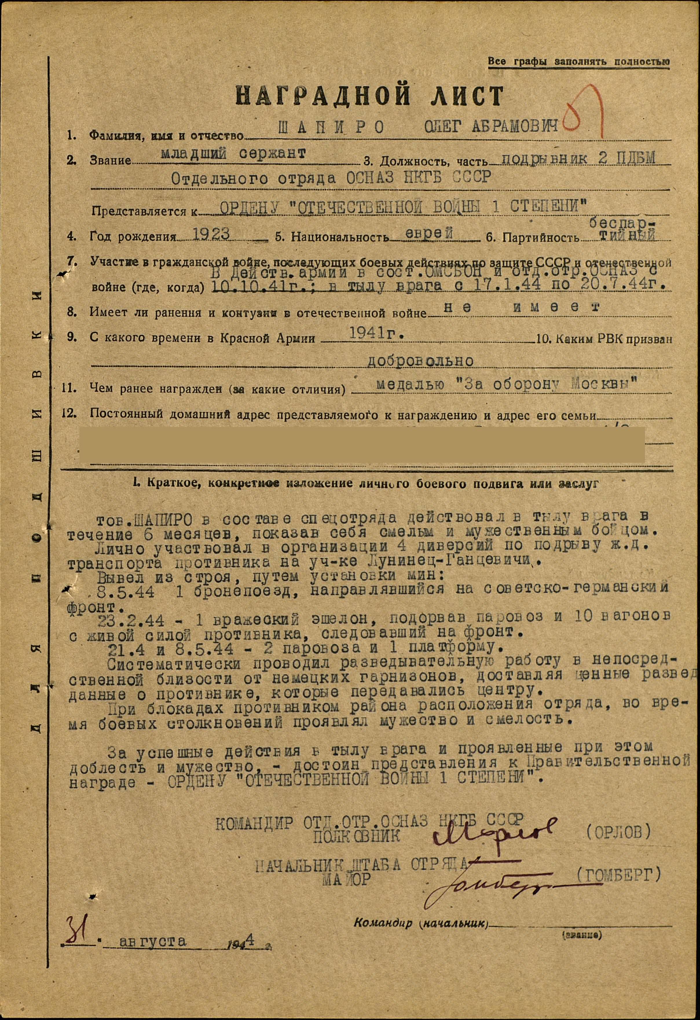 Тов. Шапиро в составе спецотряда действовал в тылу врага в течение 6 месяцев, показав себя смелым и мужественным бойцом.
