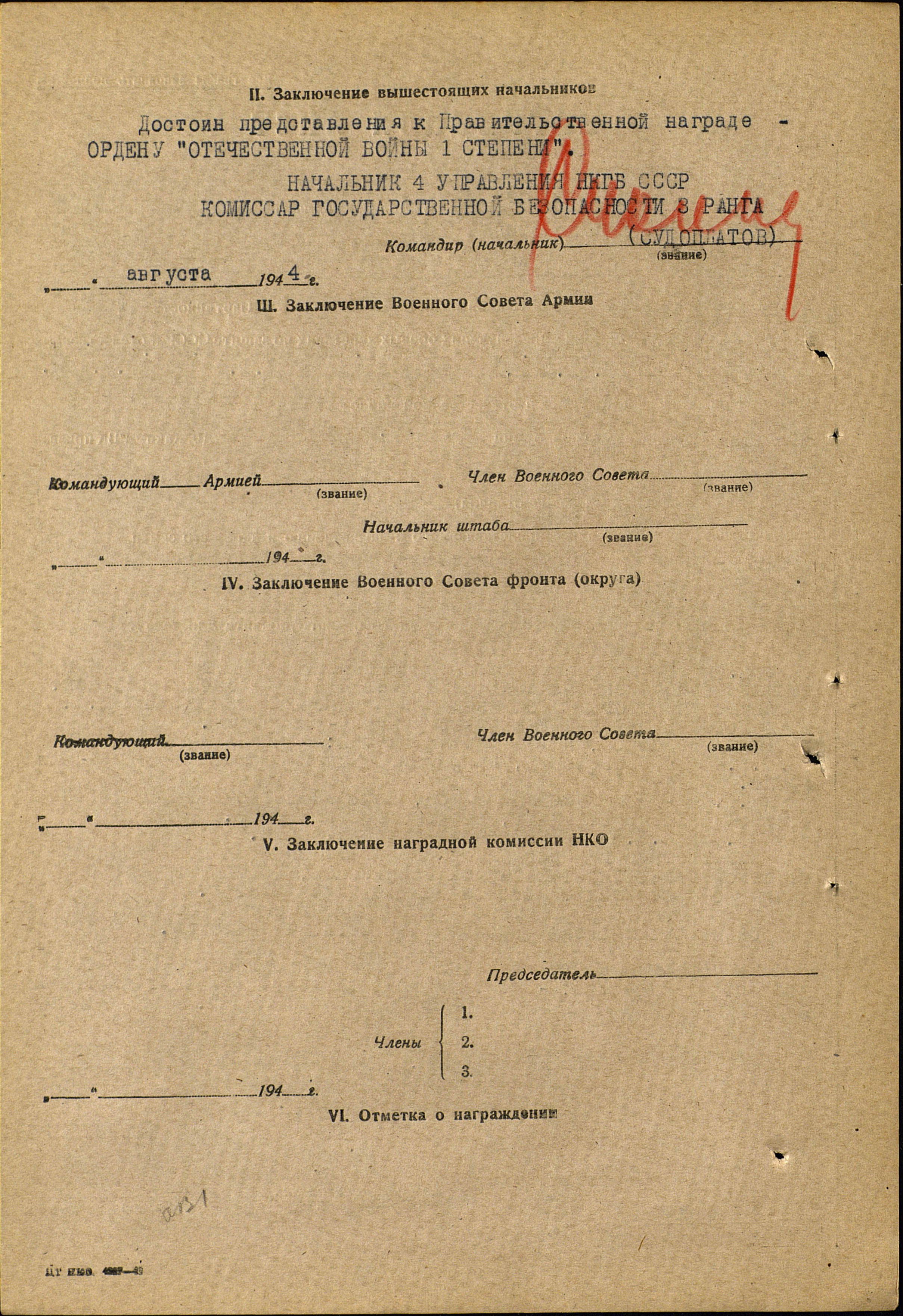 За успешные действия в тылу врага и проявленные при этом доблесть и мужество - достоин представления к Правительственной награде - Ордену "Отечественной войны 1-й степени".
