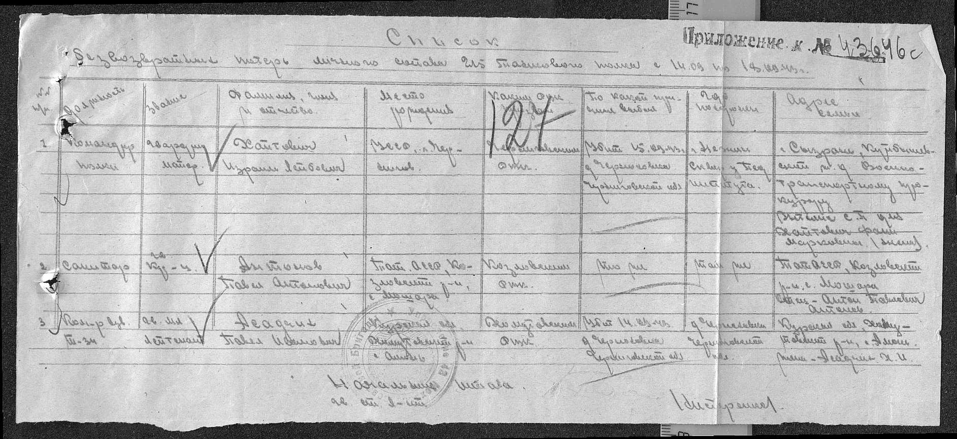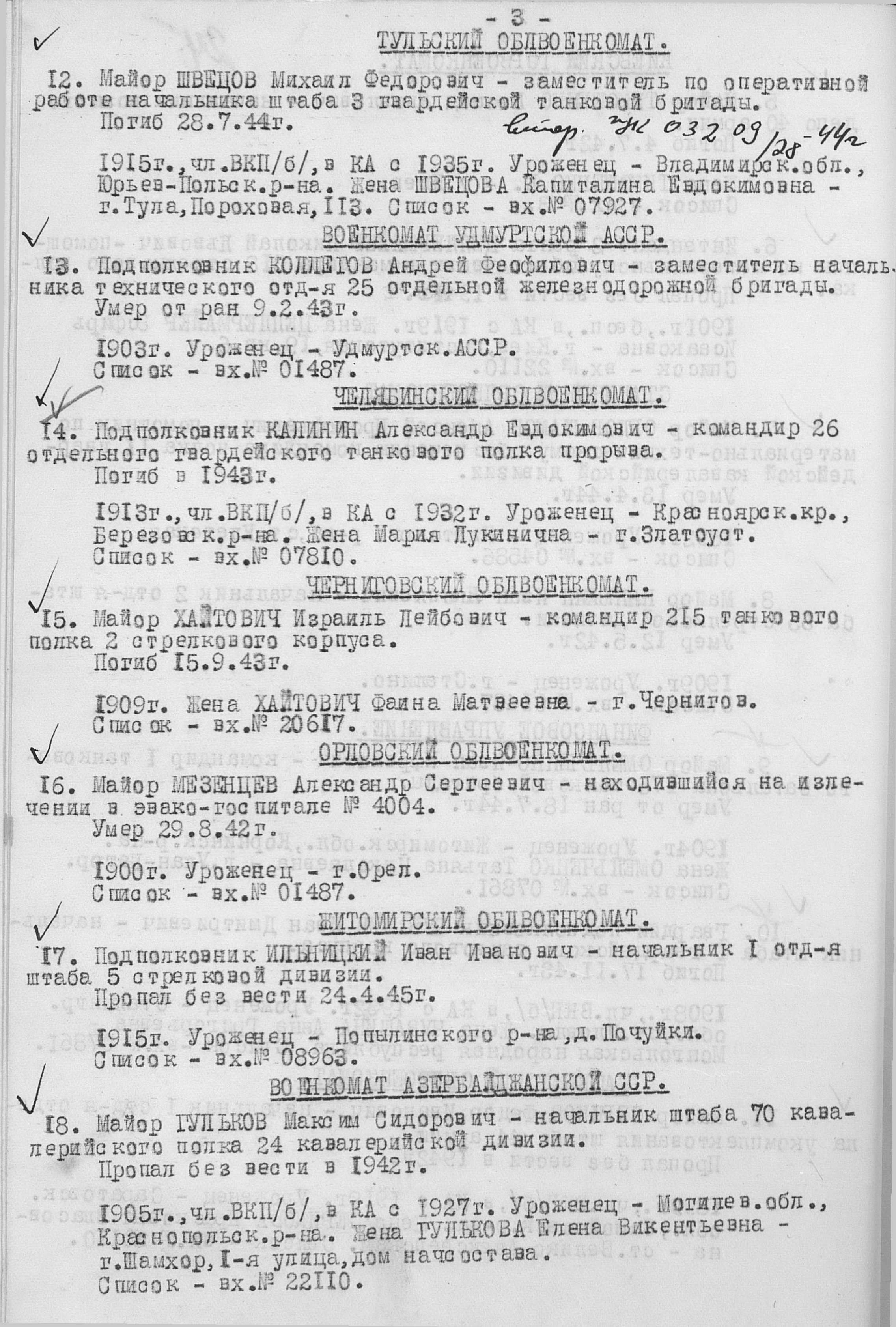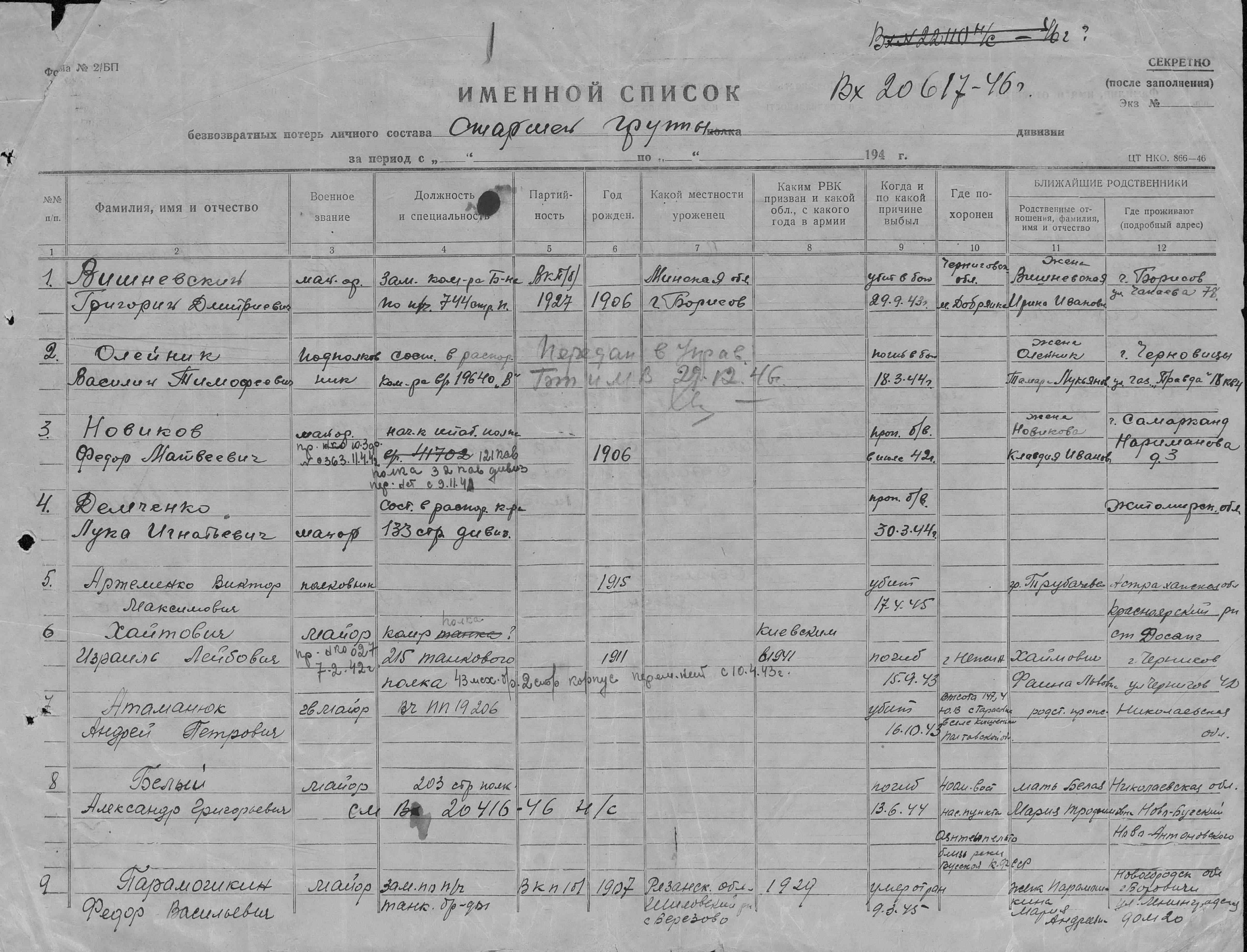 - Черниговский ГВК, Украинская ССР, Черниговская обл., г. Чернигов; __.__.1941 Киевский РВК; Усть-Калманский РВК, Алтайский край, Усть-Калманский р-н