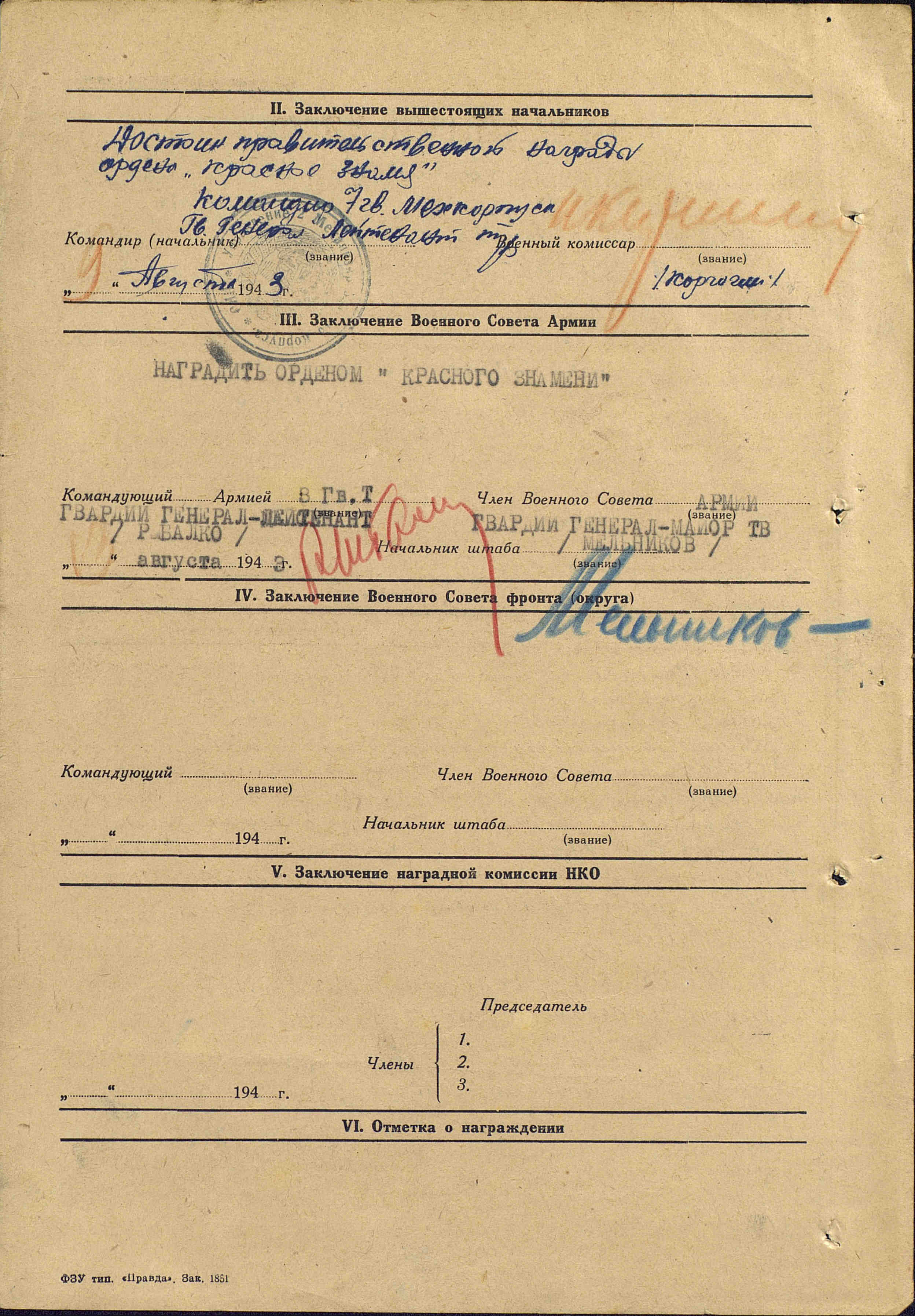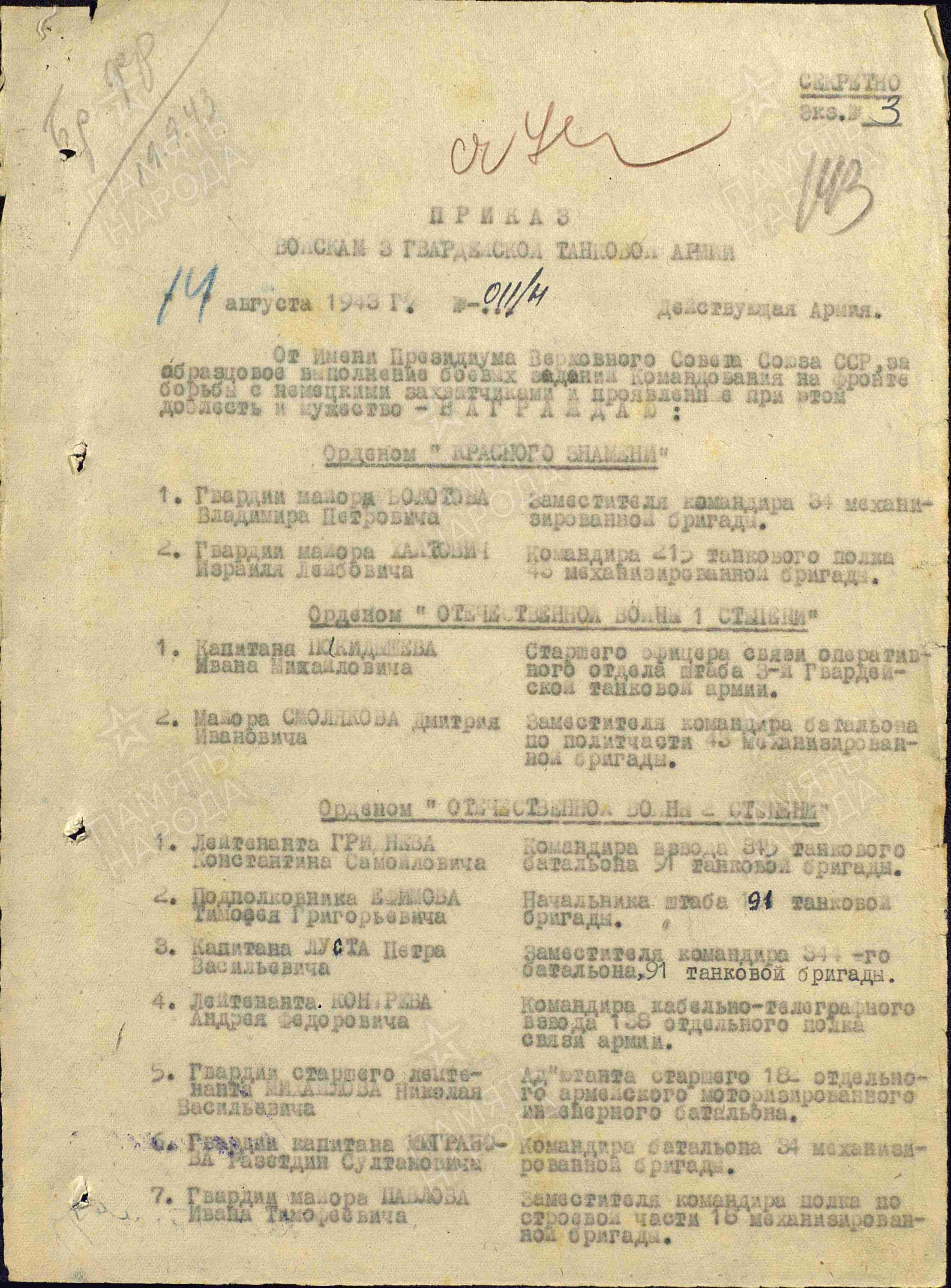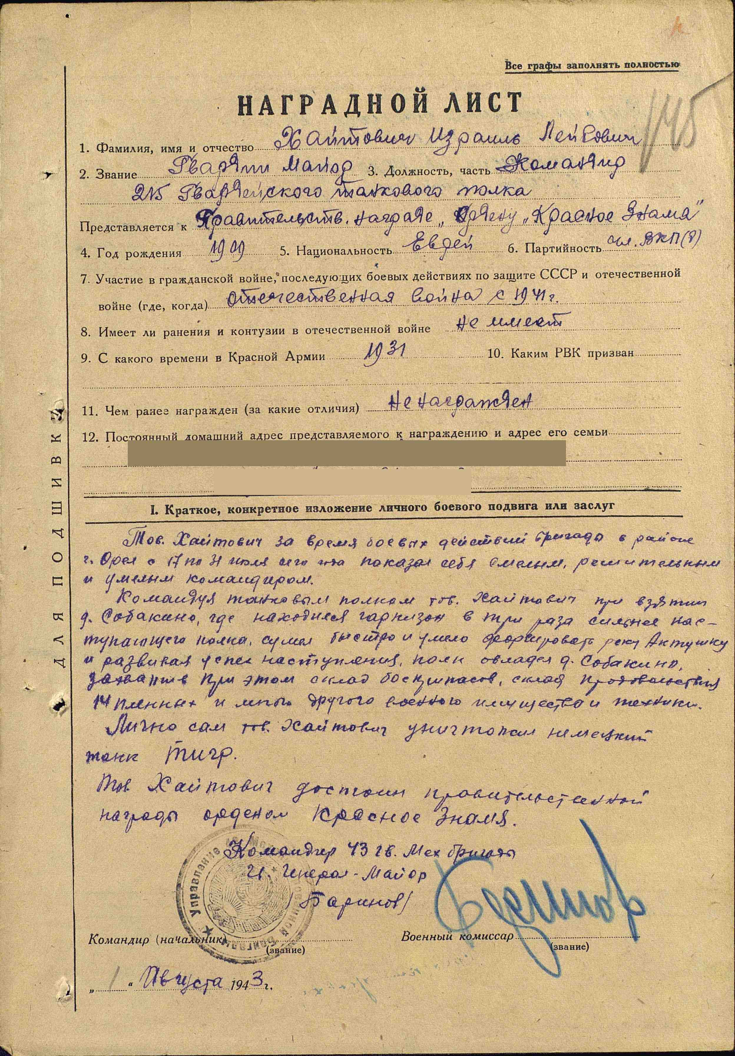 Командуя танковым полком тов. Хайтович при взятии д. Собакино, где находился гарнизон в три раза сильнее наступающего полка сумел быстро и умело форсировать реку Актушку и развивая успех наступления полк овладел д. Собакино. Захватив при этом склад боеприпасов, склад продовольствия, 14 пленных и много другого военного имущества и техники. Лично сам тов. Хайтович уничтожил немецкий танк Тигр. Тов. Хайтович достоин правительственной награды ордена "Красное Знамя". Командир 43 механизированной бригады Гвардии генерал - майор БАРИНОВ. 1 августа 1943.