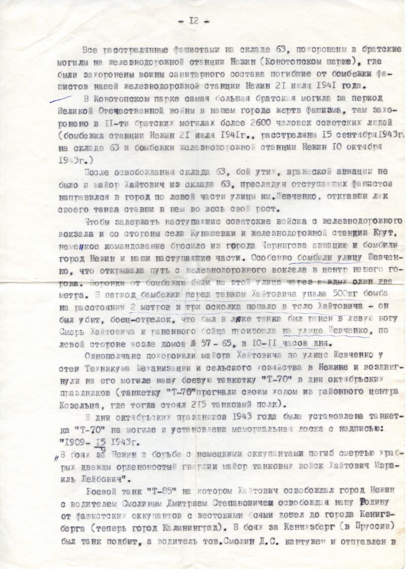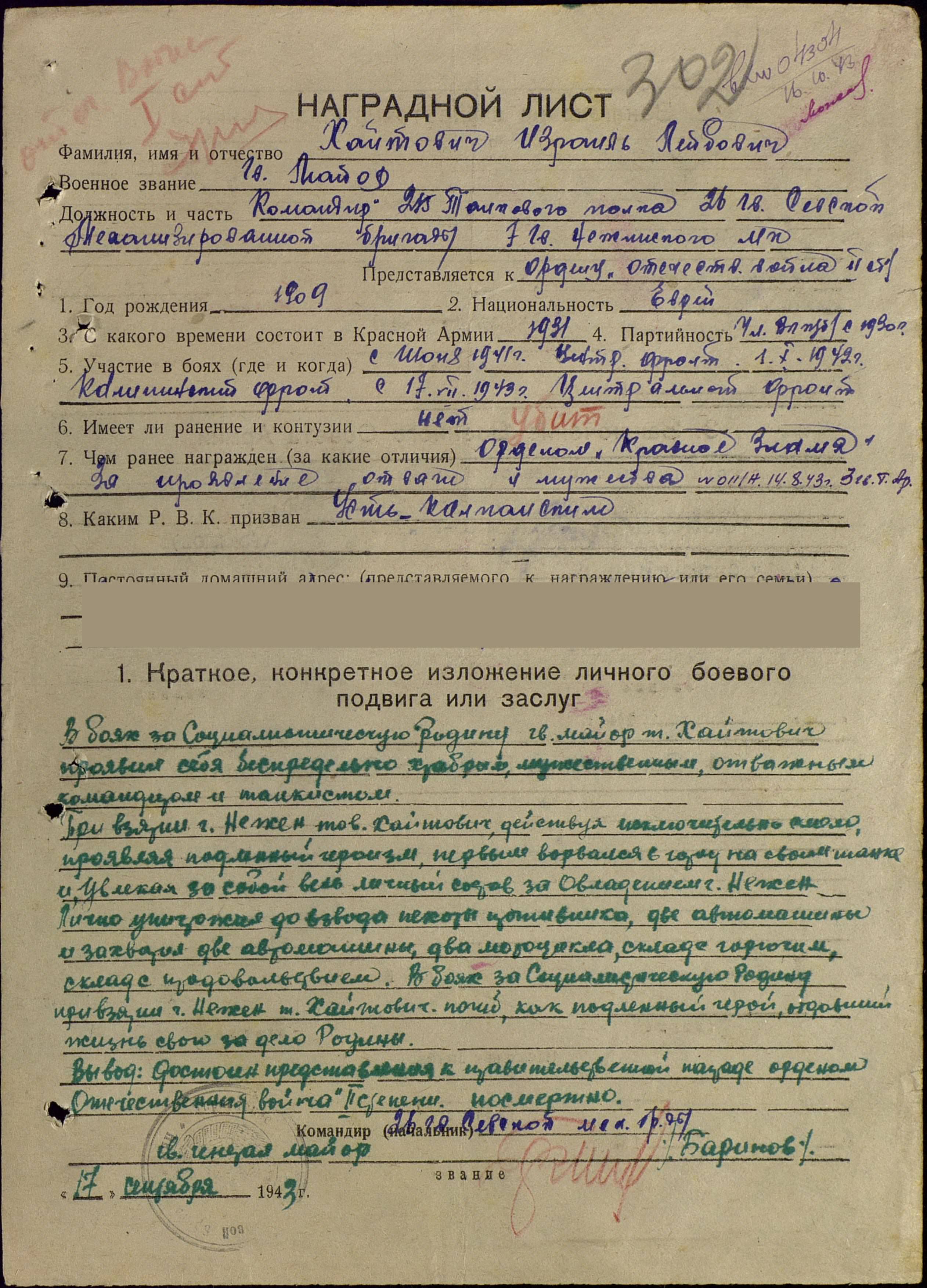 "В боях за Социалистическую Родину гв. майор т. Хайтович проявил себя беспредельно храбрым, мужественным, отважным командиром и танкистом. При взятии г. Нежен, тов. Хайтович, действуя исключительно смело, проявляя подлинный героизм первым ворвался в горку на своем танке и увлекая за собой весь личный состав за овладением г. Нежен лично уничтожил до взвода пехоты противника, две автомашины и захватил две автомашины, два мотоцикла, склад с горючим, склад с продовольствием. В боях за Социалистическую Родину при взятии г. Нежен т. Хайтович погиб, как подлинный герой отдавший жизнь свою за дело Родины. Вывод: Достоин представления к правительственной награде ордену "Отечественная война" 2 степени - посмертно. Командир 43 механизированной бригады Гвардии генерал - майор БАРИНОВ. 7 сентября 1943 года.