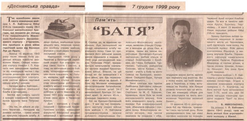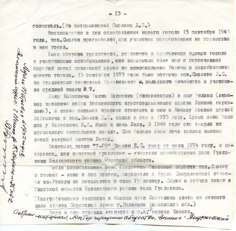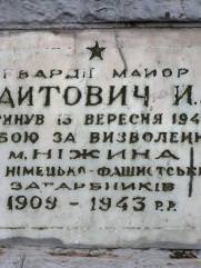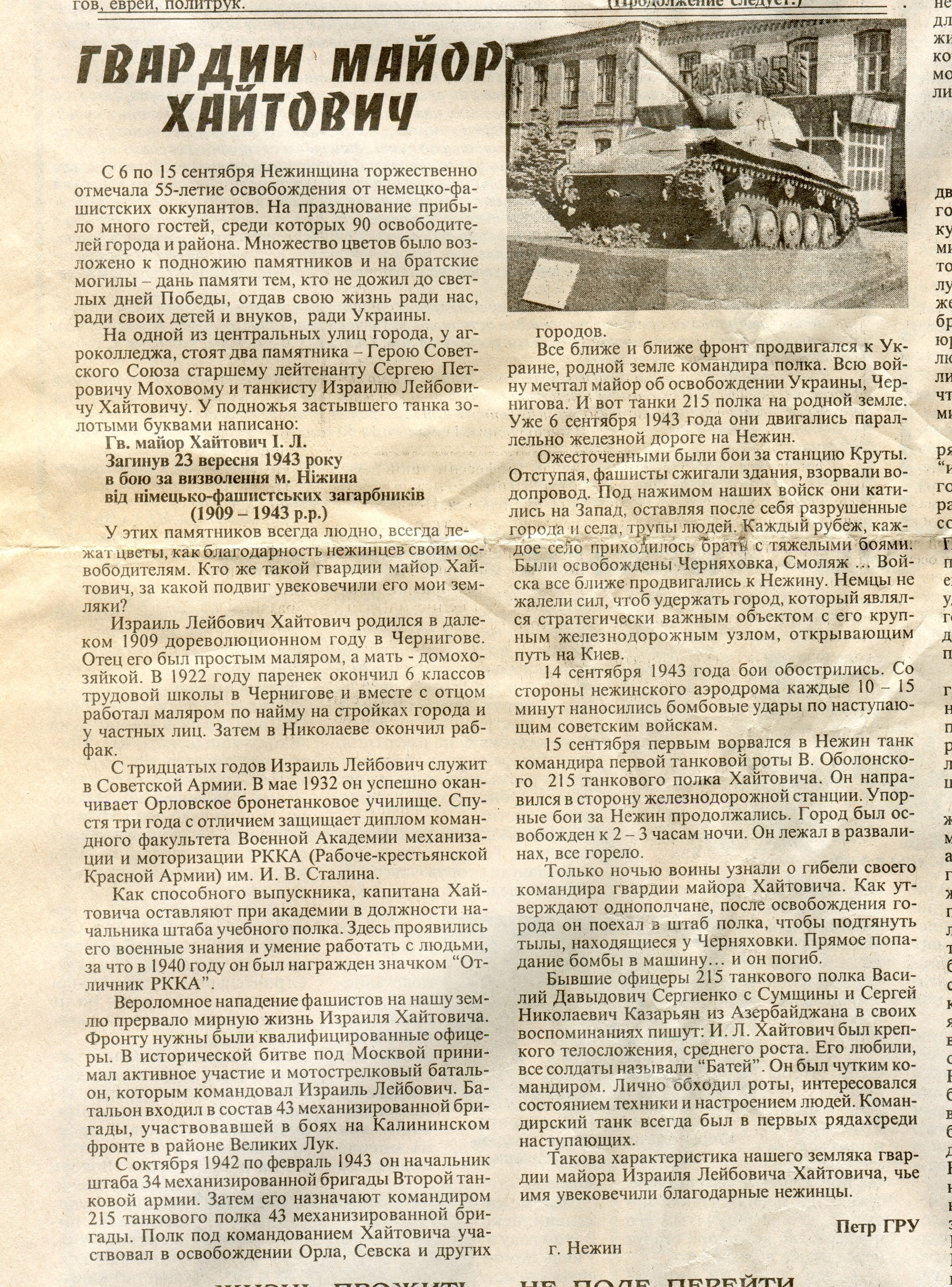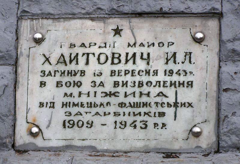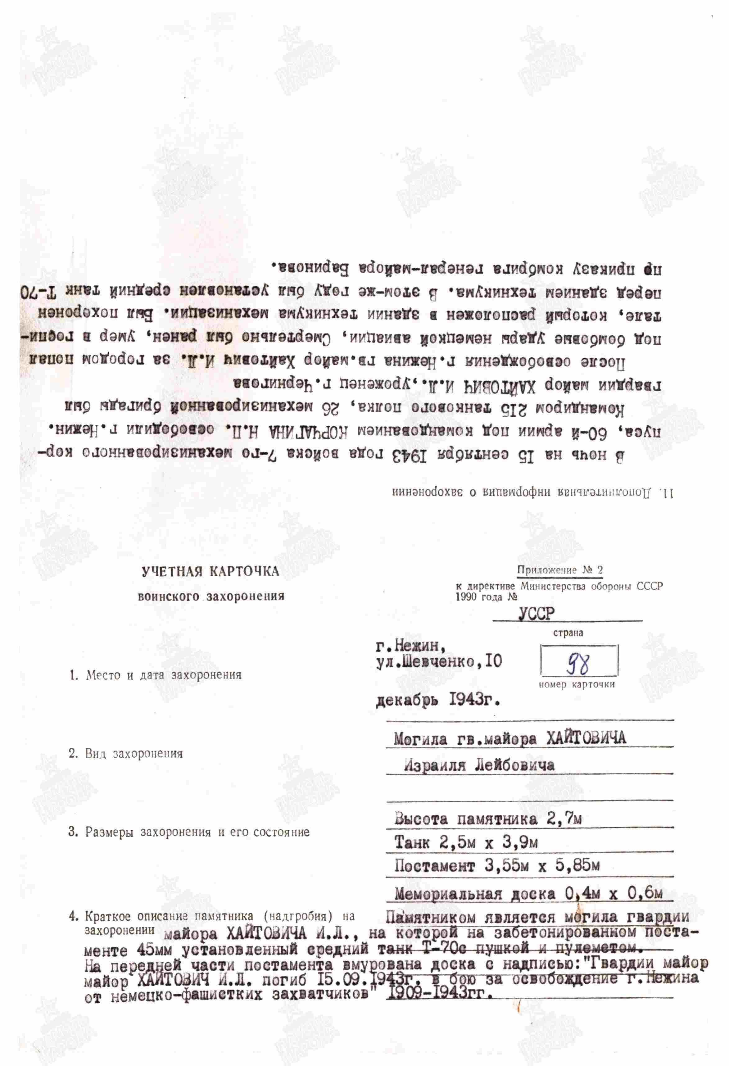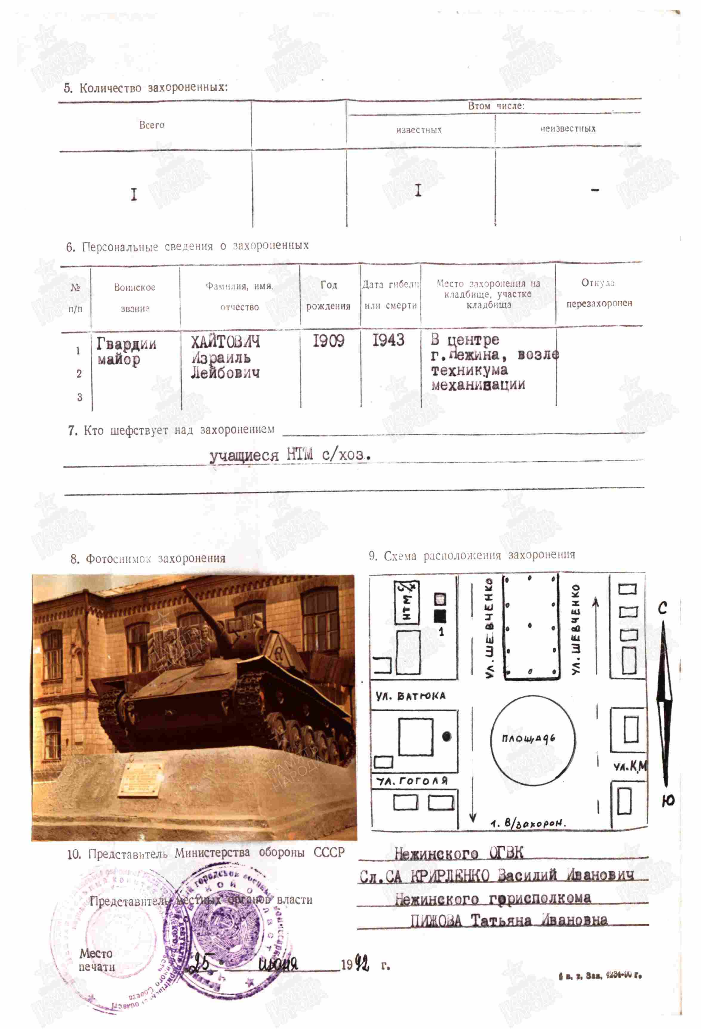 Примечание: Гвардии майор ХАЙТОВИЧ ИЗРАИЛЬ ЛЕЙБОВИЧ погиб 15.09.1943 года. Захоронен (в настоящее время): Украина, Черниговская область, Нежинский район, г. Нежин, ул. Шевченко, дом 10, индивидуальная могила у техникума механизации.