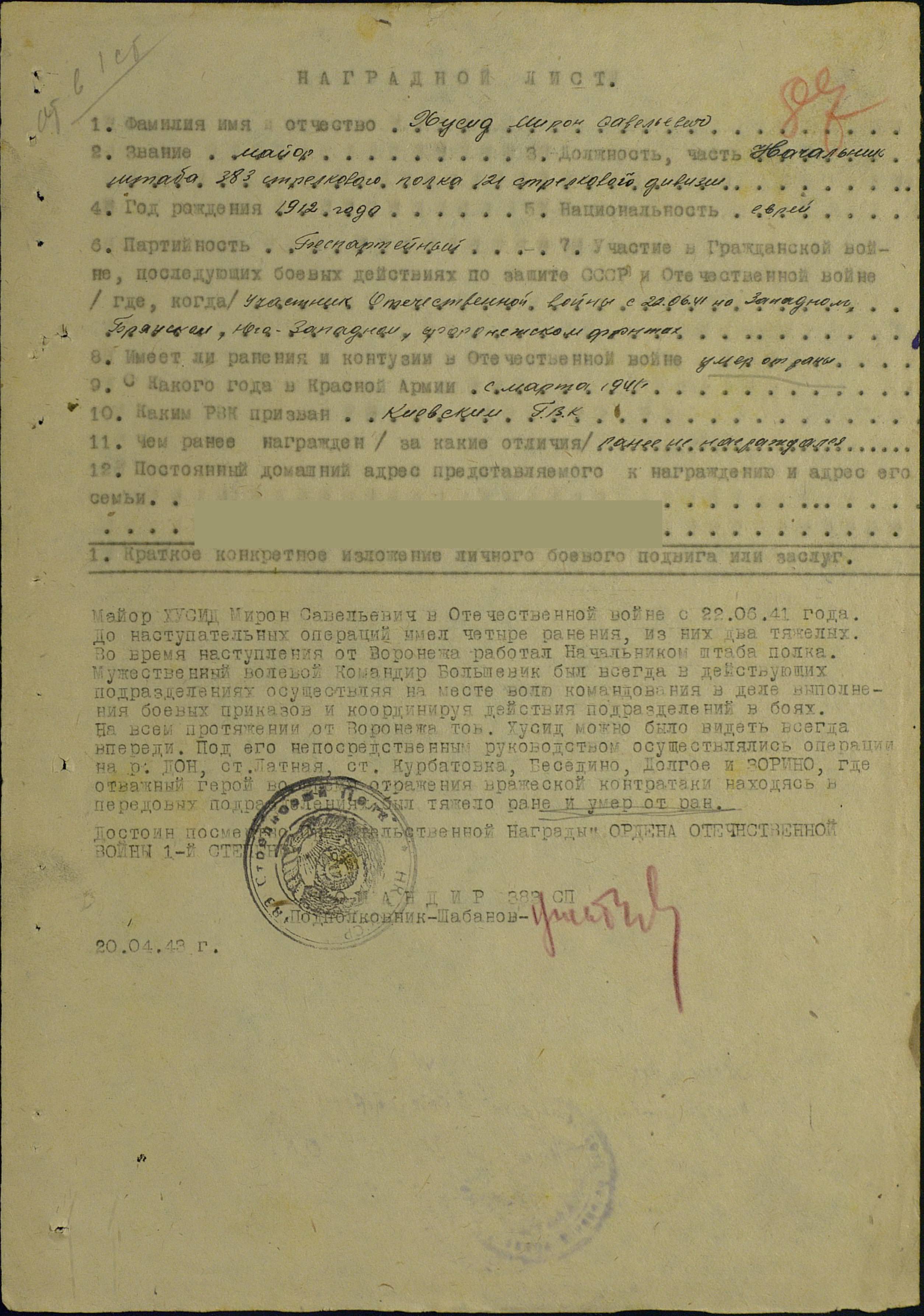 Майор Хусид Мирон Савельевич в Отечественной войне с 22.06.1941 года. До наступательных операций от Воронежа работал начальником штаба полка. Мужественный волевой Командир Большевик был всегда в действующих подразделениях осуществляя на месте волю командования в деле выполнения боевых приказов и координируя действия подразделений в боях. На всем протяжении от Воронежа тов. Хусид можно было видеть всегда впереди. Под его непосредственным руководством осуществлялись операции на р. Дон, ст. Латная, ст. Курбатовка, Беседино, Долгое и Зорино, где отважный герой во время отражения вражеской контратаки находясь в передовых подразделениях был тяжело ранен и умер от ран.