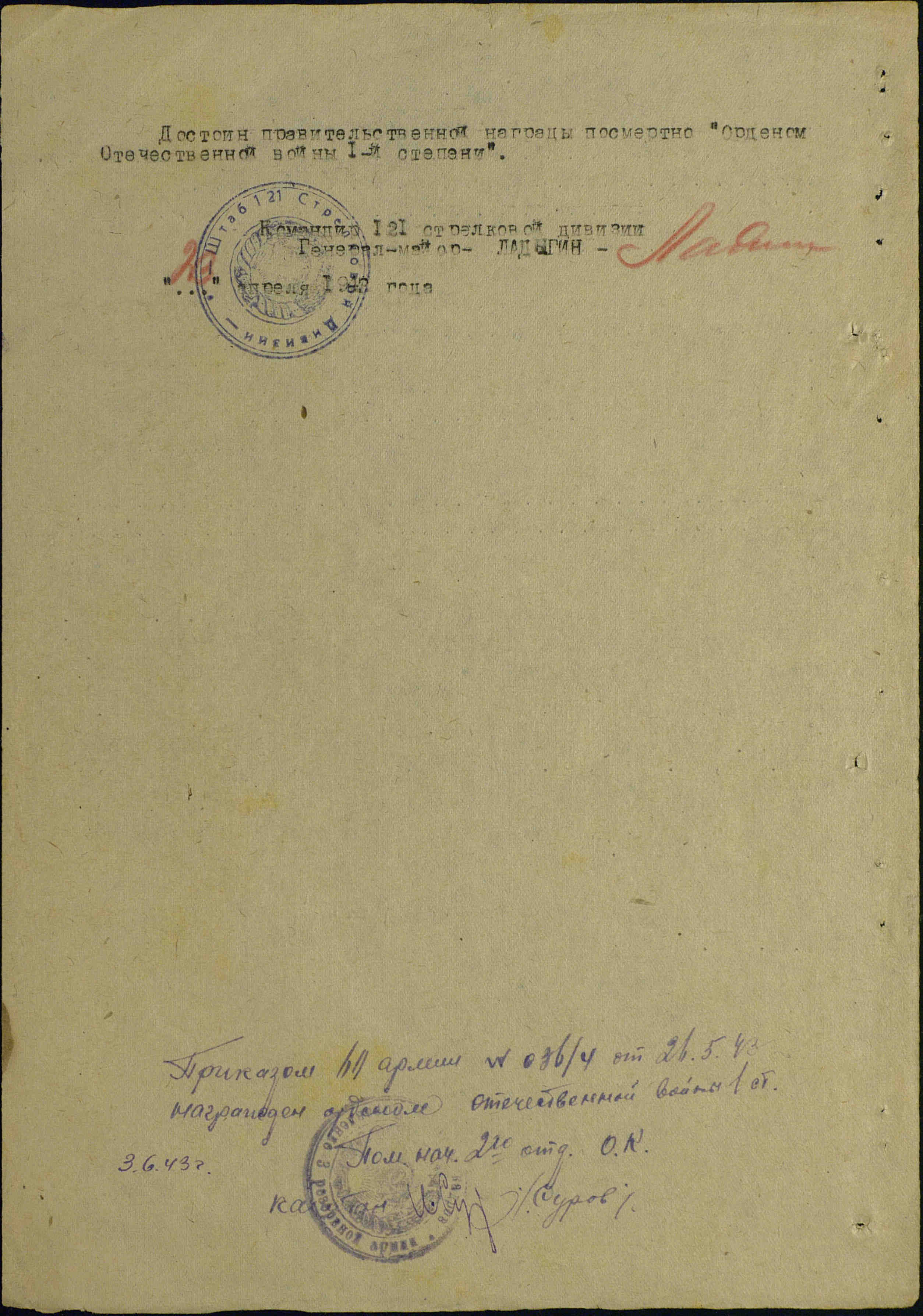 Достоин посмертно правительственной награды Ордена Отечественной войны 1 степени.