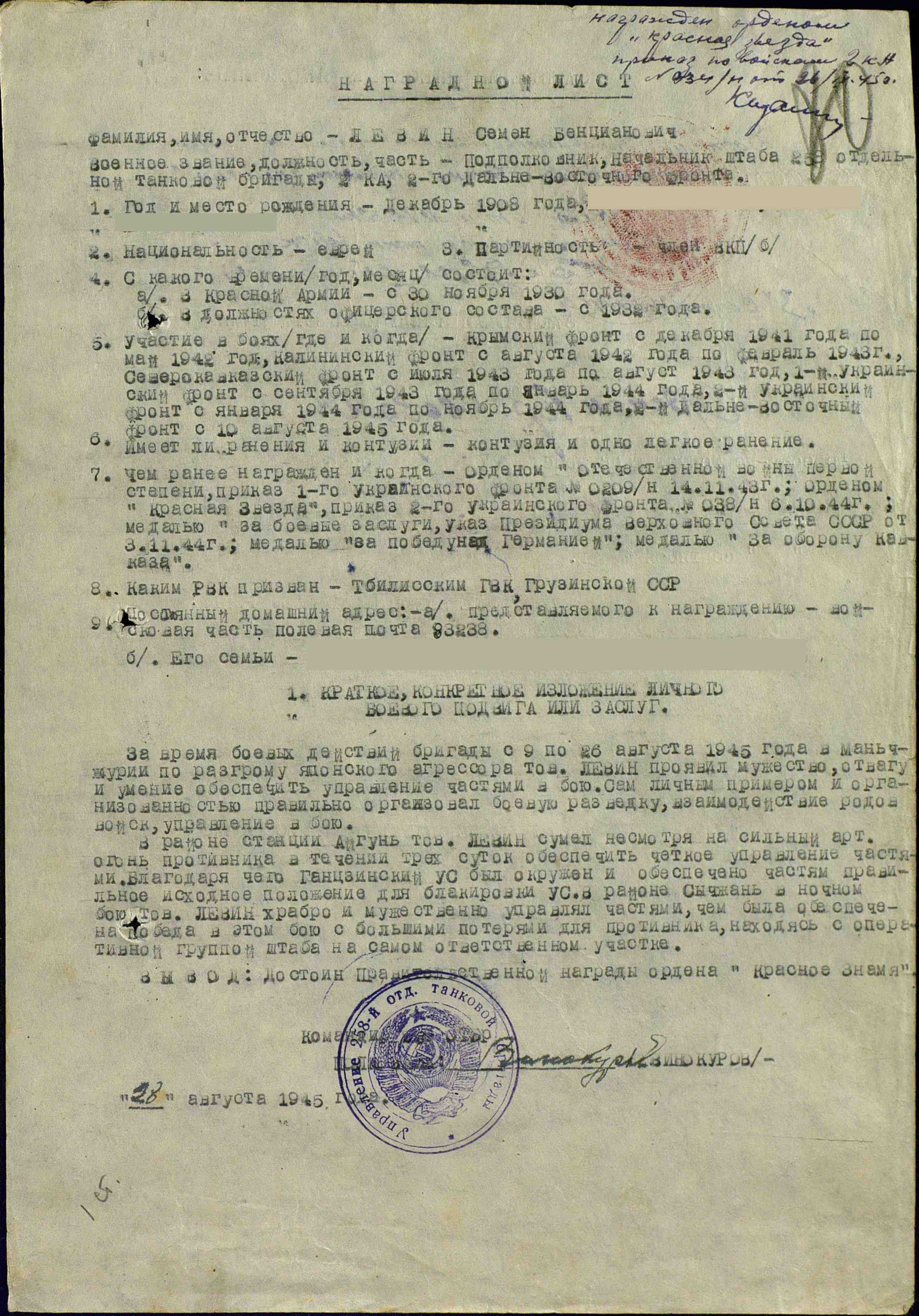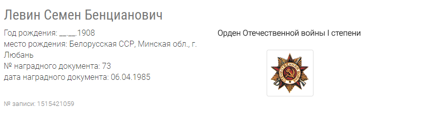 Левин Семен Бенцианович родился в 1908 году в Минской Губернии в городе Любань. Еврей.