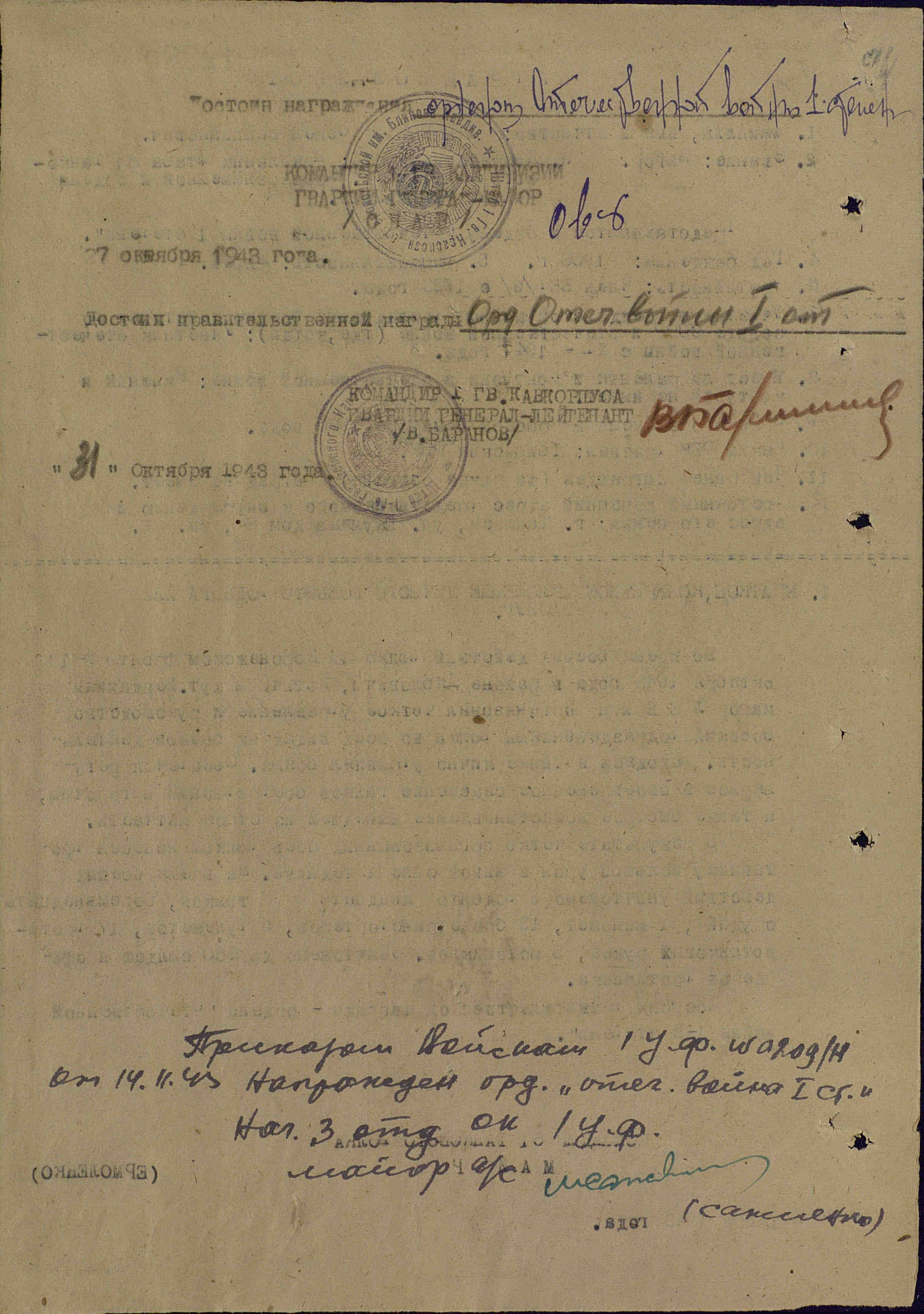 два ордена Отечественной войны 1-й степени, три ордена Красной Звезды, медаль "За Боевые Заслуги", медаль "За оборону Кавказа", медаль "За оборону Сталинграда" и др.медали.